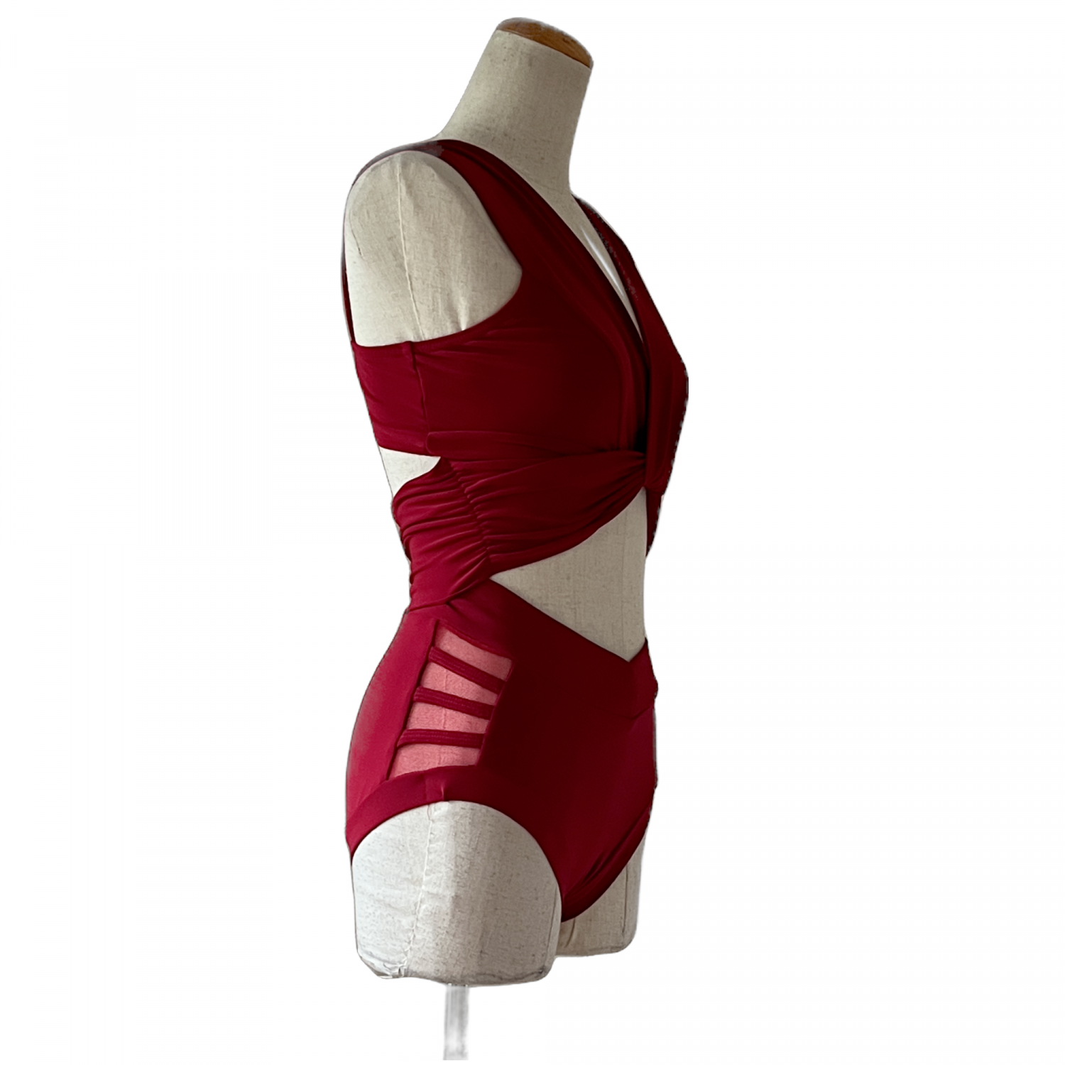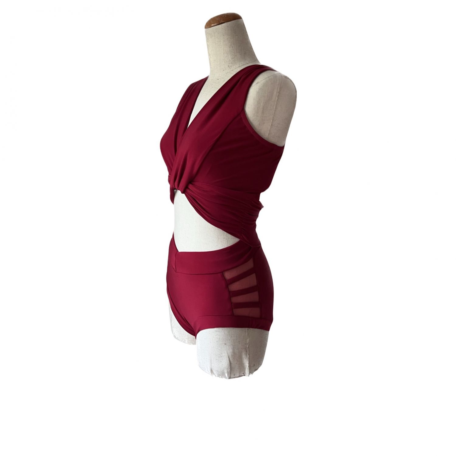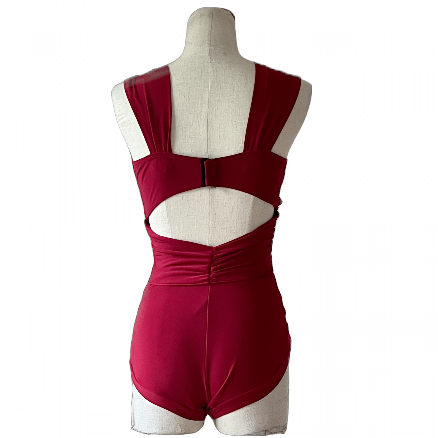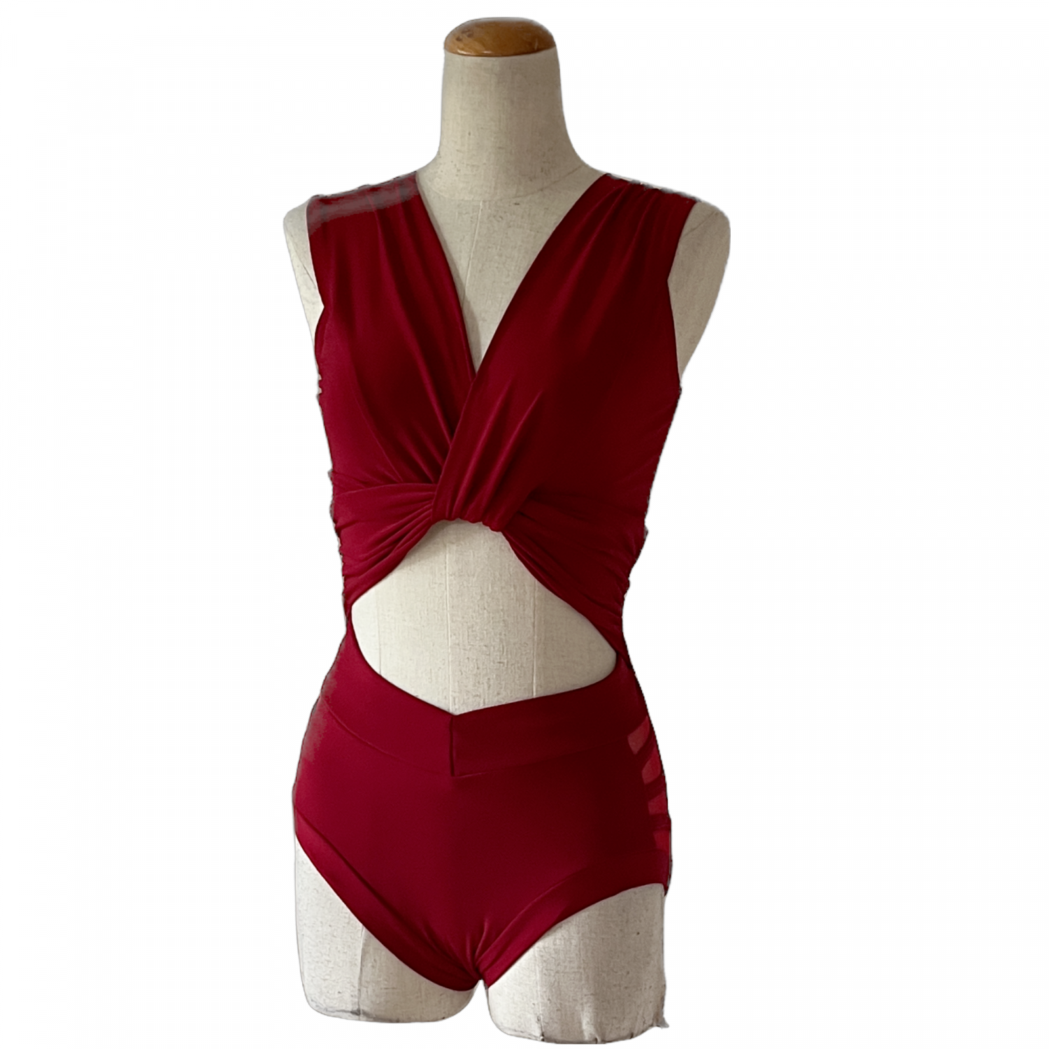 Striking deep red design by Effie Mathews with a twisted front, waist cut-out, and flattering high-waist fit. Fully lined for comfort and support—perfect for contemporary or lyrical performances.