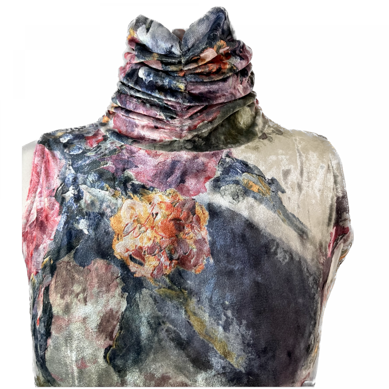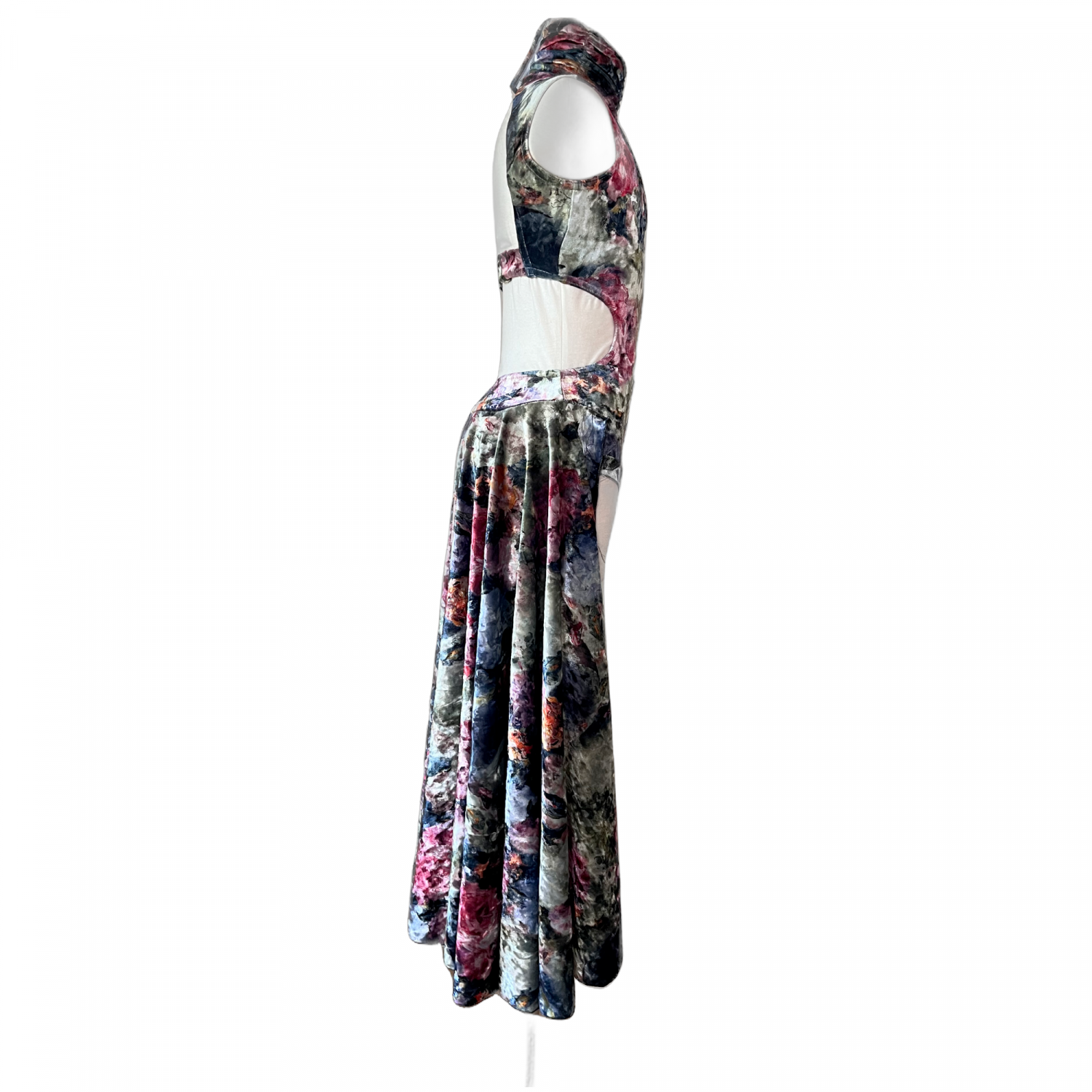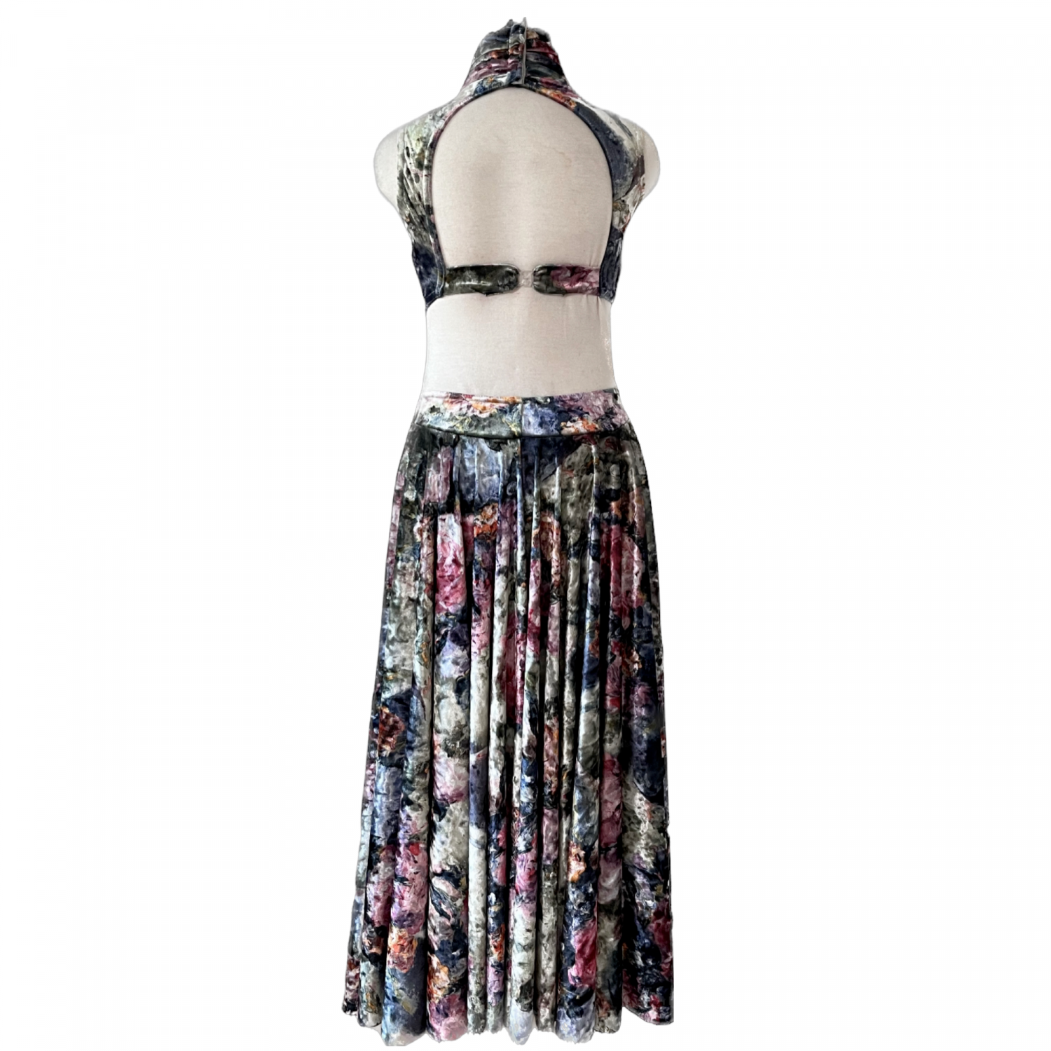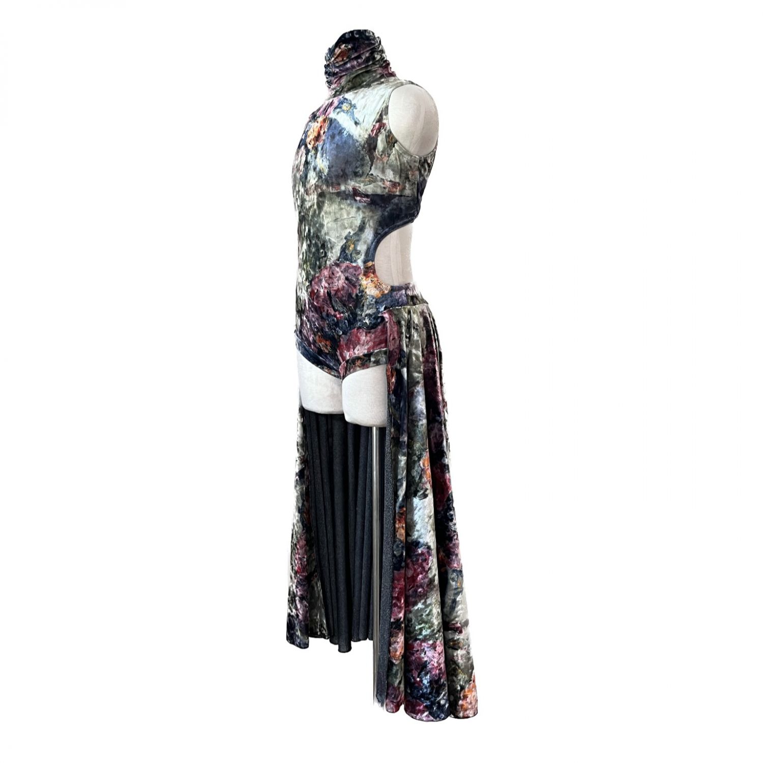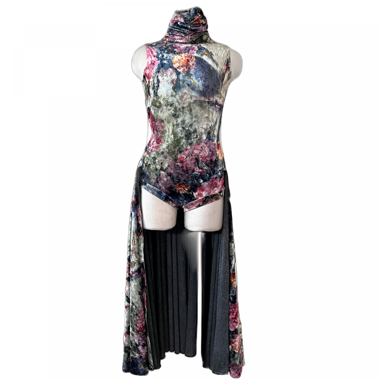 Fully lined custom bodysuit with open back, high neck, and long attached skirt