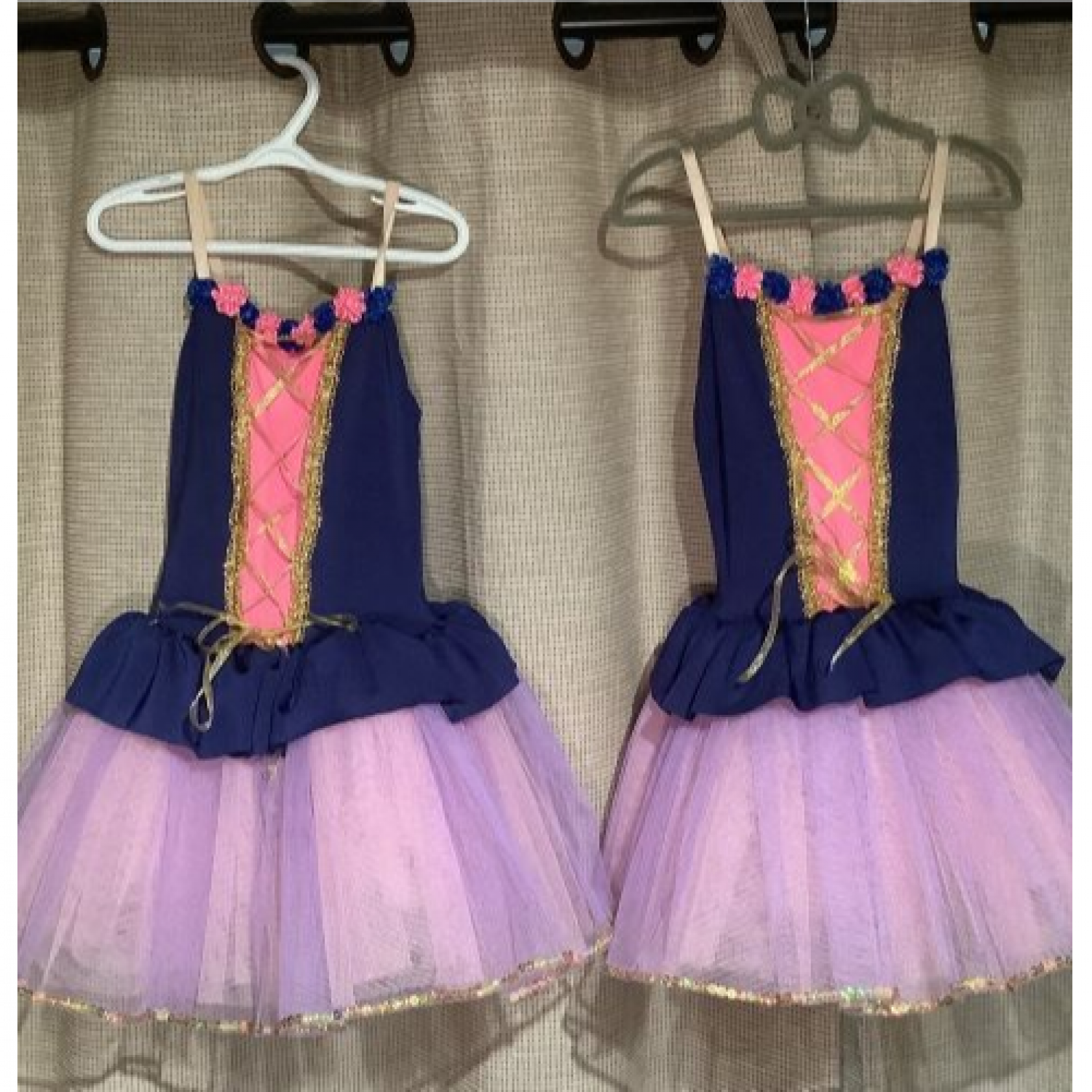 Purple-pink ballet costume with attached tulle skirt, flowers and gold lacing.