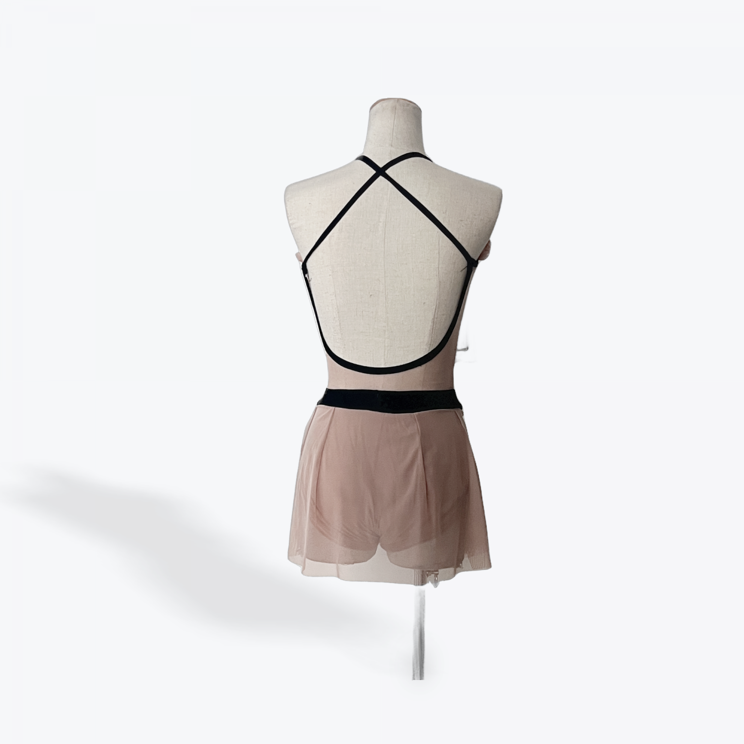 Soft and striking, this blush-toned lyrical costume features delicate mesh ruffles, bold black contour lines, and a flirty skirt overlay. The open criss-cross back adds elegance, while the structured bodice keeps the silhouette sleek and flattering. Ideal for lyrical, contemporary, or character solos. Gently used and full of graceful potential.