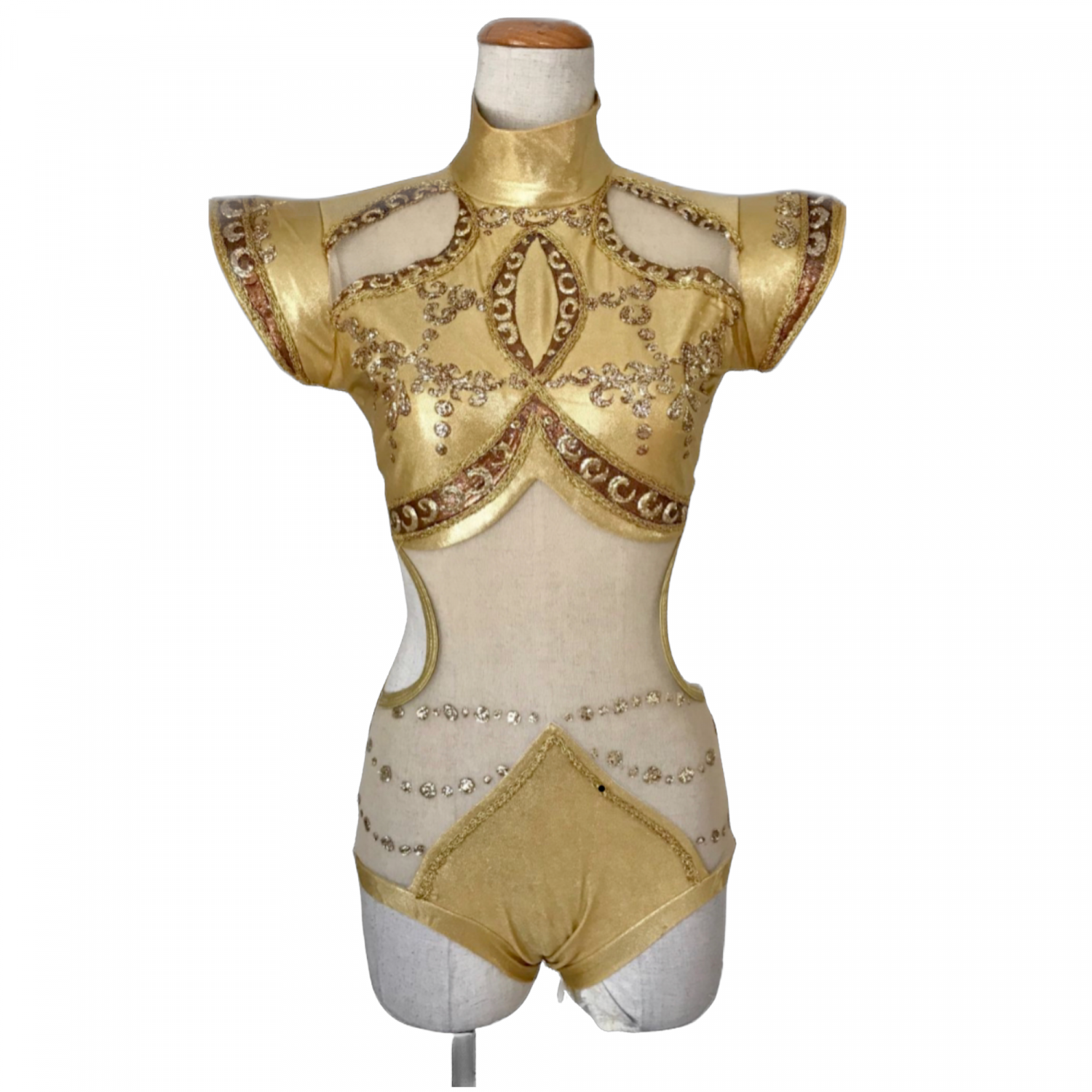 Gold lame bodysuit with high neck and cap sleeves, snap closure at neck