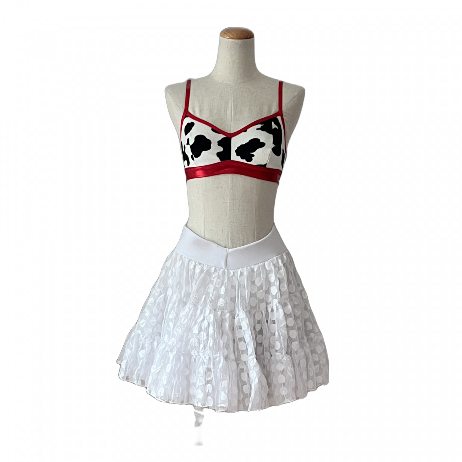 Fully lined cow print half top with red piping