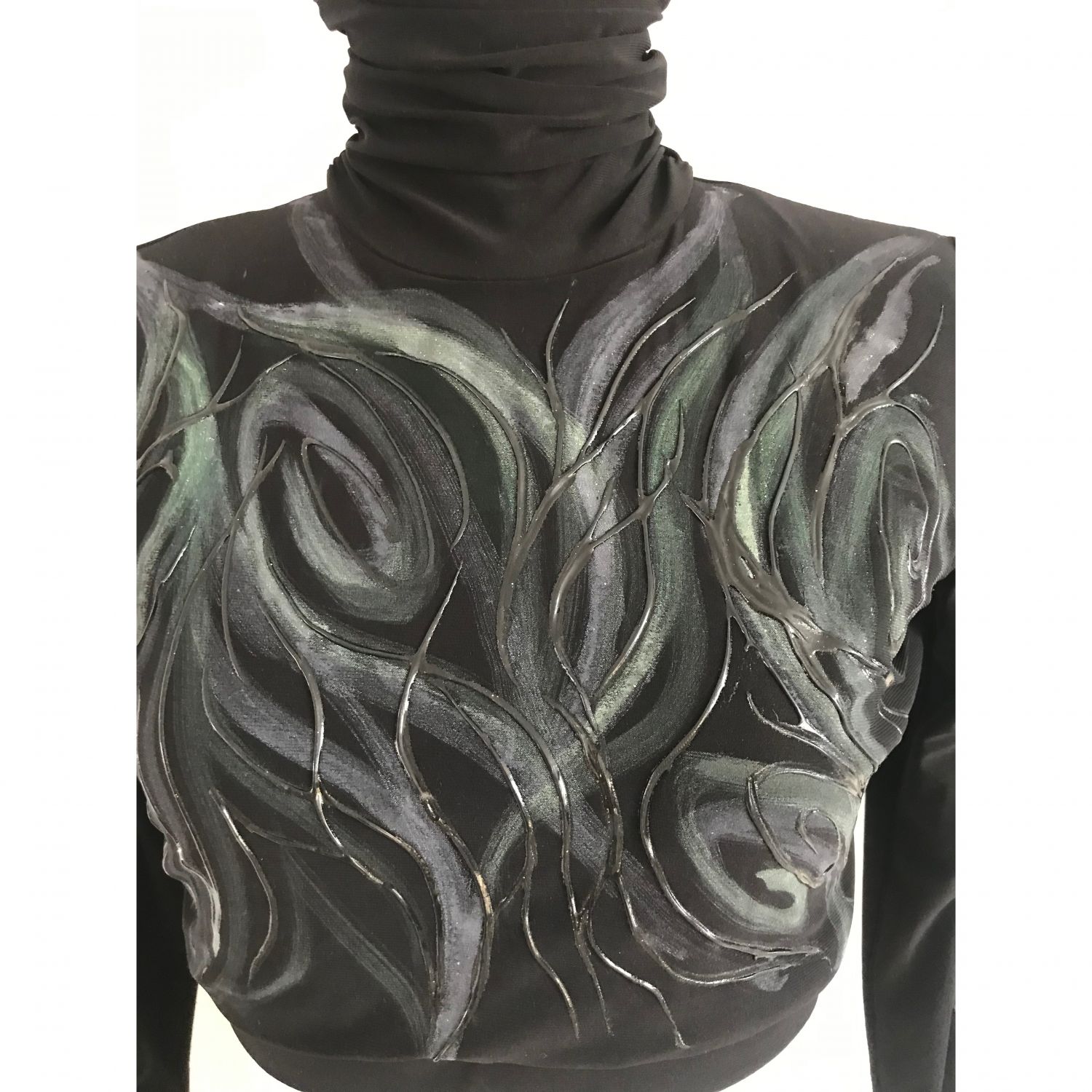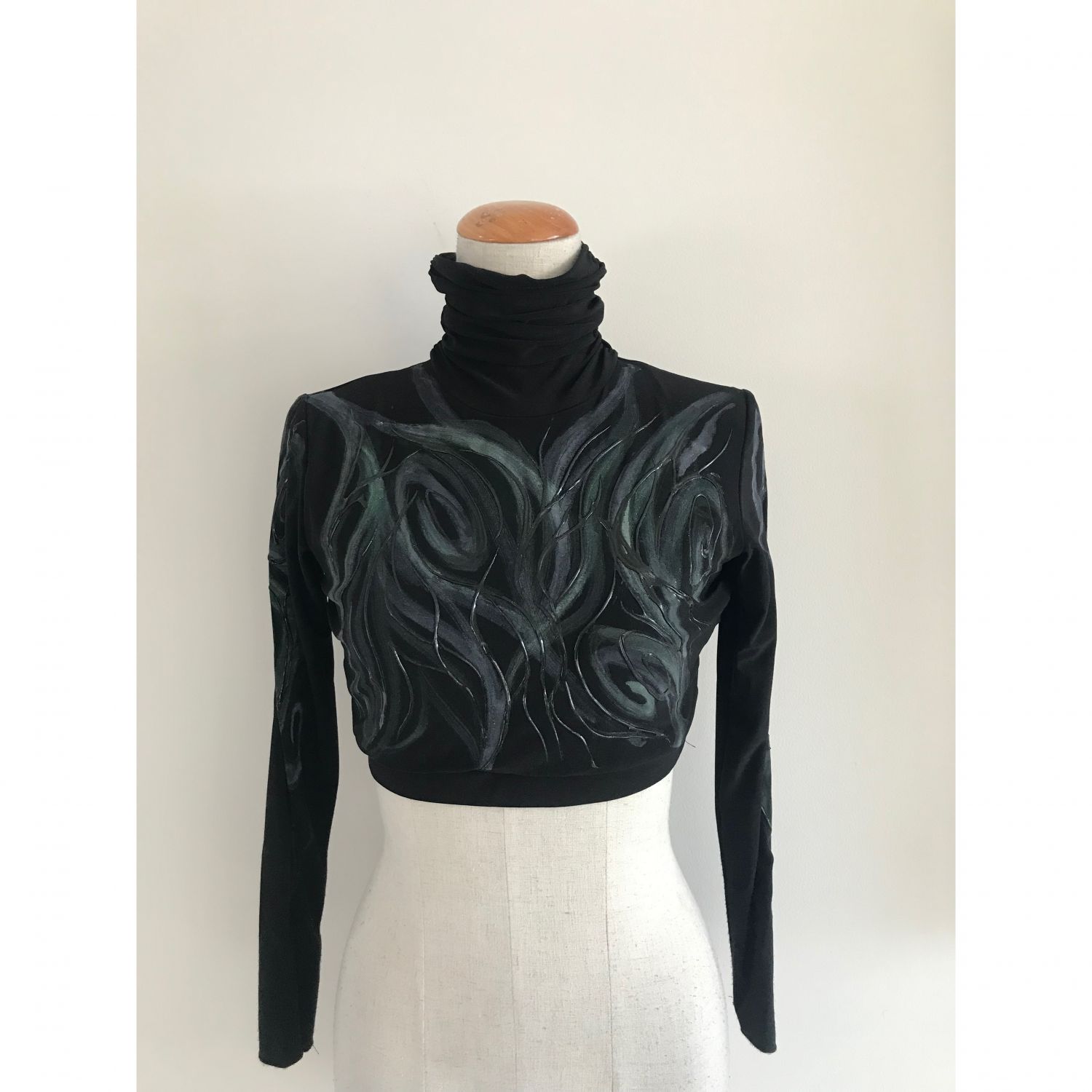 Top lined, with high neck and long sleeves, snap closure on the back