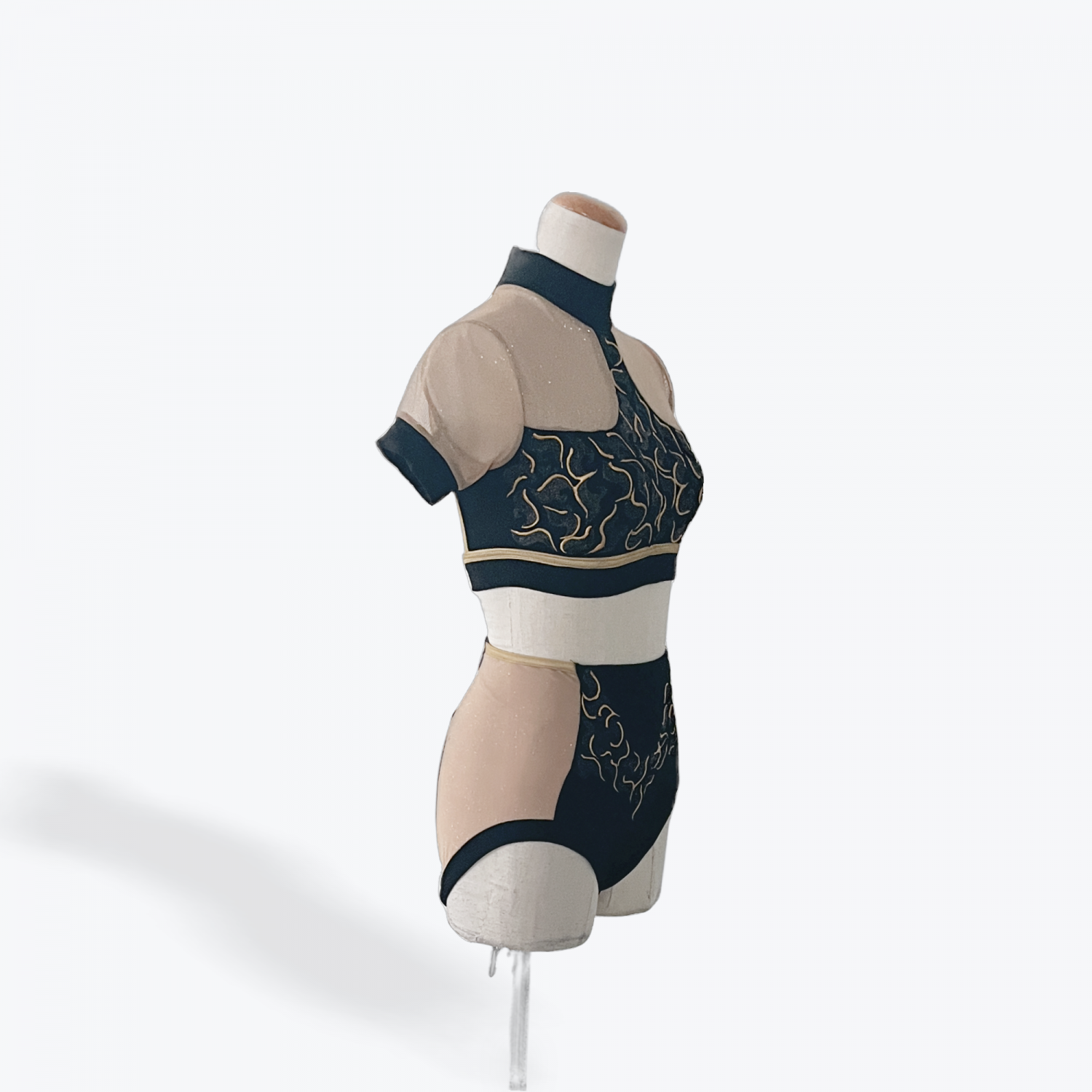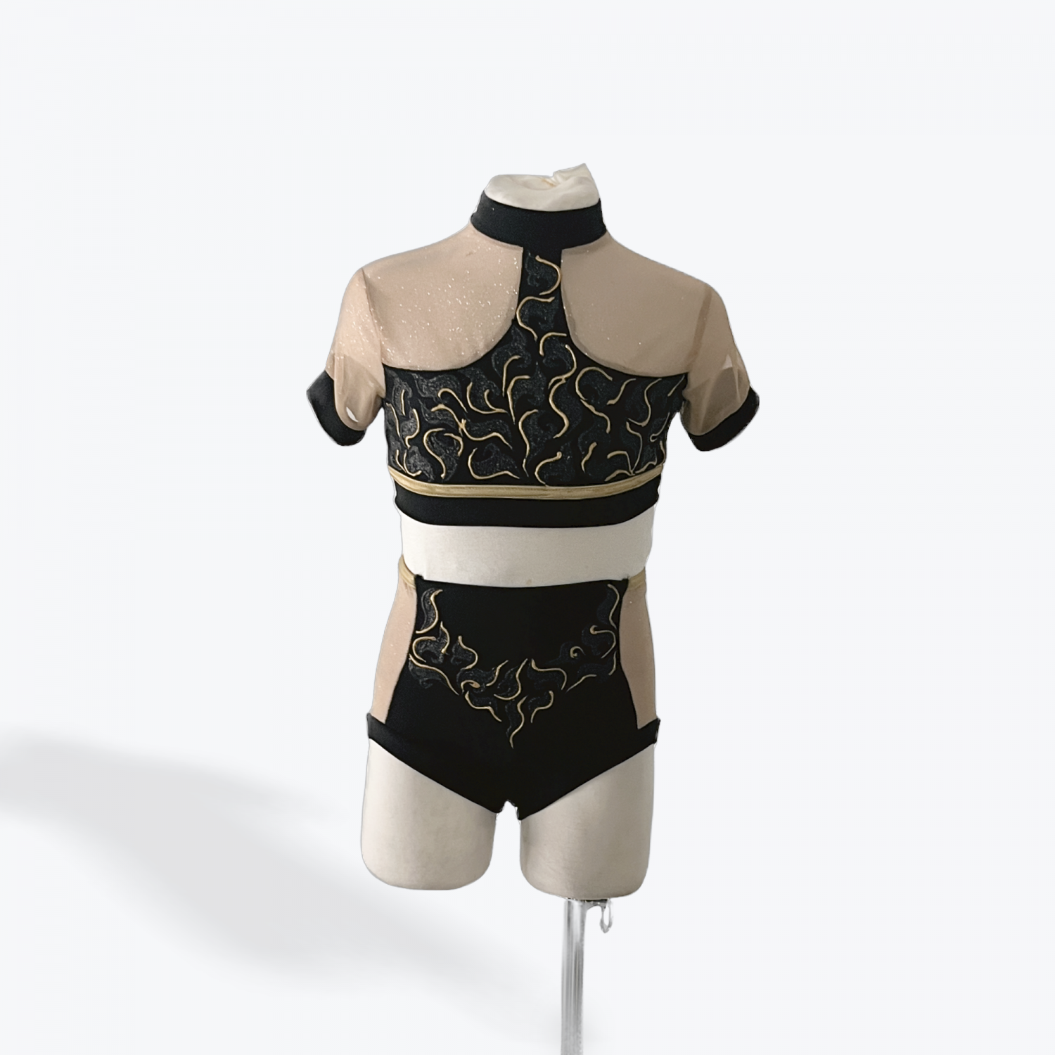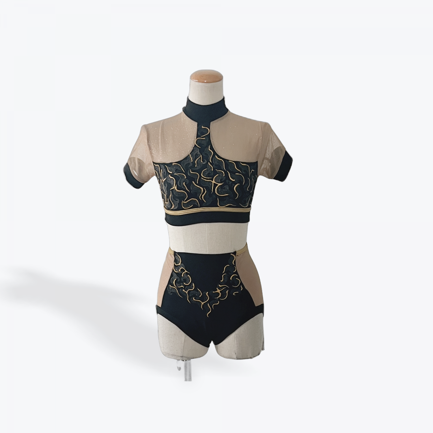 Strike a bold pose in this striking two-piece set designed for power and precision. Featuring a high-neck crop top with sheer mesh sleeves and metallic gold embroidery, paired with matching high-waisted shorts with nude mesh insets for contrast and movement.