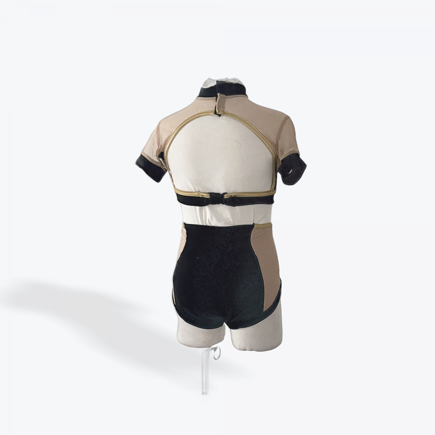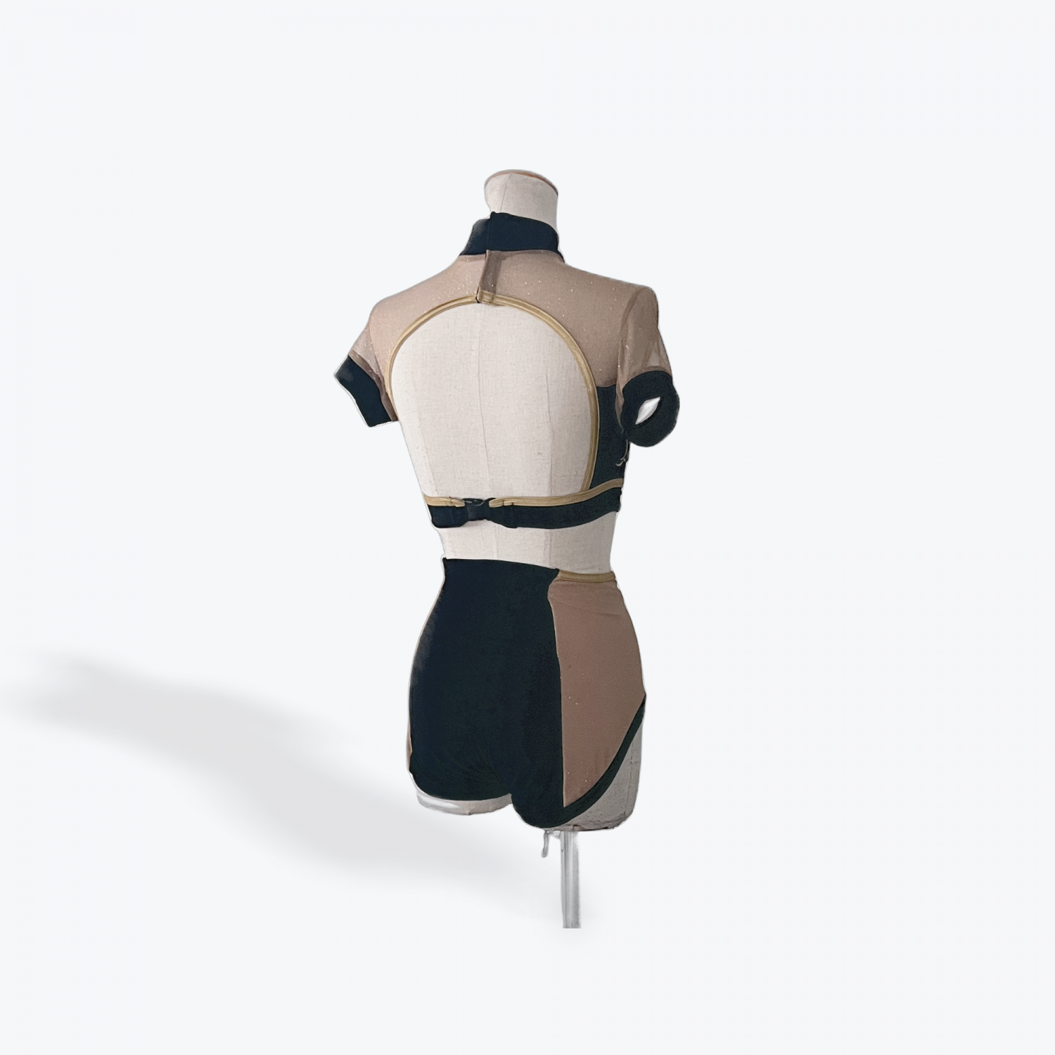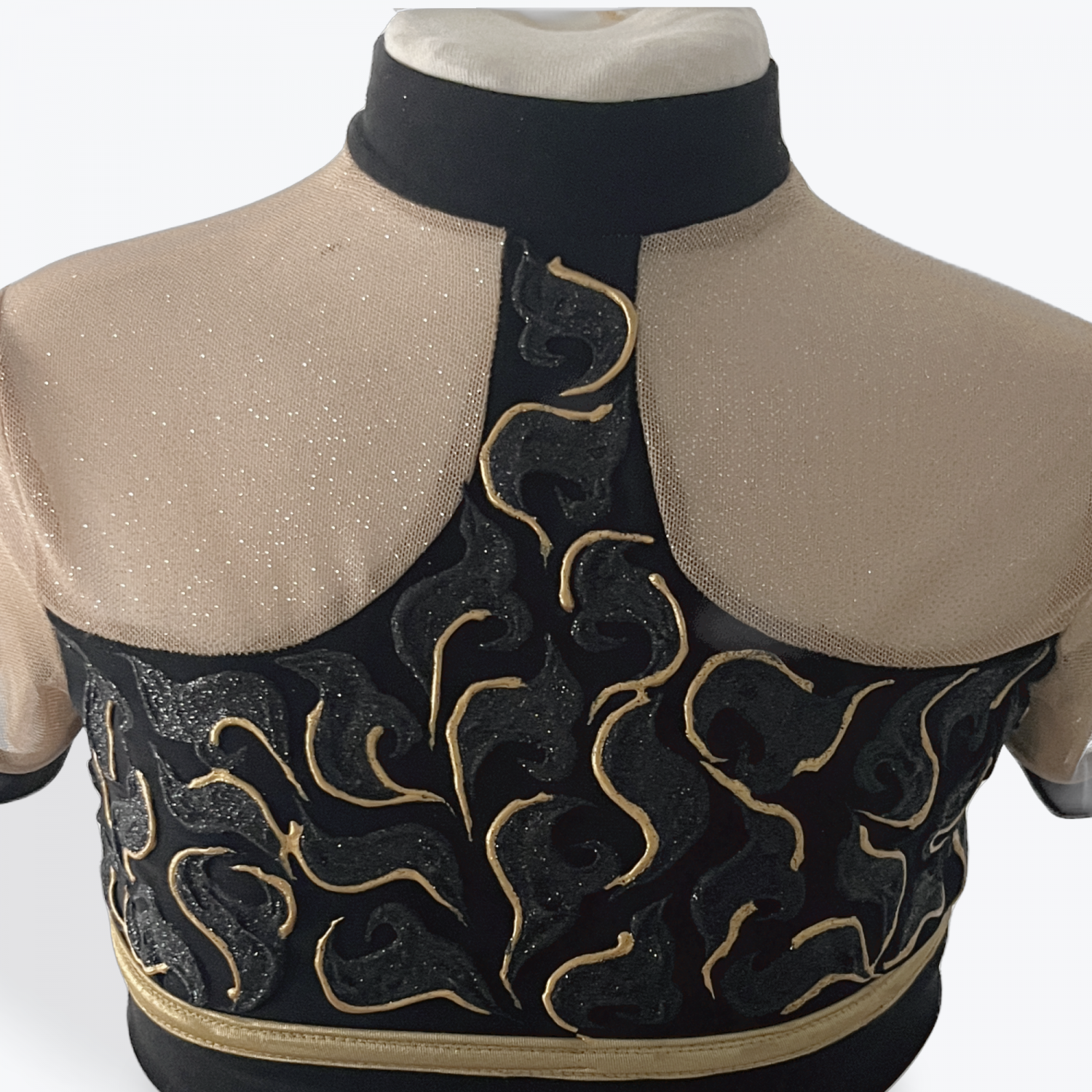 Strike a bold pose in this striking two-piece set designed for power and precision. Featuring a high-neck crop top with sheer mesh sleeves and metallic gold embroidery, paired with matching high-waisted shorts with nude mesh insets for contrast and movement.