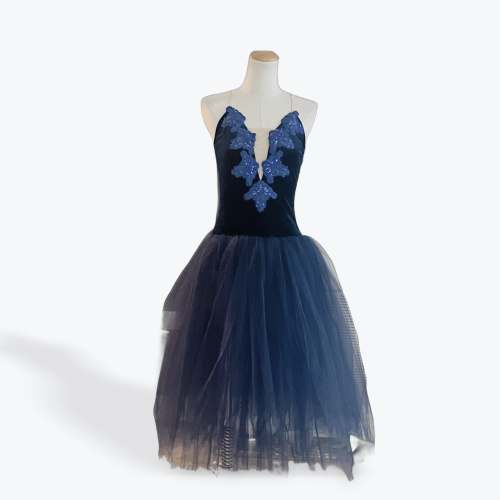 A striking ballet-inspired costume in deep midnight blue, designed for elegance and drama under stage lights. The velvet bodice features a plunging V-neckline adorned with intricate sequin appliqués that shimmer with every movement. Soft tulle layers create a romantic, flowing skirt that moves beautifully in lyrical or ballet routines. Double thin straps add a delicate finish to the open back, balancing sophistication with strength. Perfect for performances that call for depth, grace, and quiet power.