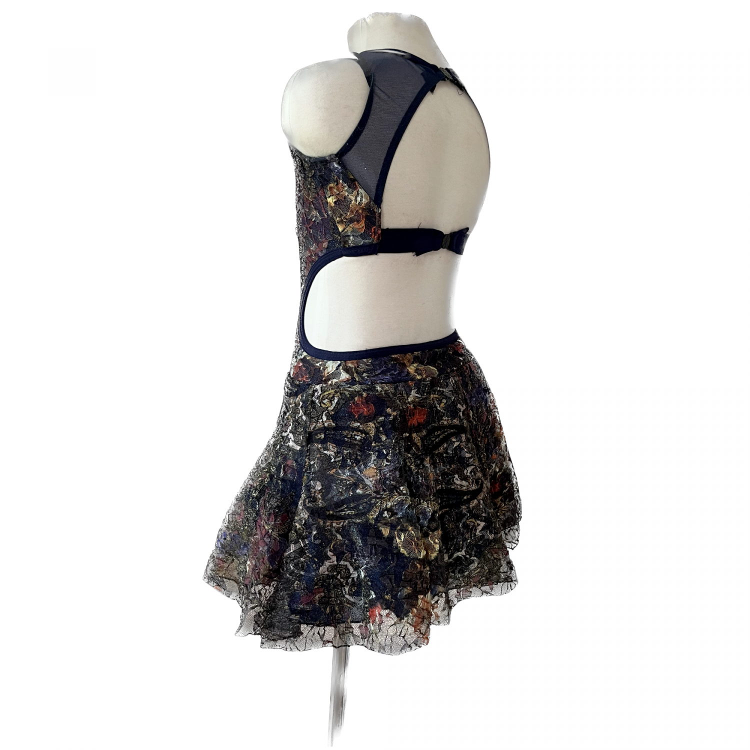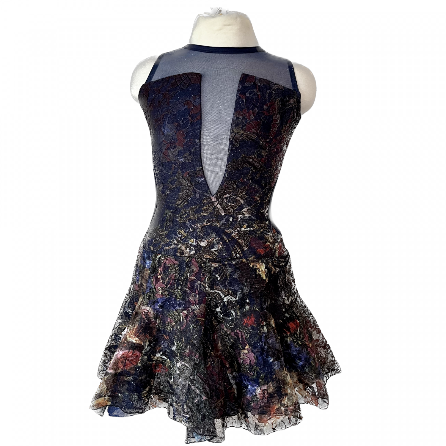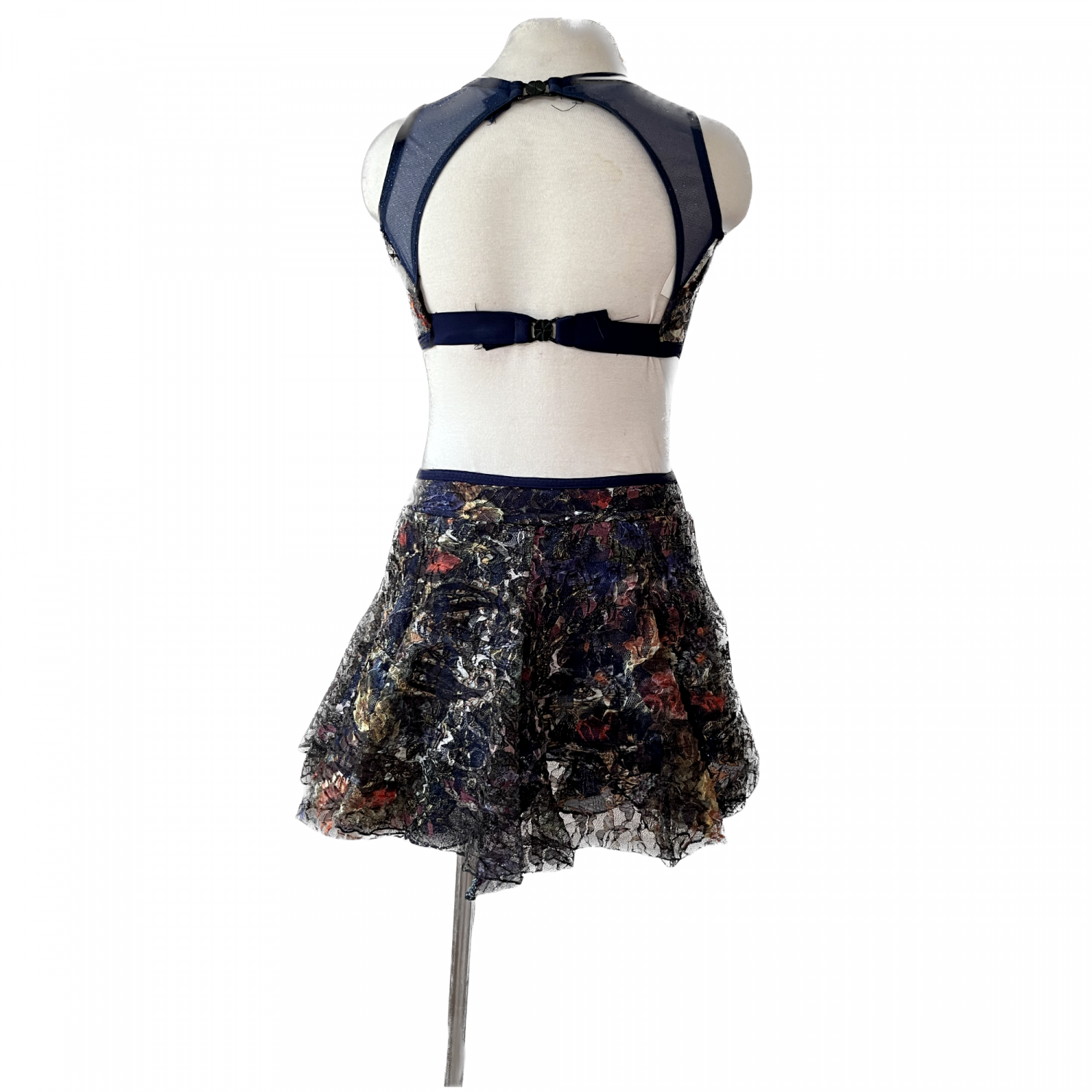 Beautiful dance dress with built in bodysuit, open back, layer of tulle under sheer lace skirt