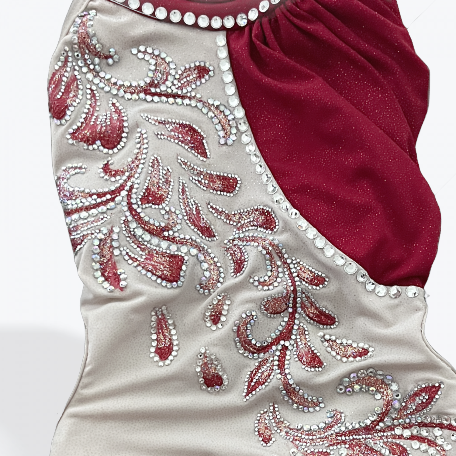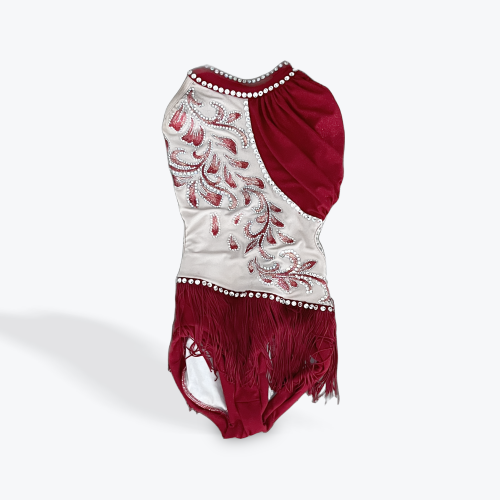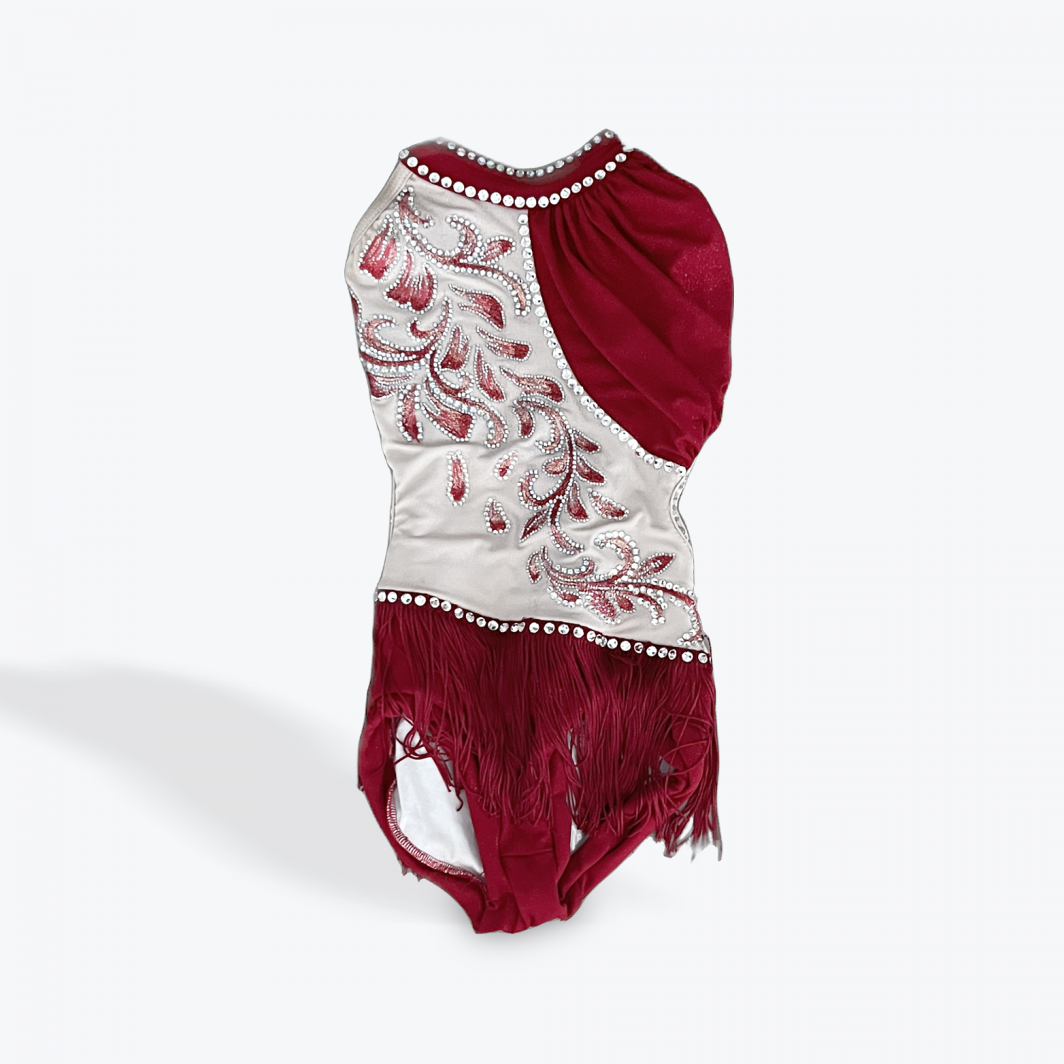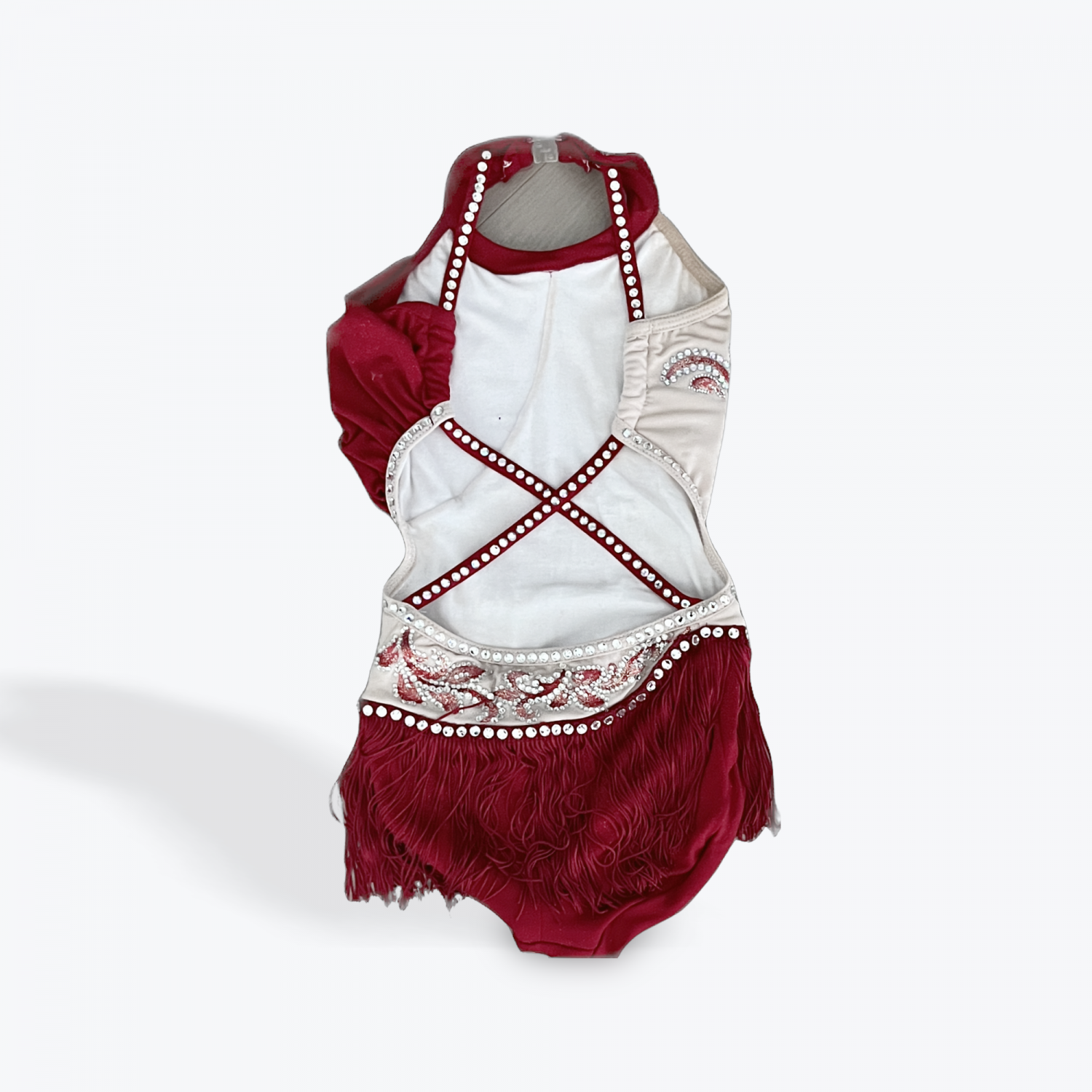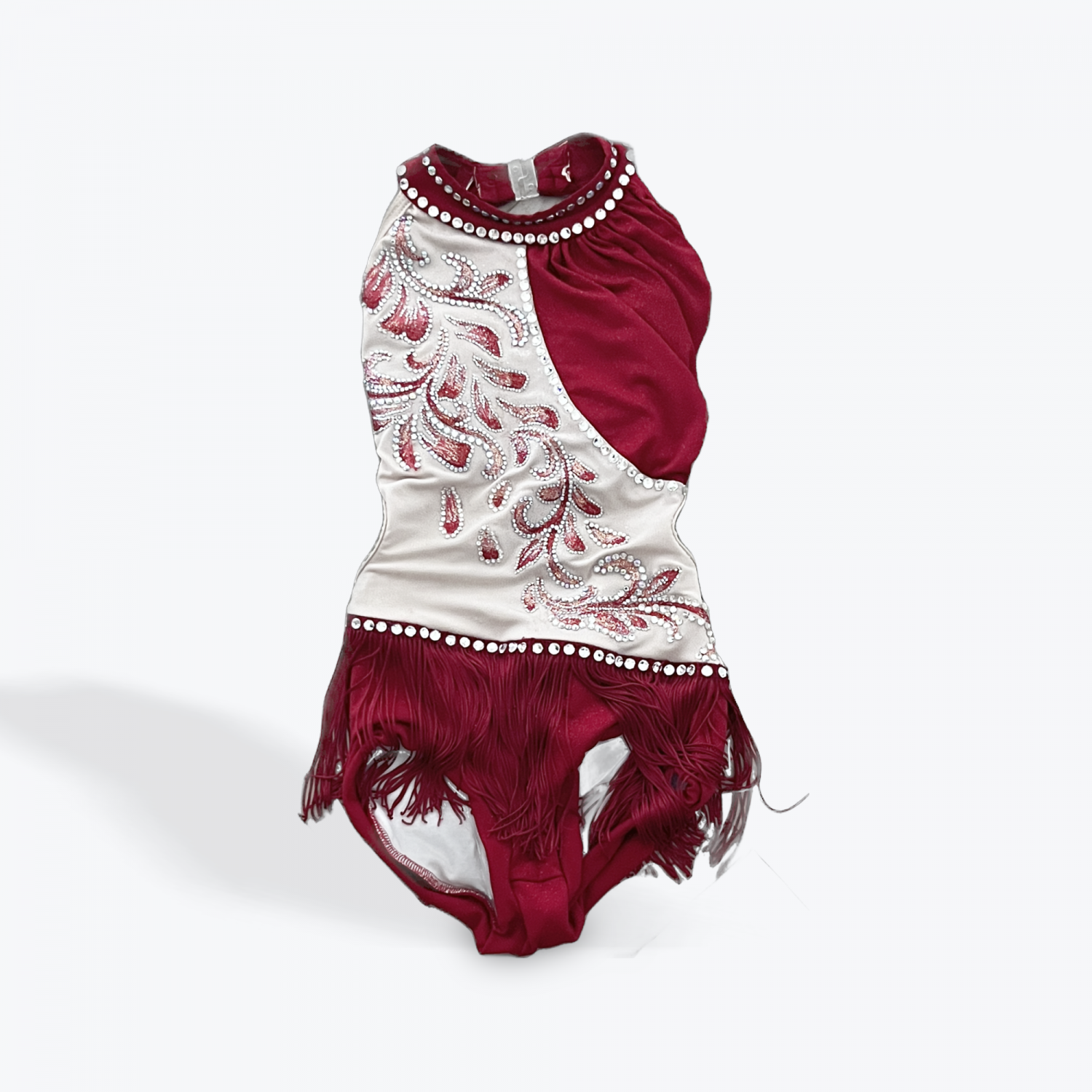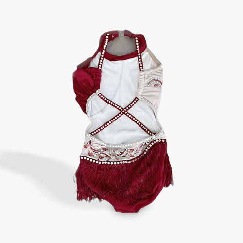 Turn heads on stage in this stunning red and nude solo costume. The asymmetrical halter design features sparkling rhinestone embellishments with swirling floral patterns across the bodice. Finished with bold red fringe that moves effortlessly with every step, this costume is perfect for jazz, musical theatre, or open routines. Comfortable fit with a secure neckline for confident performance.