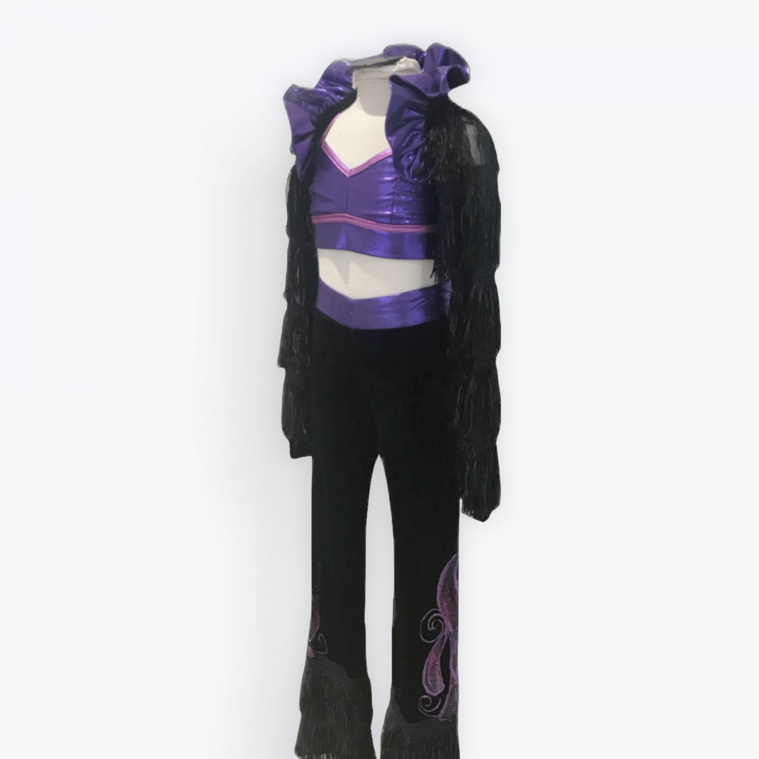 Bolero style jacket with high collar, fringe sleeves and painted back