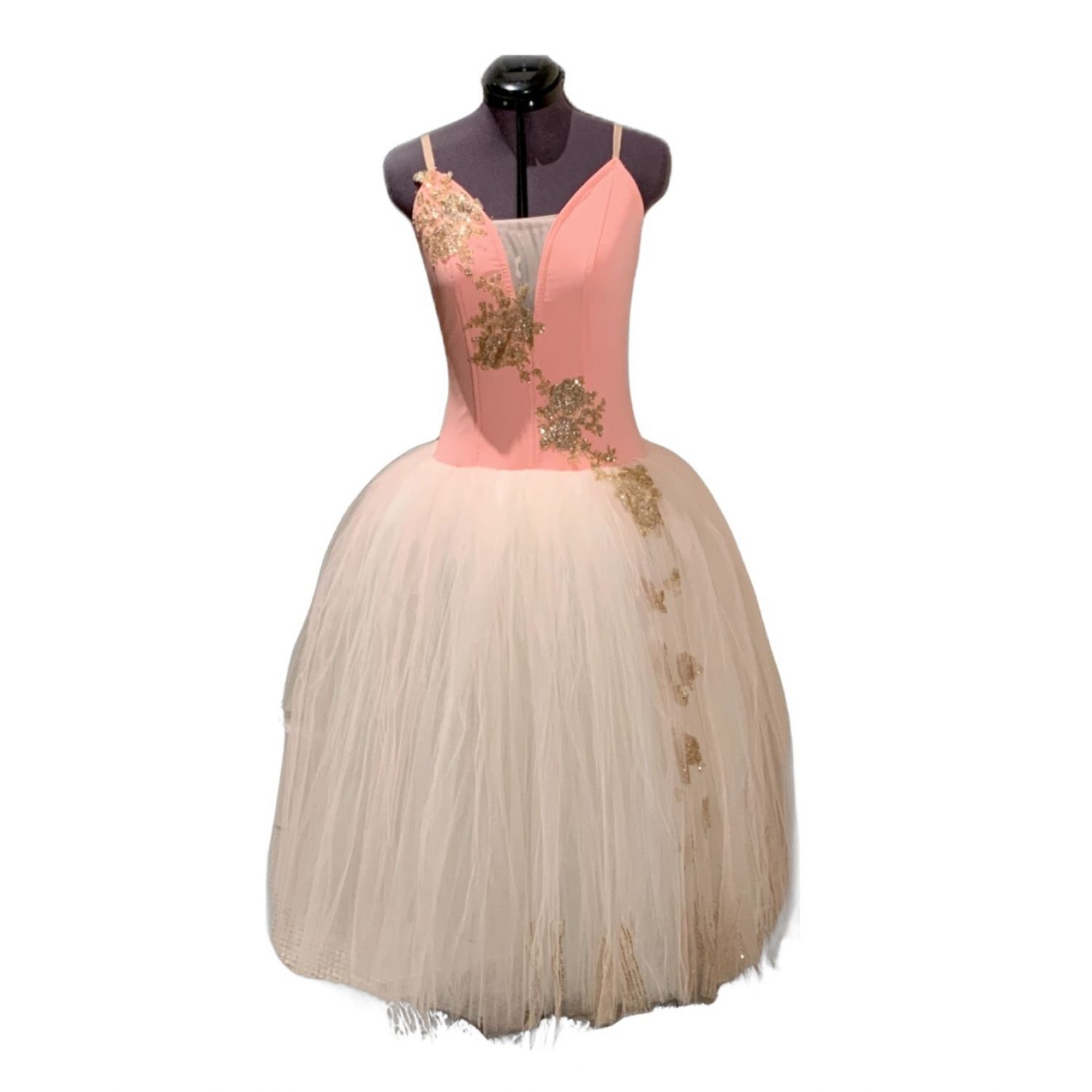 Adult L - Romantic ballet dress with soft pink top, white and pink long romantic tutu, and gold appliqués.  Dancer is 5'6".