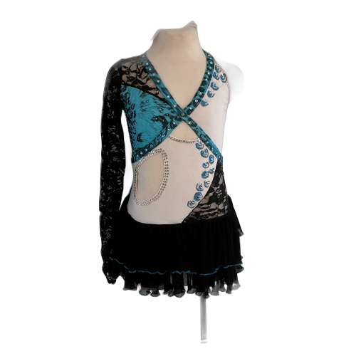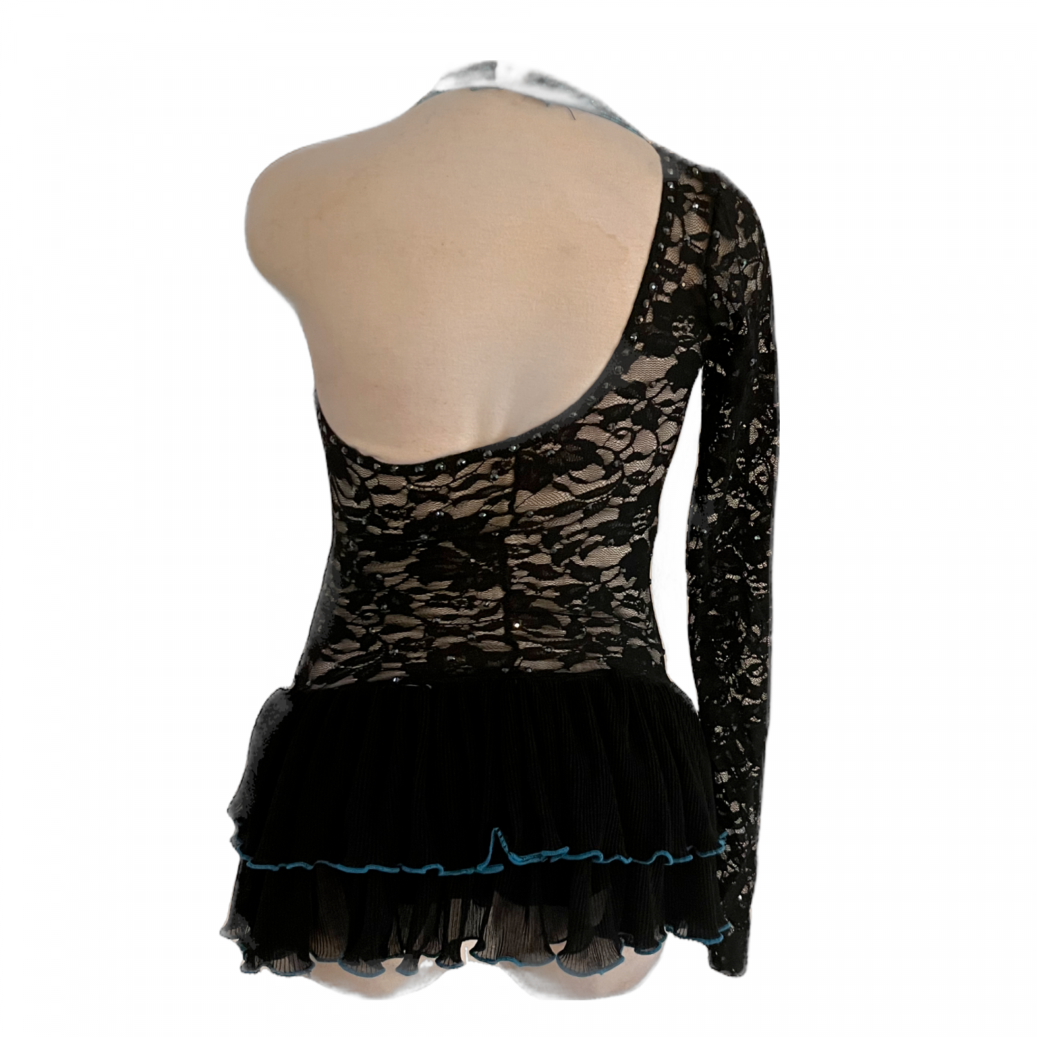 Bodysuit with lace back, one lace sleeve, rhinestoned, 2 tiered lace skirt