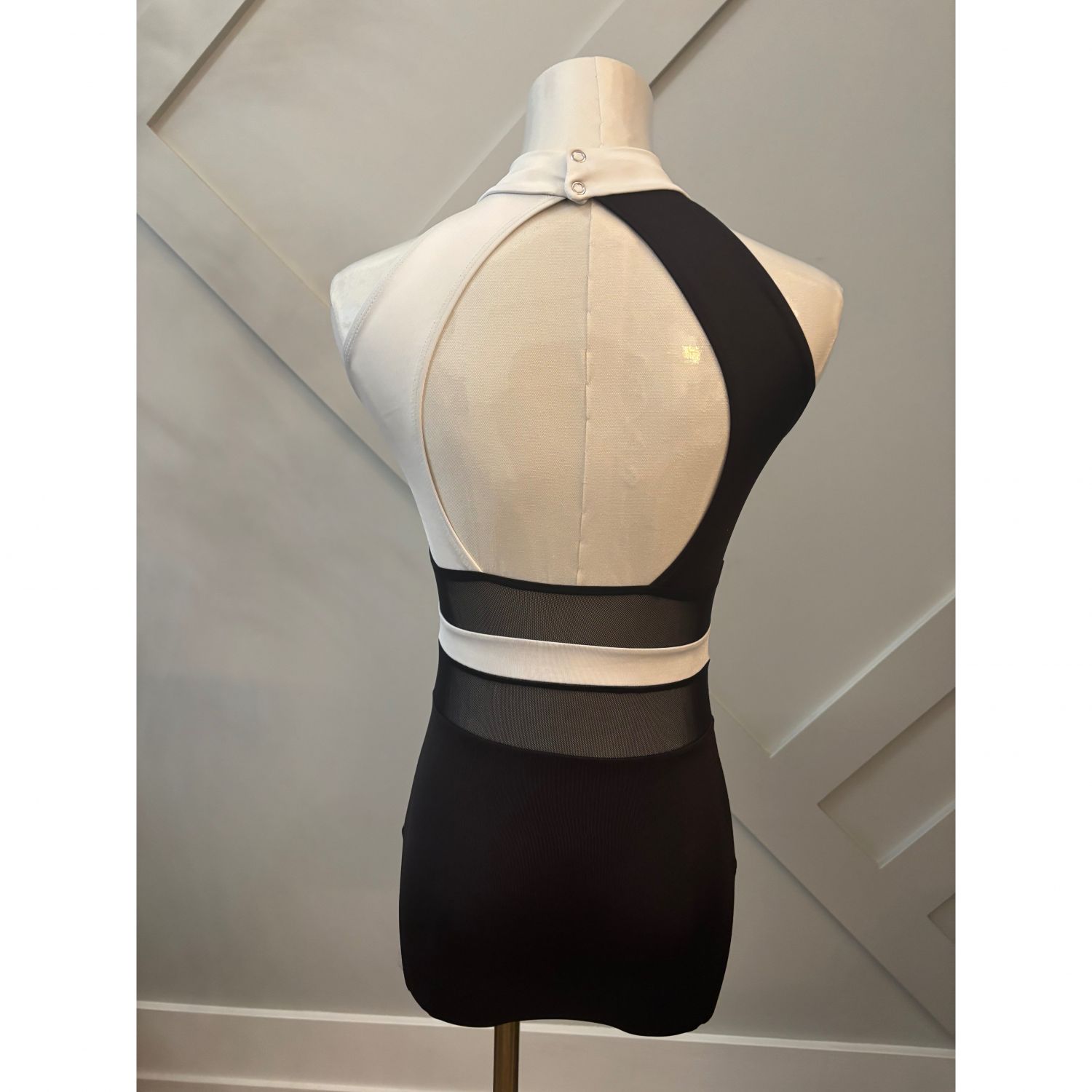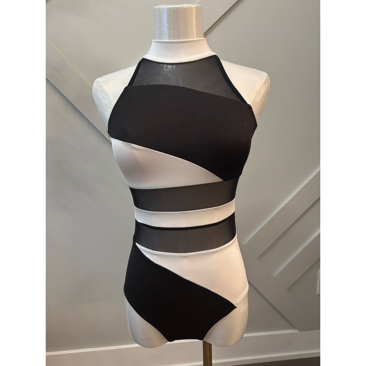 Bold and striking, this black and white color-blocked one-piece leotard commands attention with its high-contrast design. Perfect for making a powerful statement on stage, it’s sure to leave a lasting impression