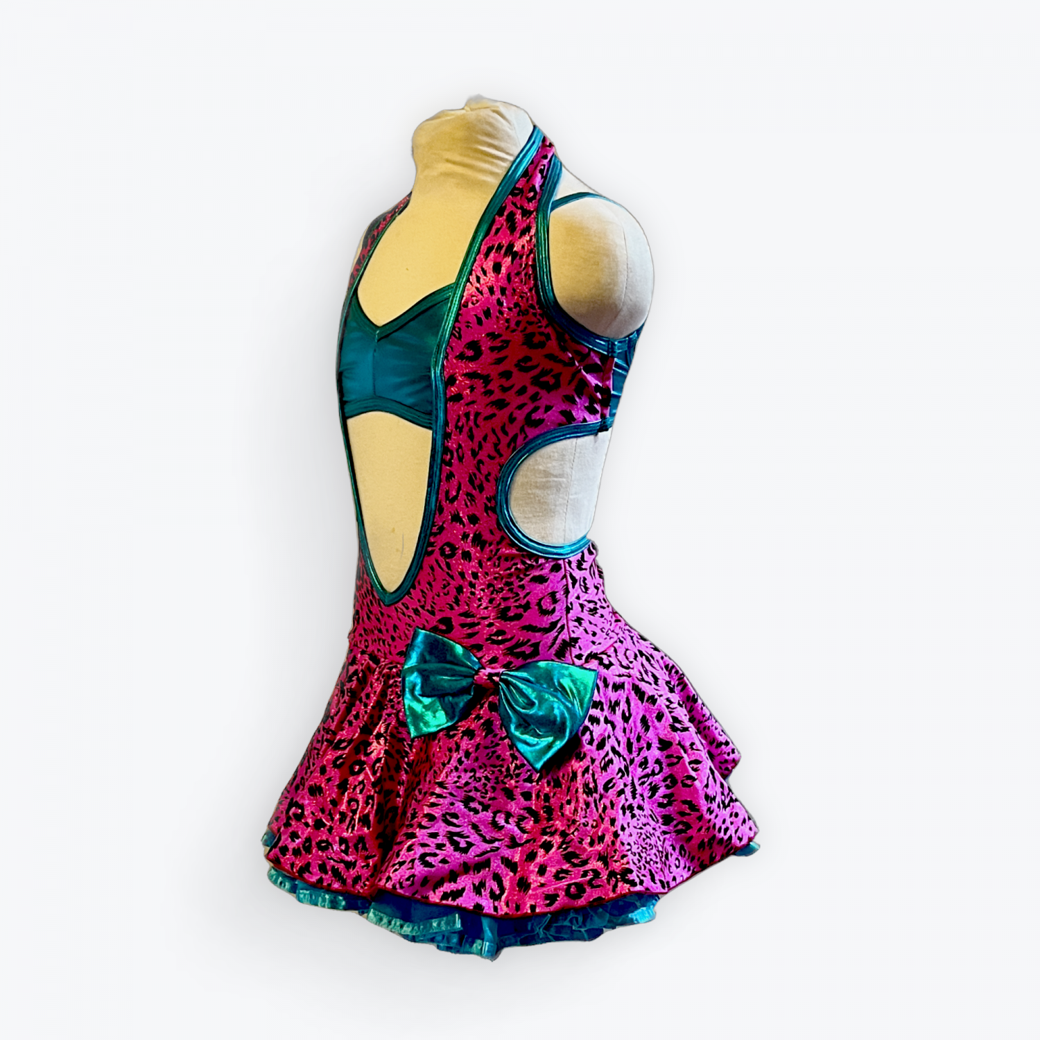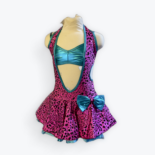 Pink tiger print with attached blue lame.  Fully lined with secure closure at neck and back.