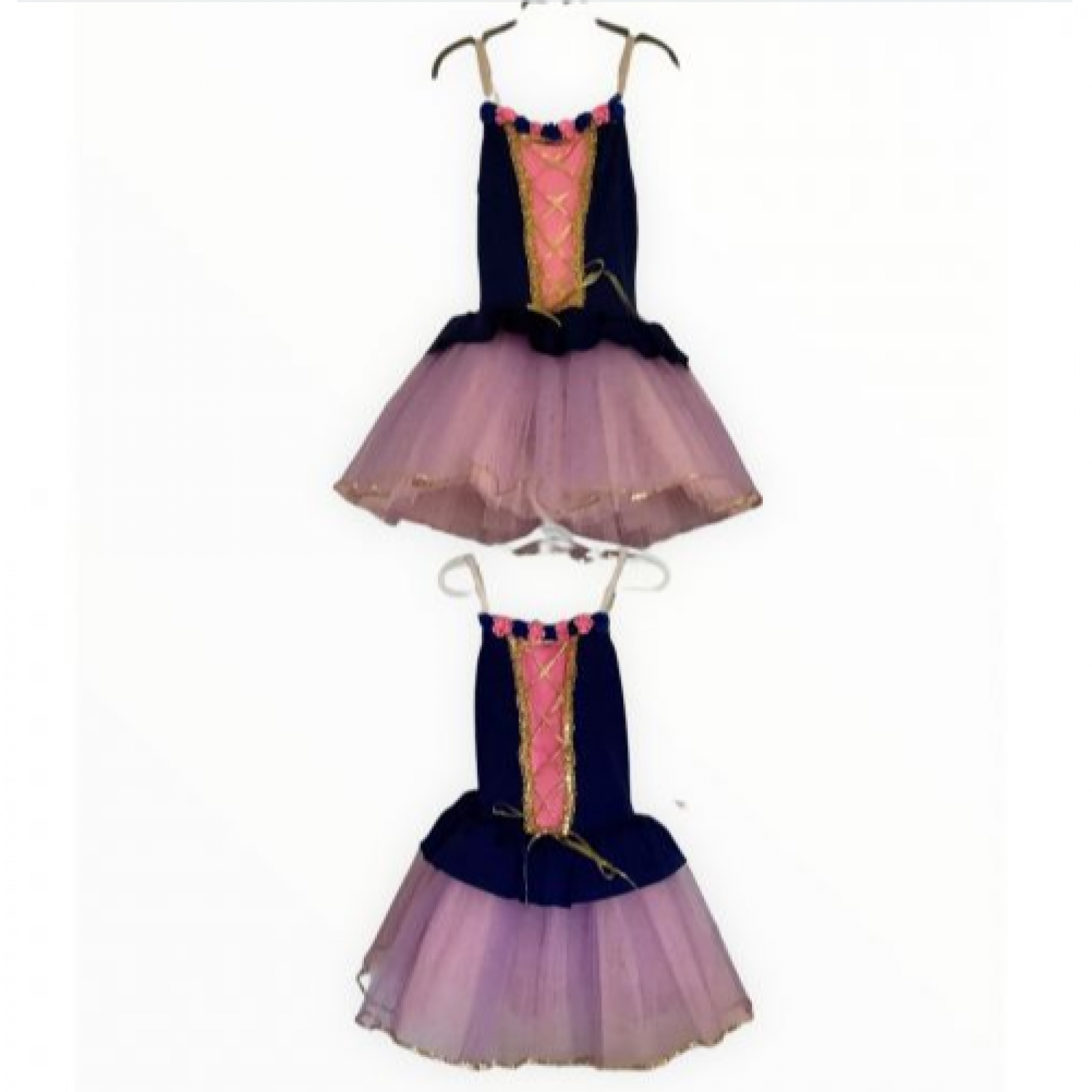 Purple-pink ballet costume with attached tulle skirt, flowers and gold lacing.