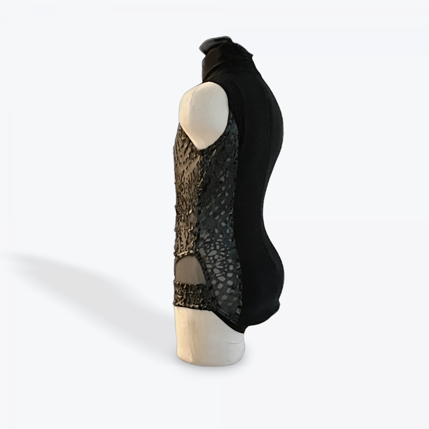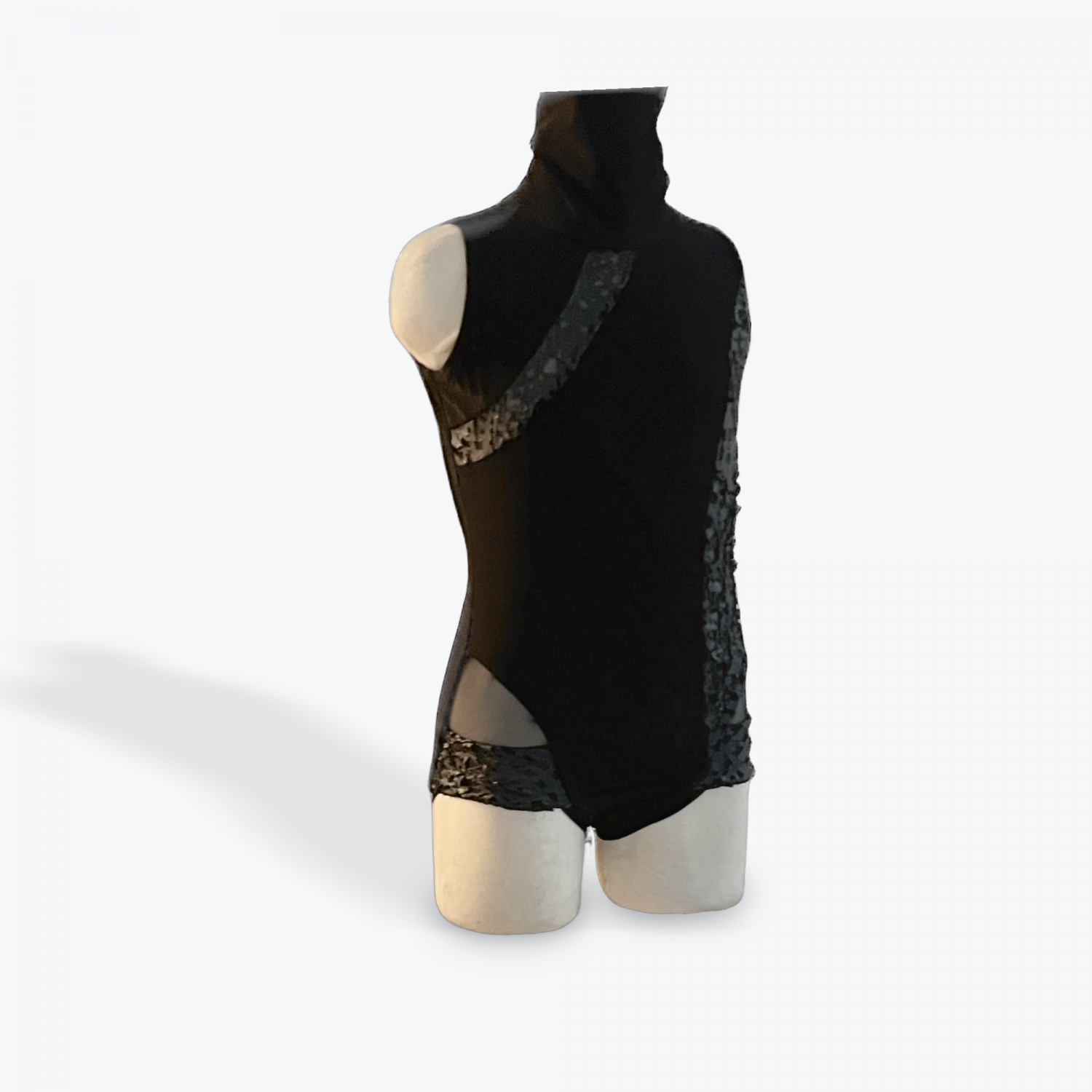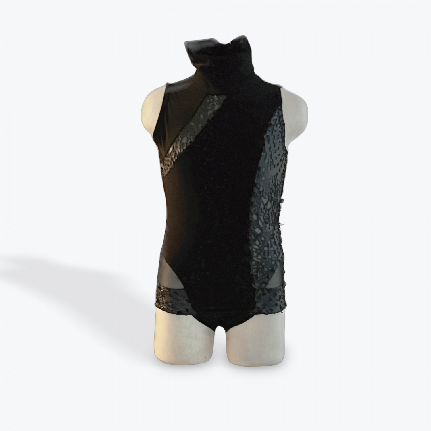 Custom Effie Mathews design featuring a sleek black silhouette with sculpted mesh panels. The high neckline and invisible zipper up the back create a smooth, professional finish, while the stretch fabric allows freedom of movement. A bold yet minimal look for jazz or contemporary routines, effortless sophistication on stage.