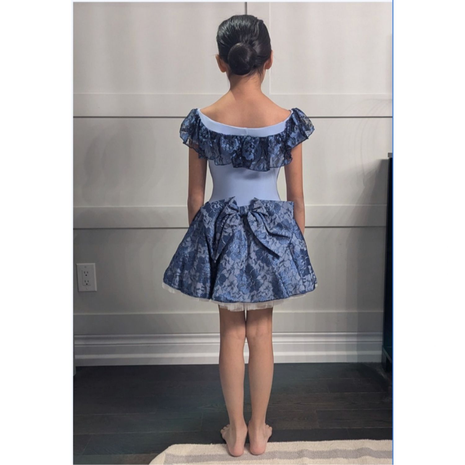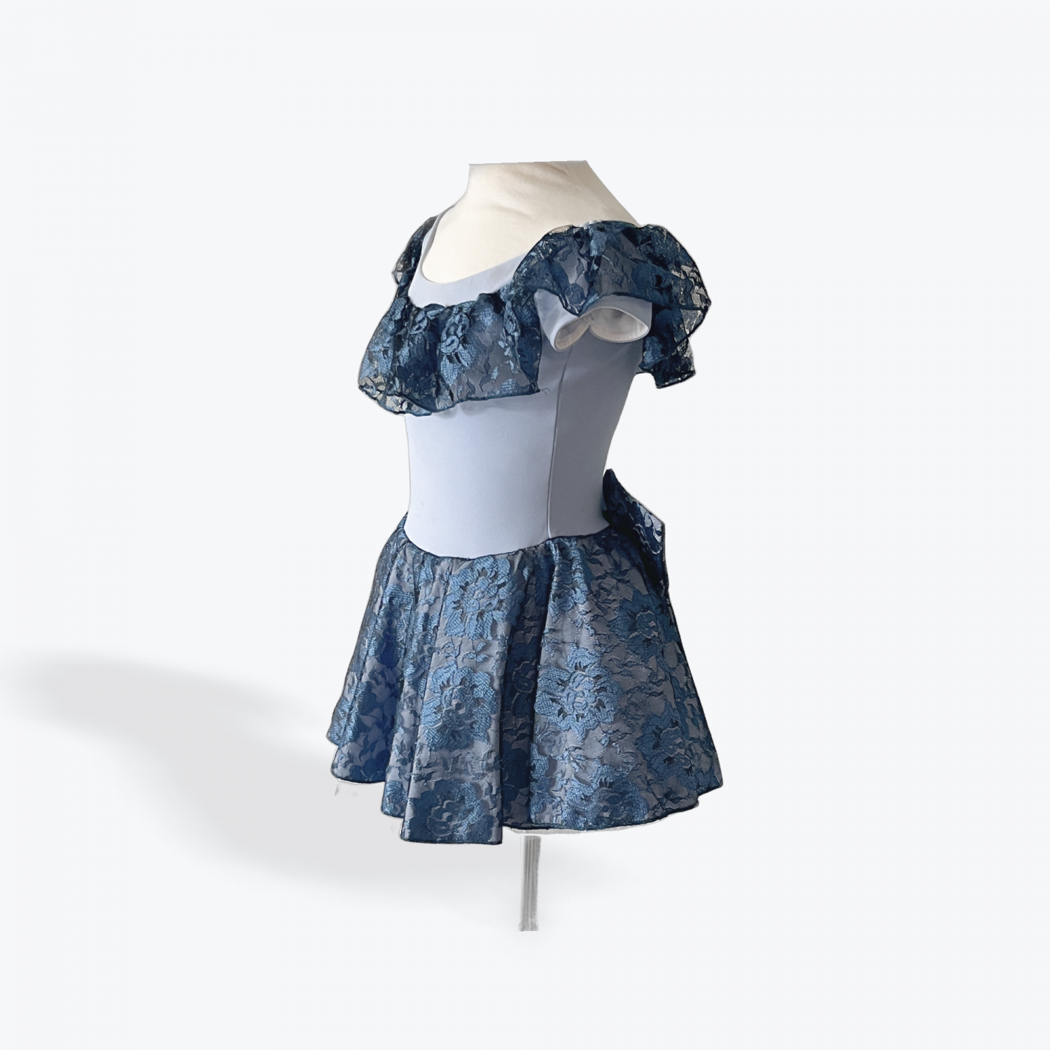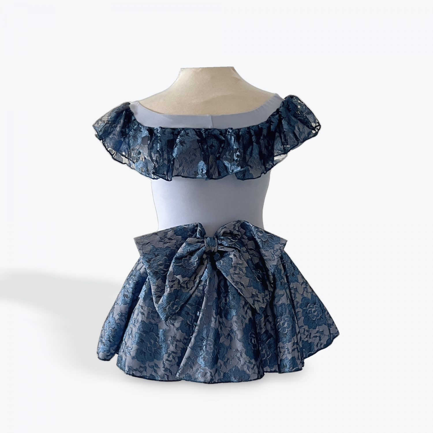 Elegant and timeless, this custom small group ballet costume brings classic charm to any performance. Featuring a soft blue base with delicate floral lace overlay on the skirt and ruffled neckline, this look is perfect for telling a story with poise and beauty. The off-the-shoulder style and matching lace bow at the back add a romantic, refined finish.