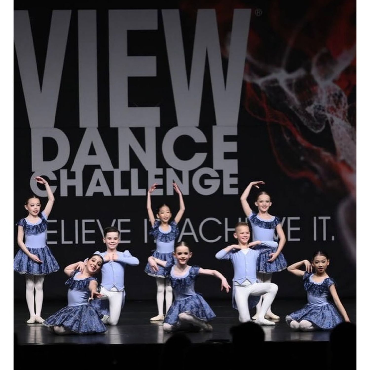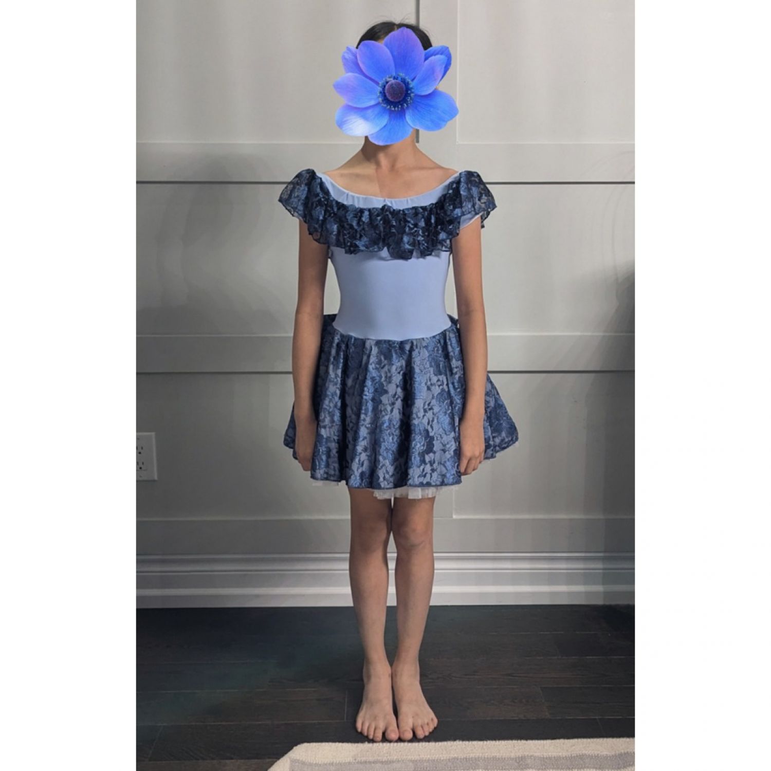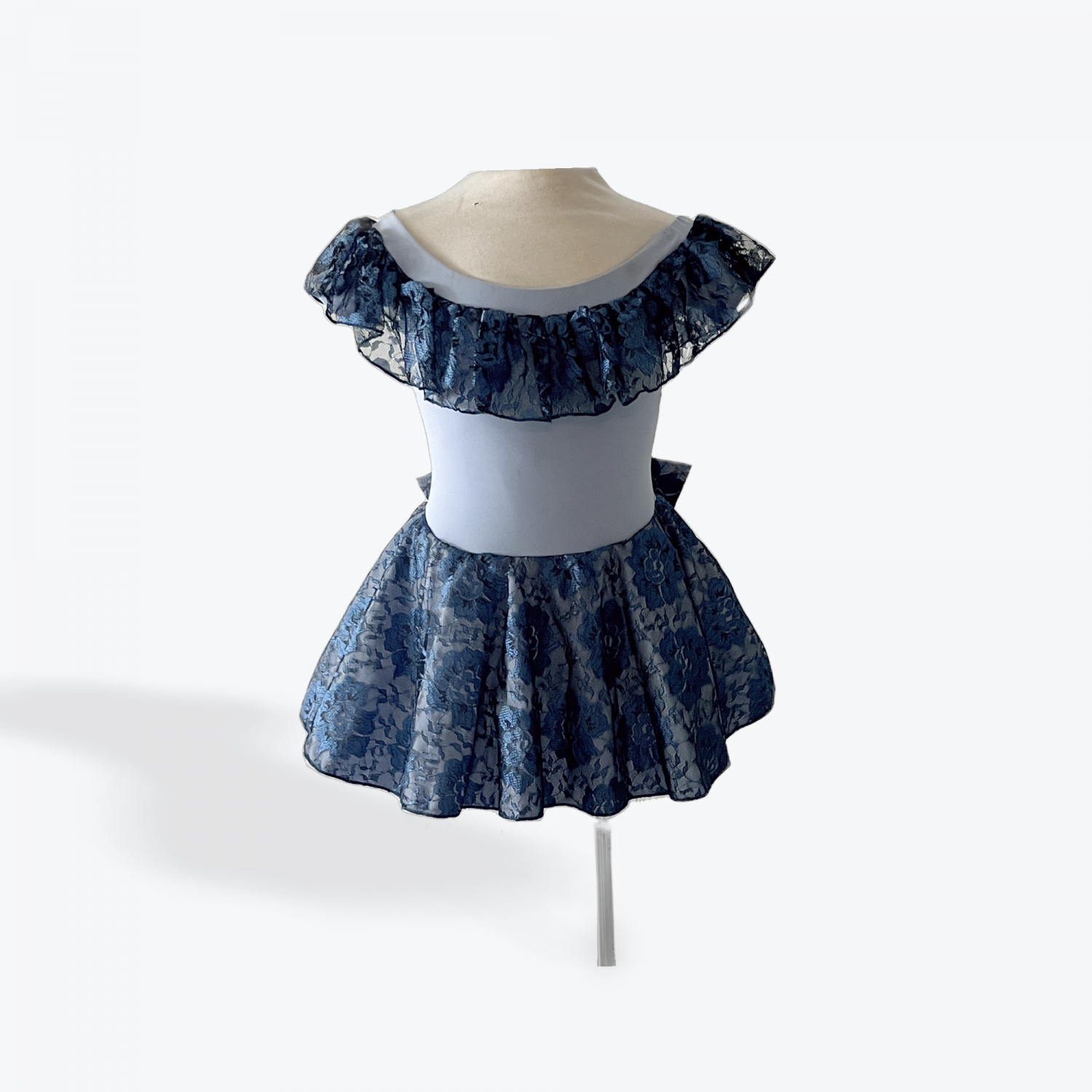 Elegant and timeless, this custom small group ballet costume brings classic charm to any performance. Featuring a soft blue base with delicate floral lace overlay on the skirt and ruffled neckline, this look is perfect for telling a story with poise and beauty. The off-the-shoulder style and matching lace bow at the back add a romantic, refined finish.