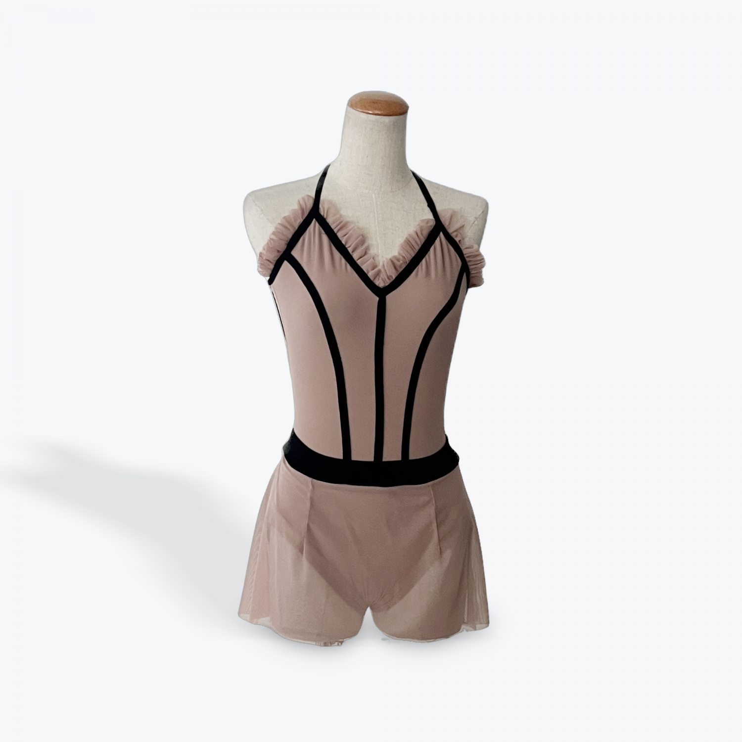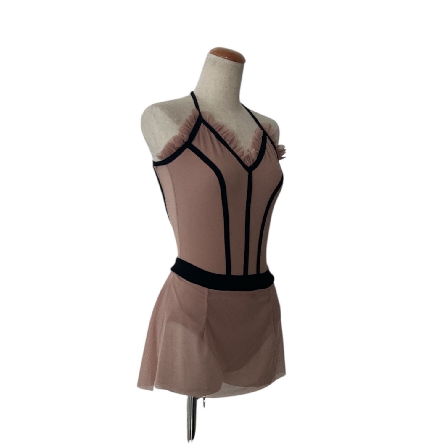 Soft and striking, this blush-toned lyrical costume features delicate mesh ruffles, bold black contour lines, and a flirty skirt overlay. The open criss-cross back adds elegance, while the structured bodice keeps the silhouette sleek and flattering. Ideal for lyrical, contemporary, or character solos. Gently used and full of graceful potential.