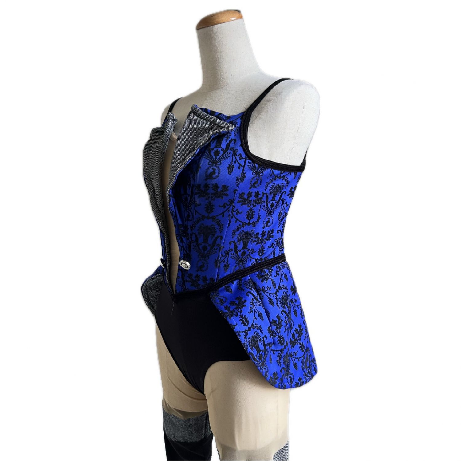 Bodysuit Royal blue with black velvet pattern, nude mesh and front silver sparkle lapel with wire insert