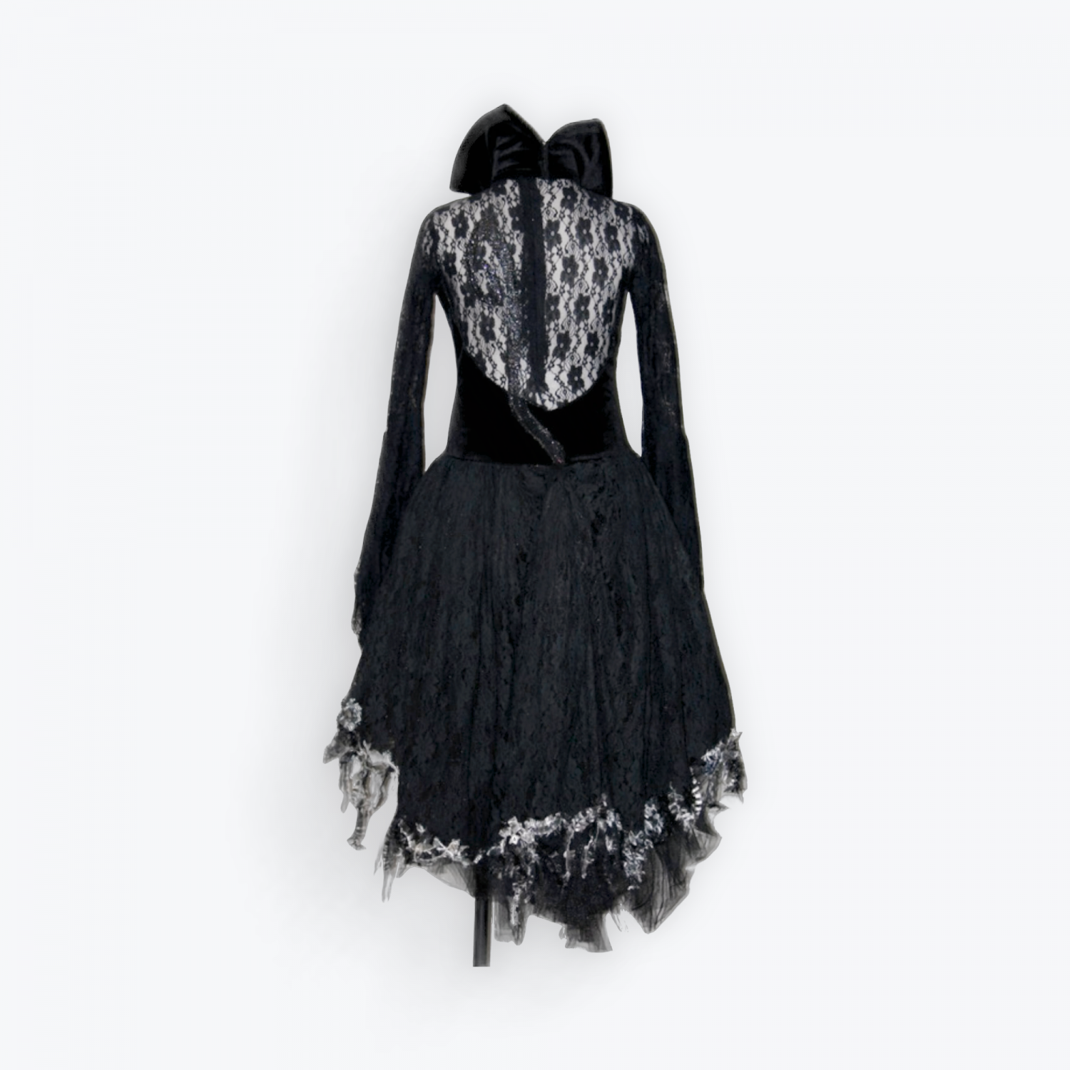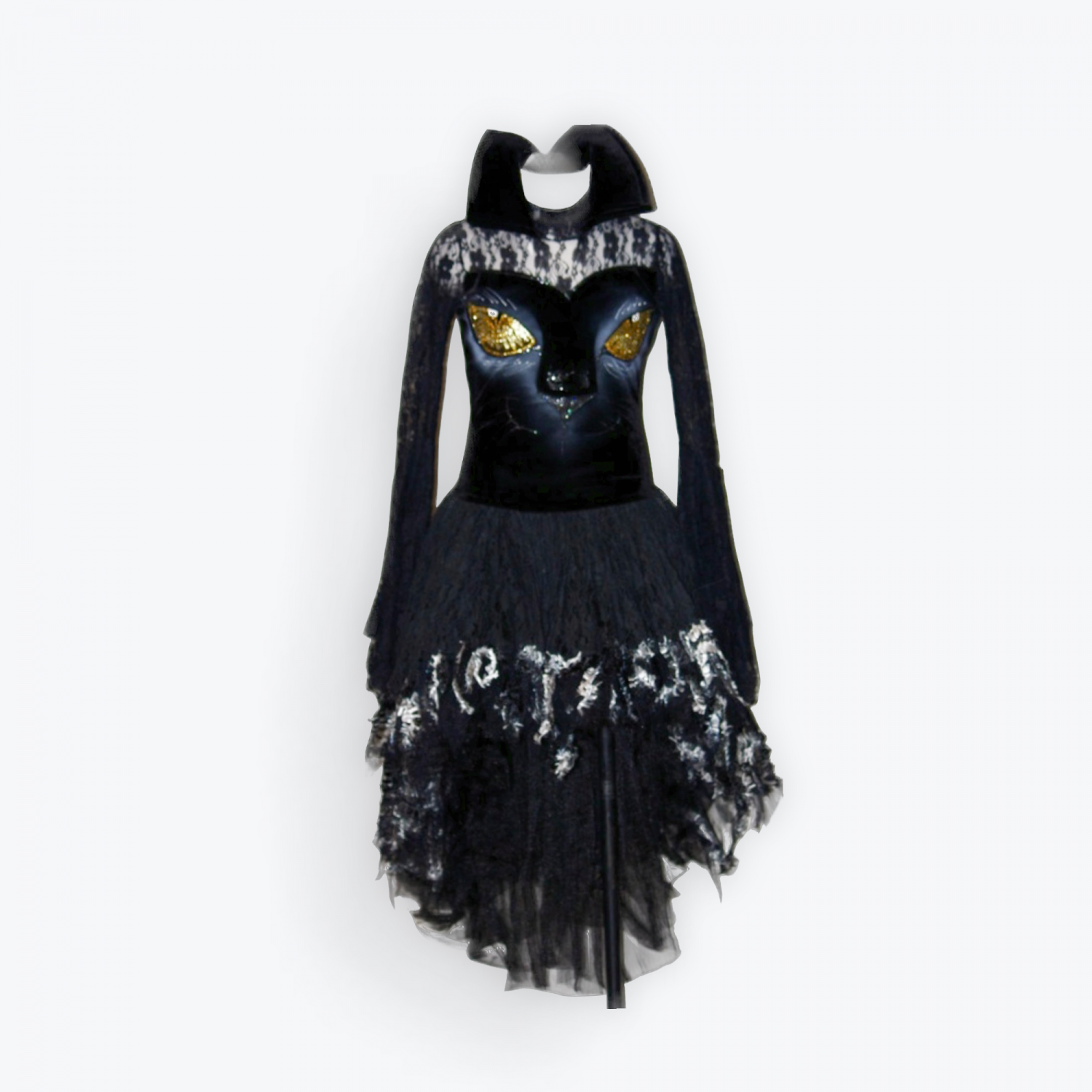 Dress with a hand painted cat eyes front, high collar, and beautiful stretch lace. Invisible zipper up the back