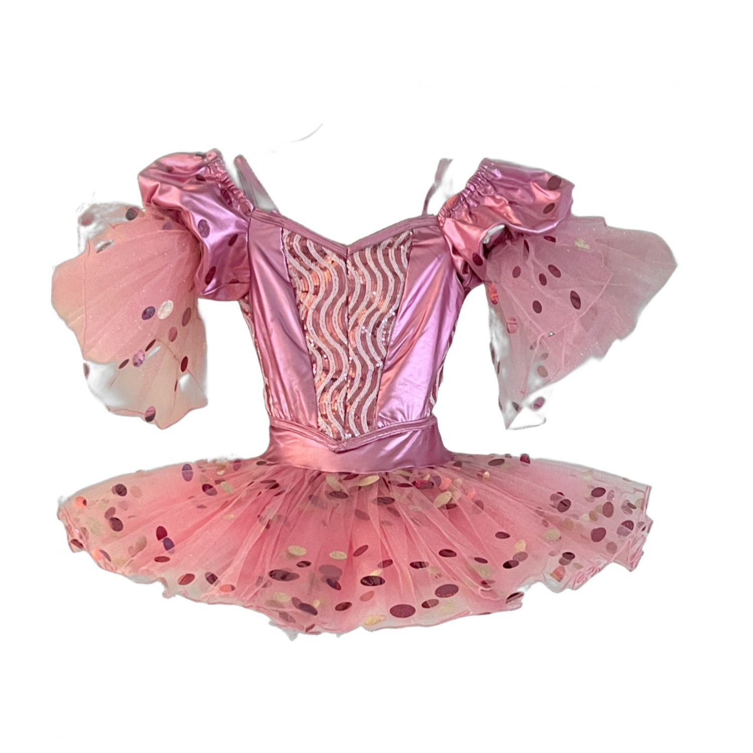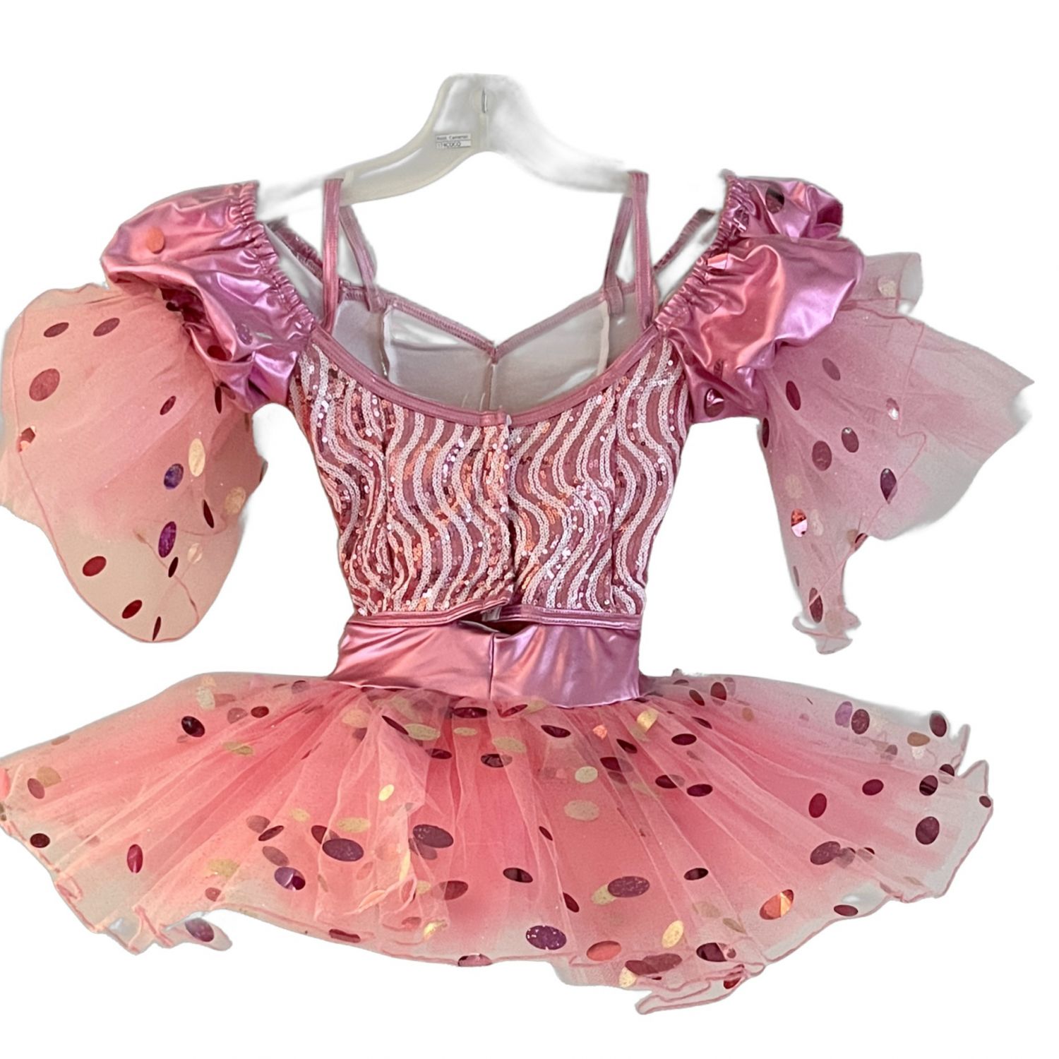Pink sparkle tutu with shiny spots, off the shoulder puff sleeves, hook and eye closure up the back.