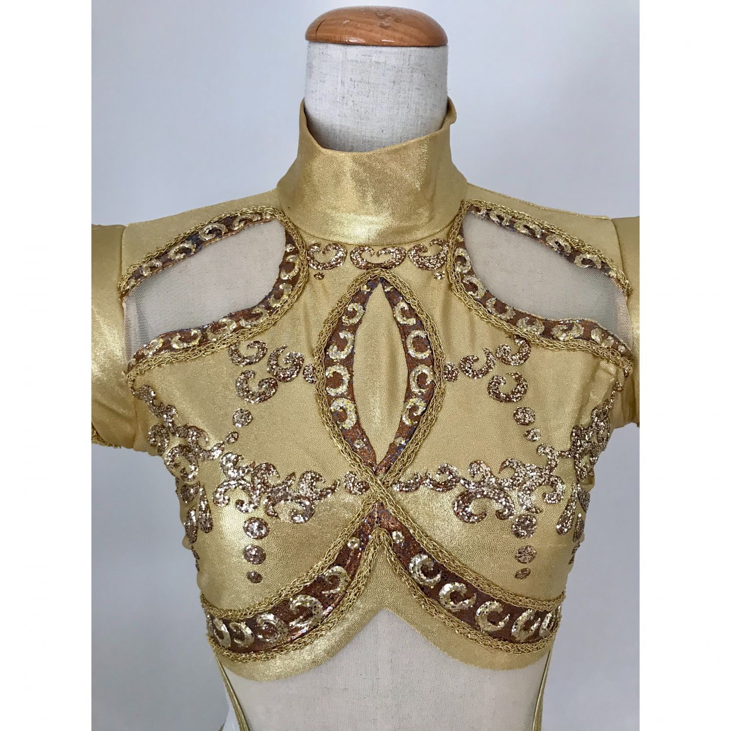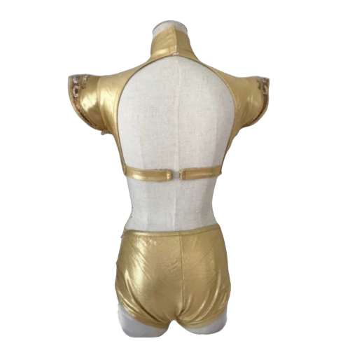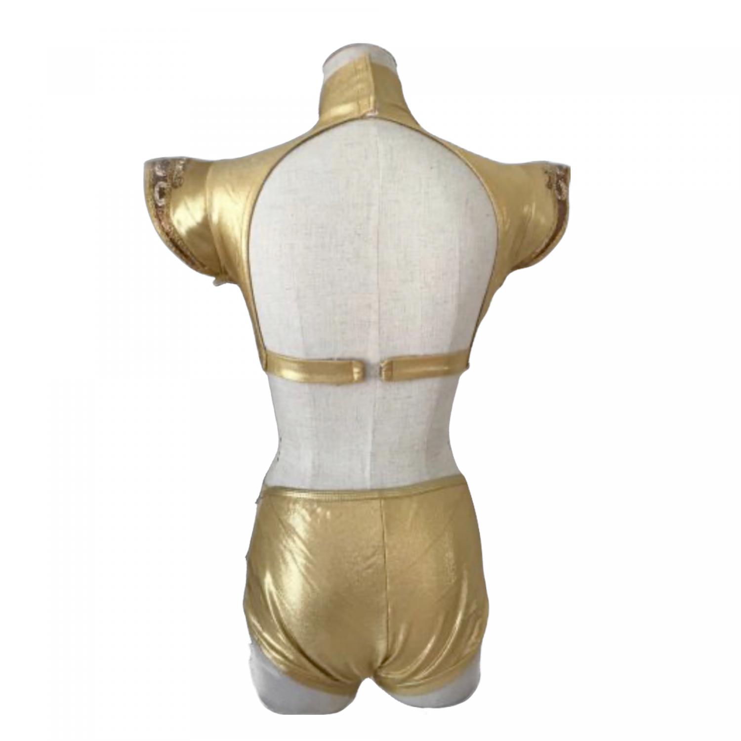 Gold lame bodysuit with high neck and cap sleeves, snap closure at neck