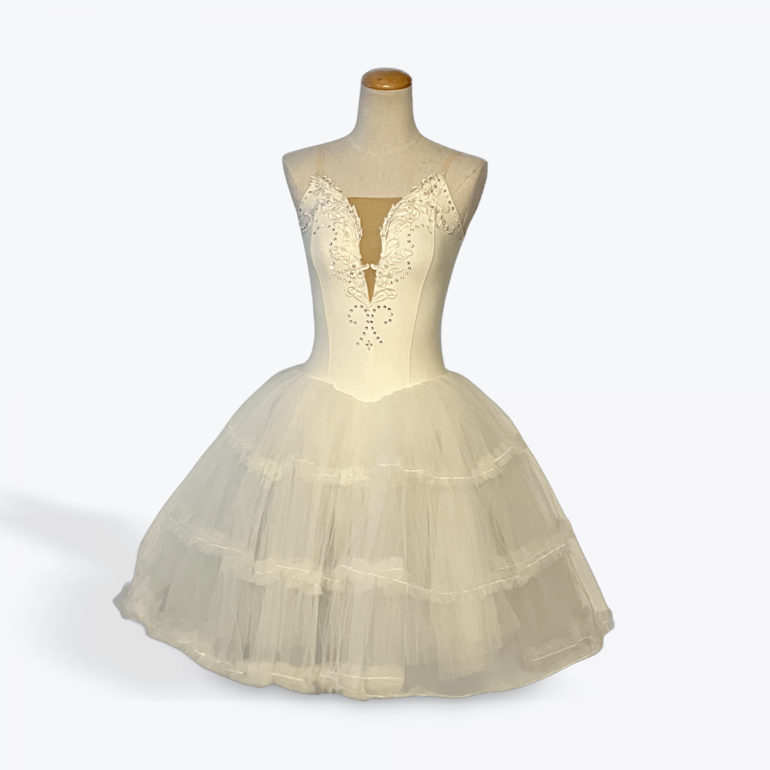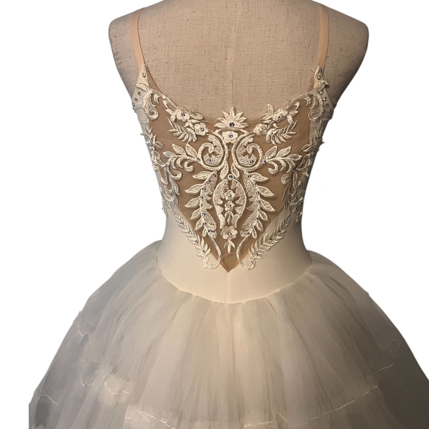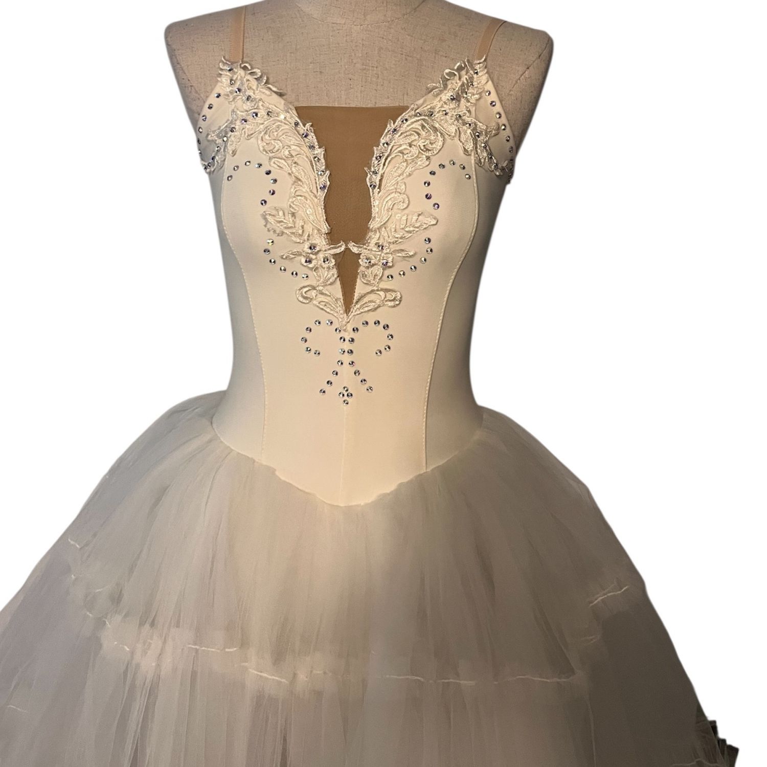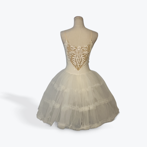 A refined classical tutu designed for center-stage moments. Etoile Blanche features a sculpted white bodice with intricate embroidered appliqué and crystal detailing that frames the neckline and torso with precision and elegance. The illusion mesh plunge adds modern sophistication while maintaining competition-appropriate coverage. Finished with a full, layered romantic tutu skirt that delivers volume, balance, and flawless movement under lights.