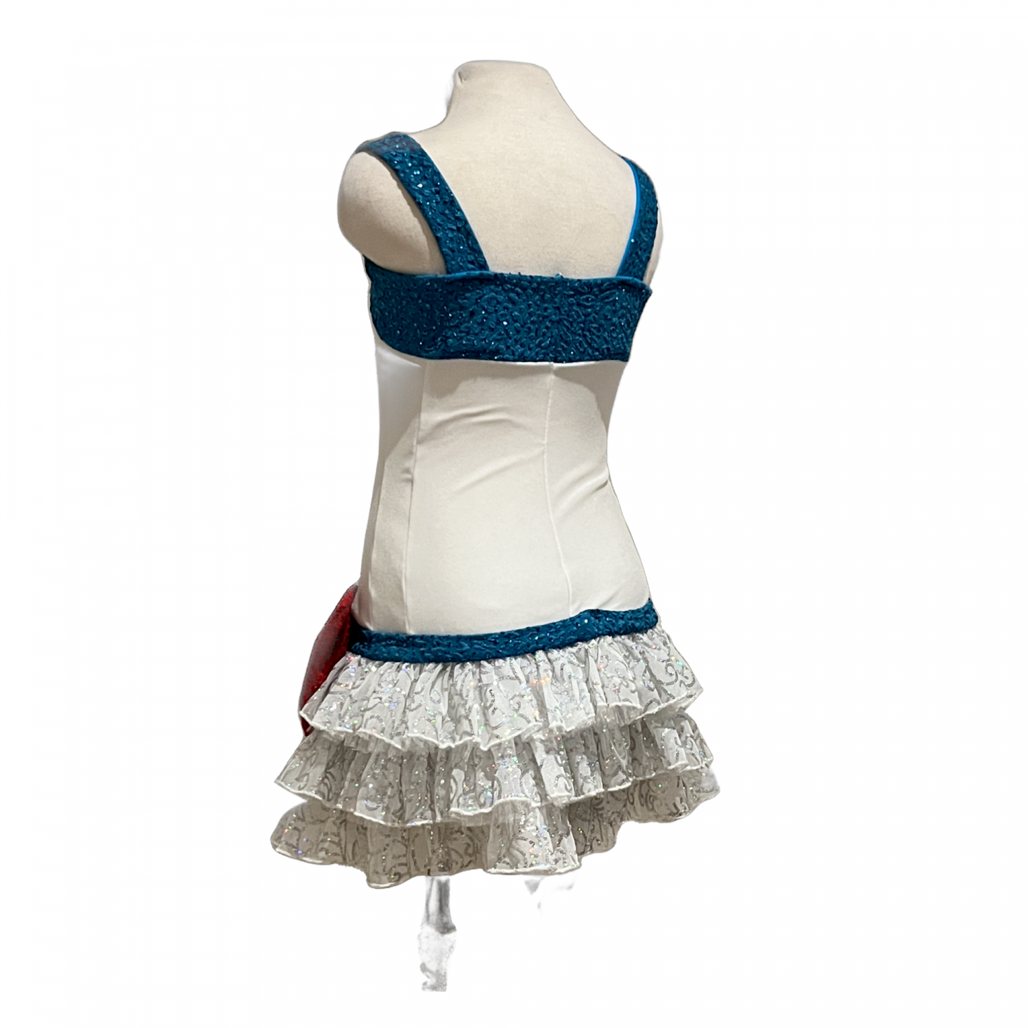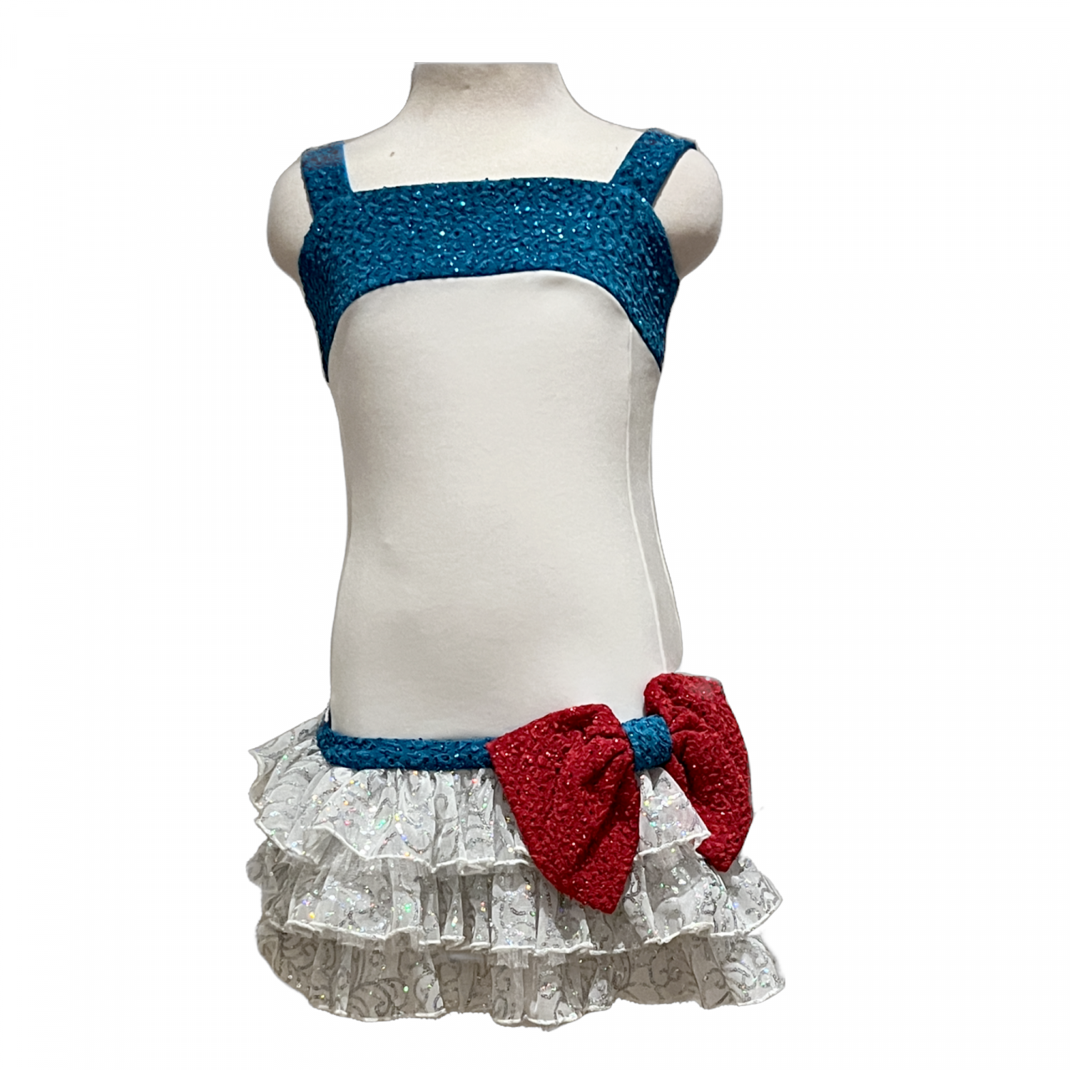 Dress is stretch sparkle velour with blue sparkle band at the top, 3 tiered skirt with sparkle, and built in panty