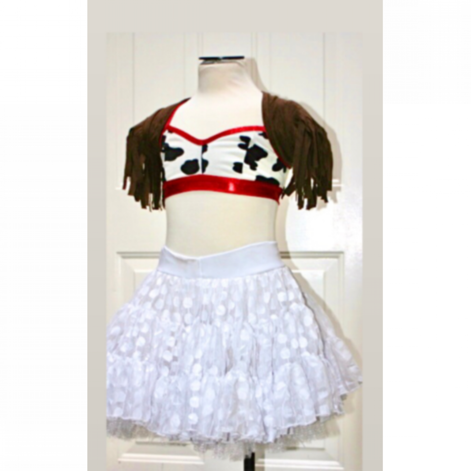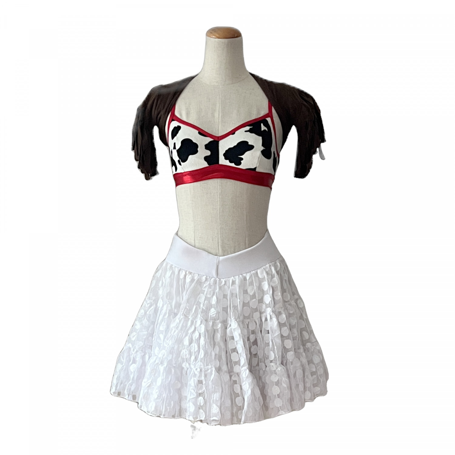 Fully lined cow print half top with red piping
