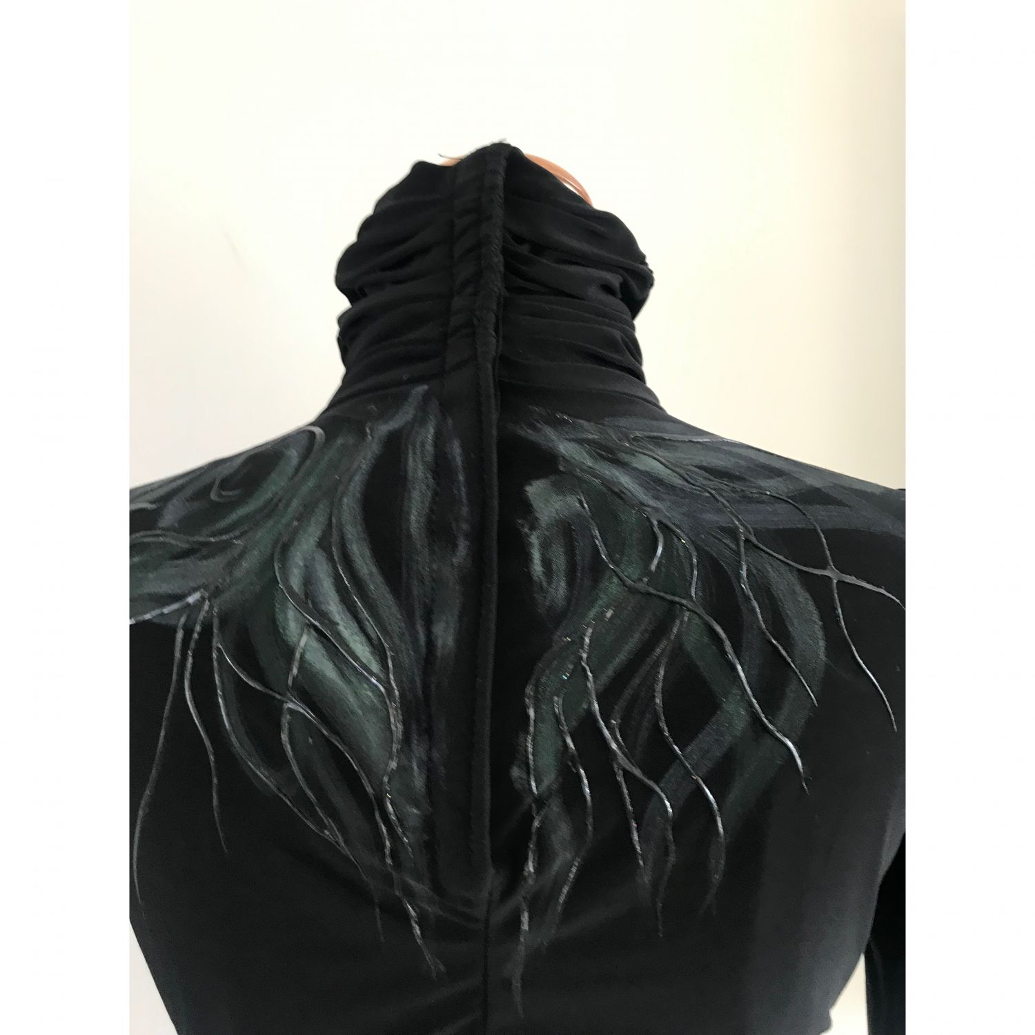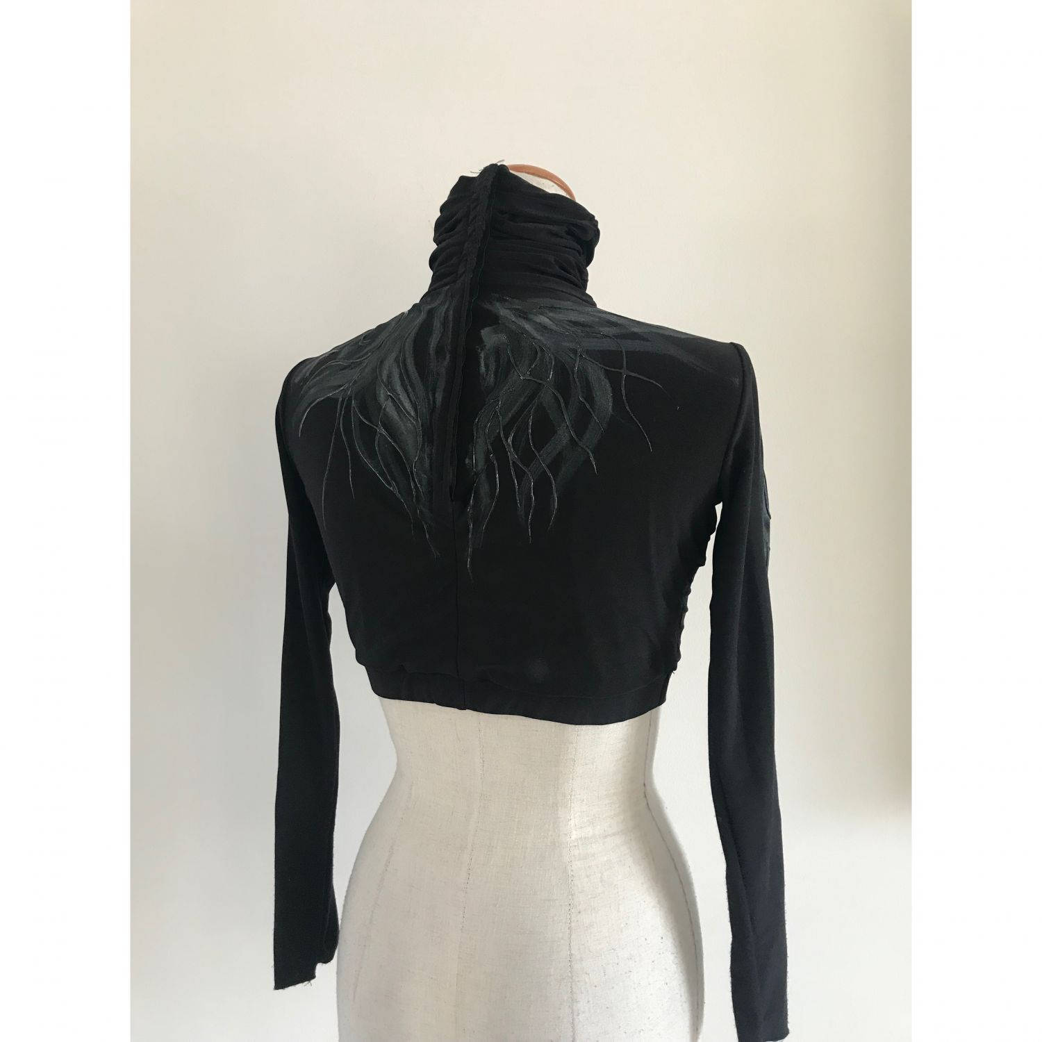 Top lined, with high neck and long sleeves, snap closure on the back