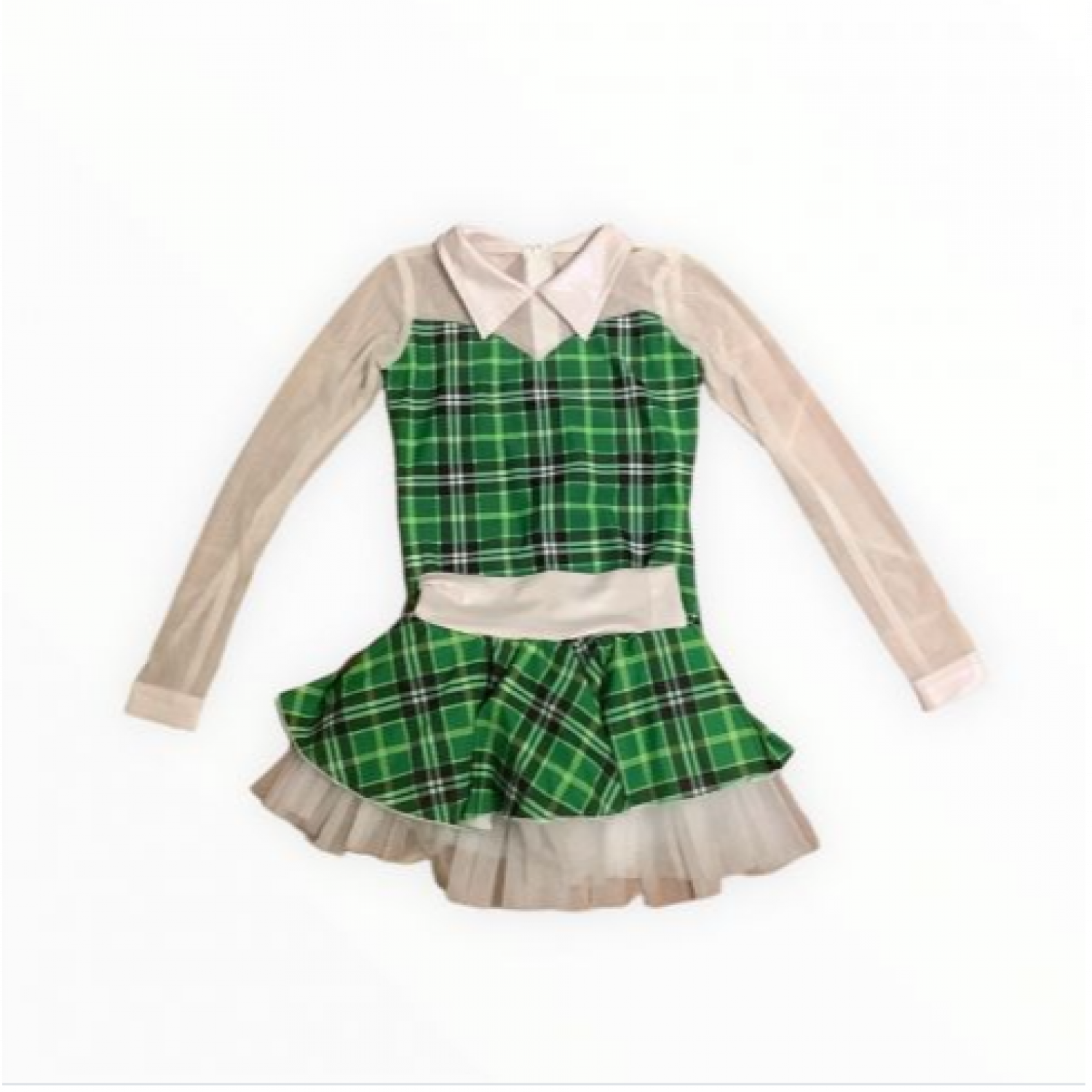 Green plaid bodysuit with white tulle sleeves and white collar. Matching skirt.