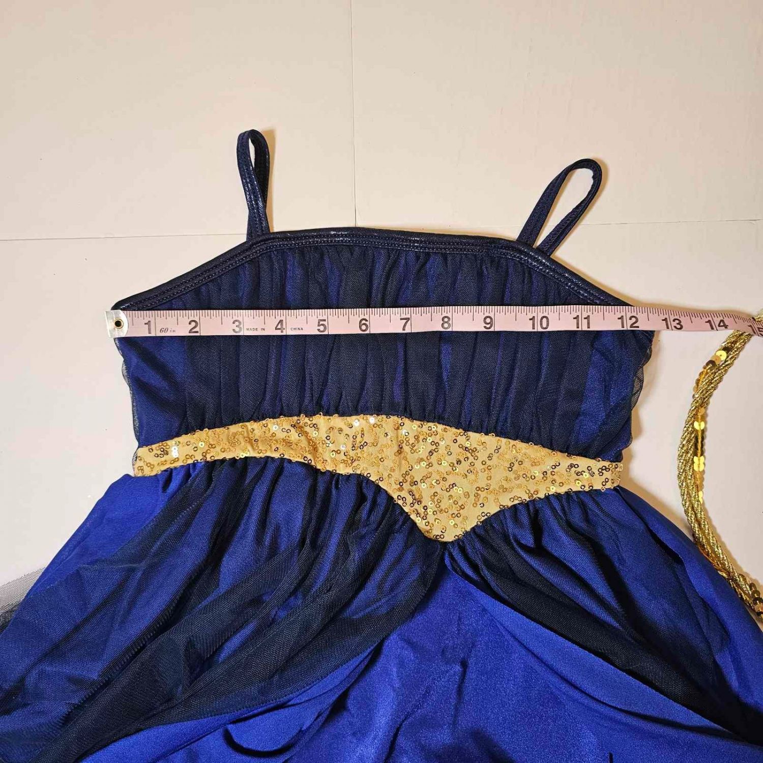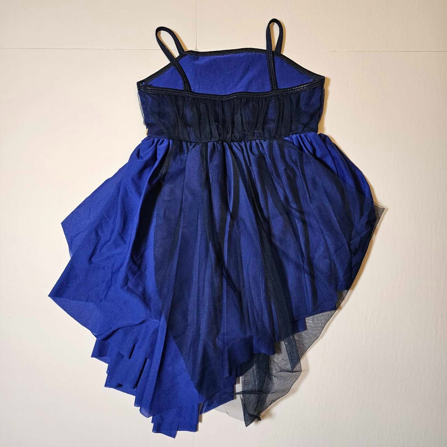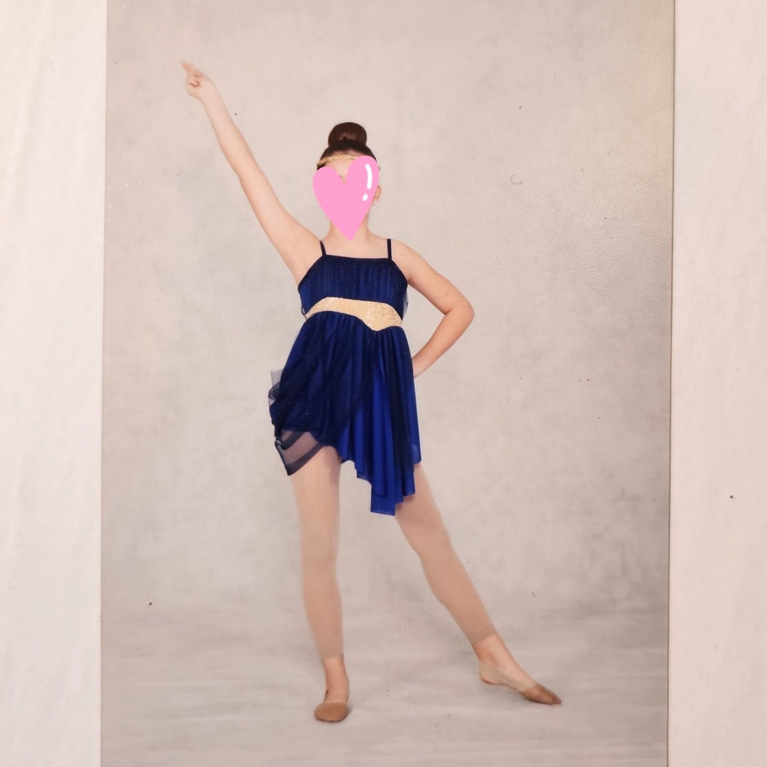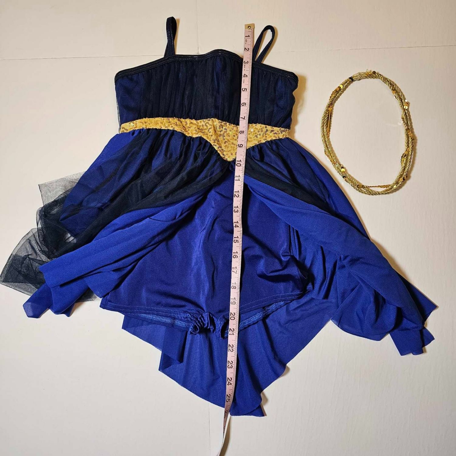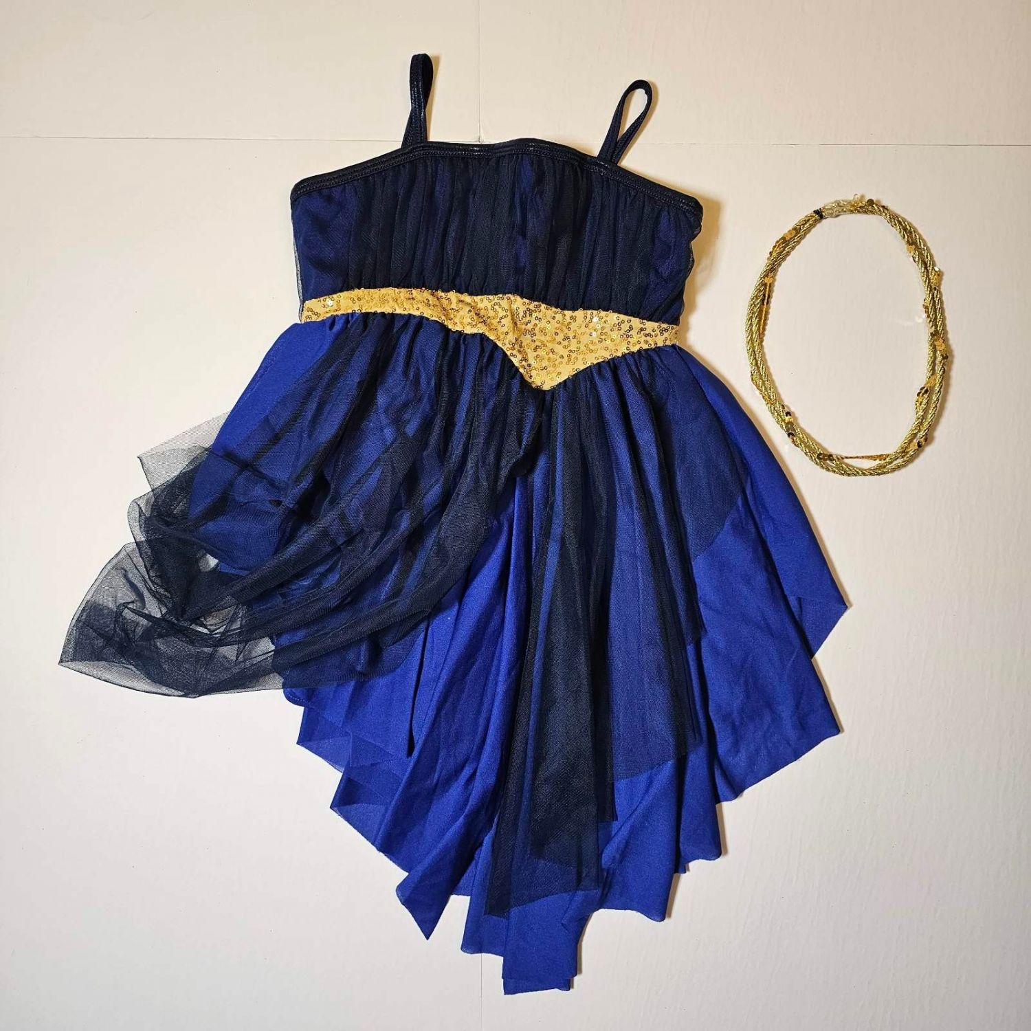 Zero to Hero - Curtain Call blue and gold 4-way stretch and tulle dress leotard dance costume for Musical Theatre in size CL - Child Large. Comes with head piece. It can be used for a lyrical routine.