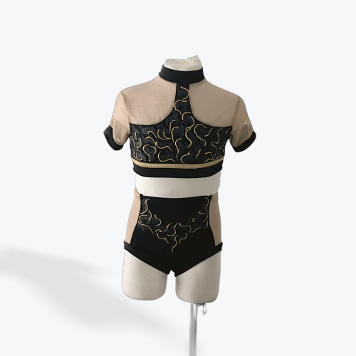 Strike a bold pose in this striking two-piece set designed for power and precision. Featuring a high-neck crop top with sheer mesh sleeves and metallic gold embroidery, paired with matching high-waisted shorts with nude mesh insets for contrast and movement.