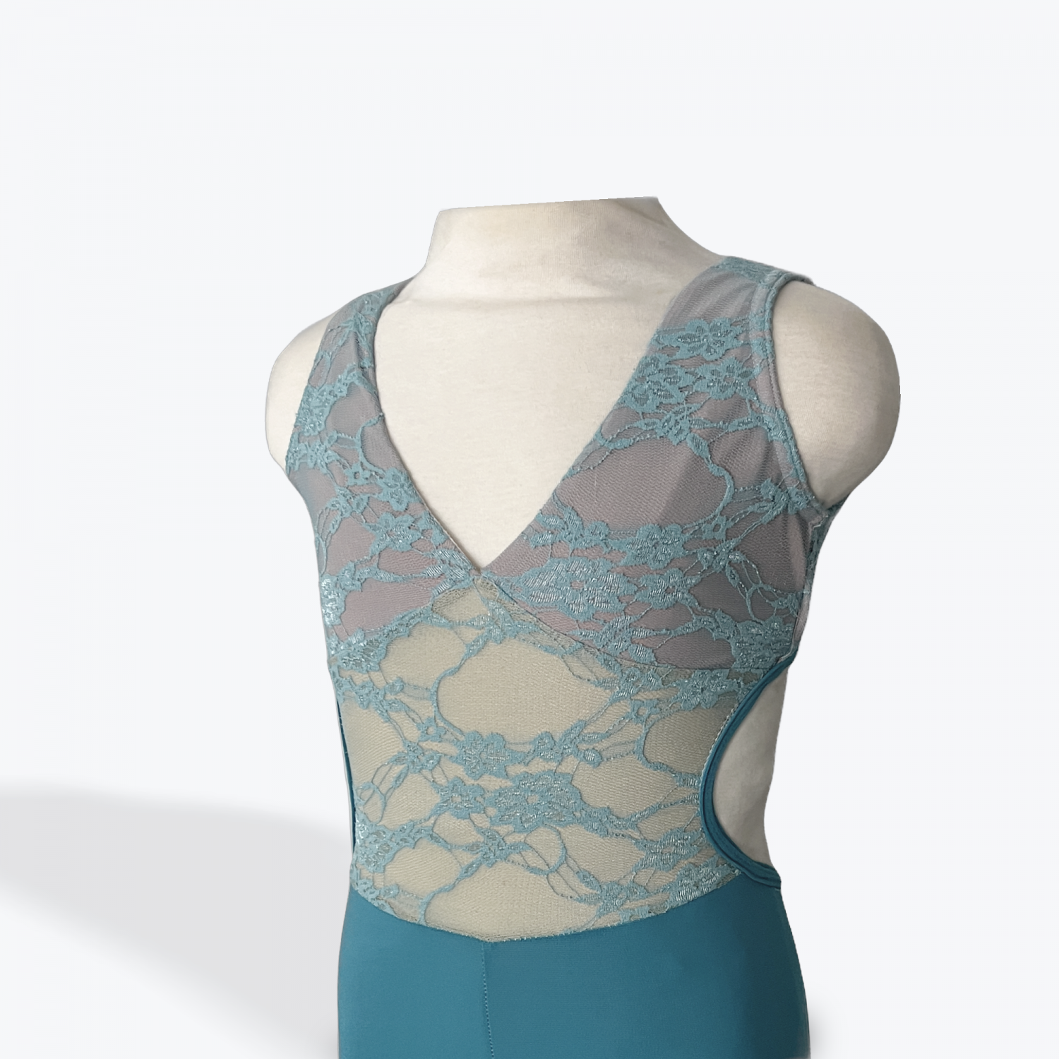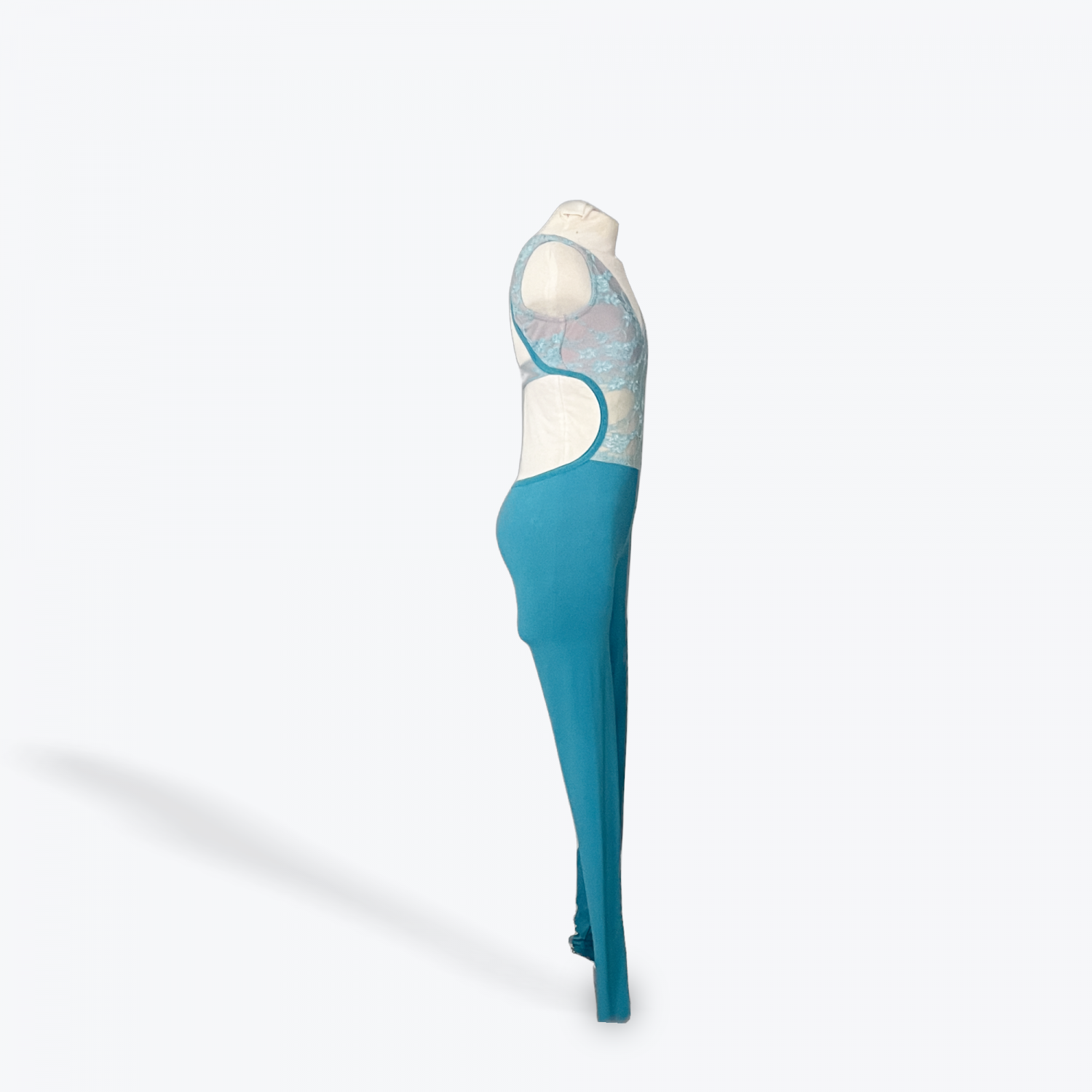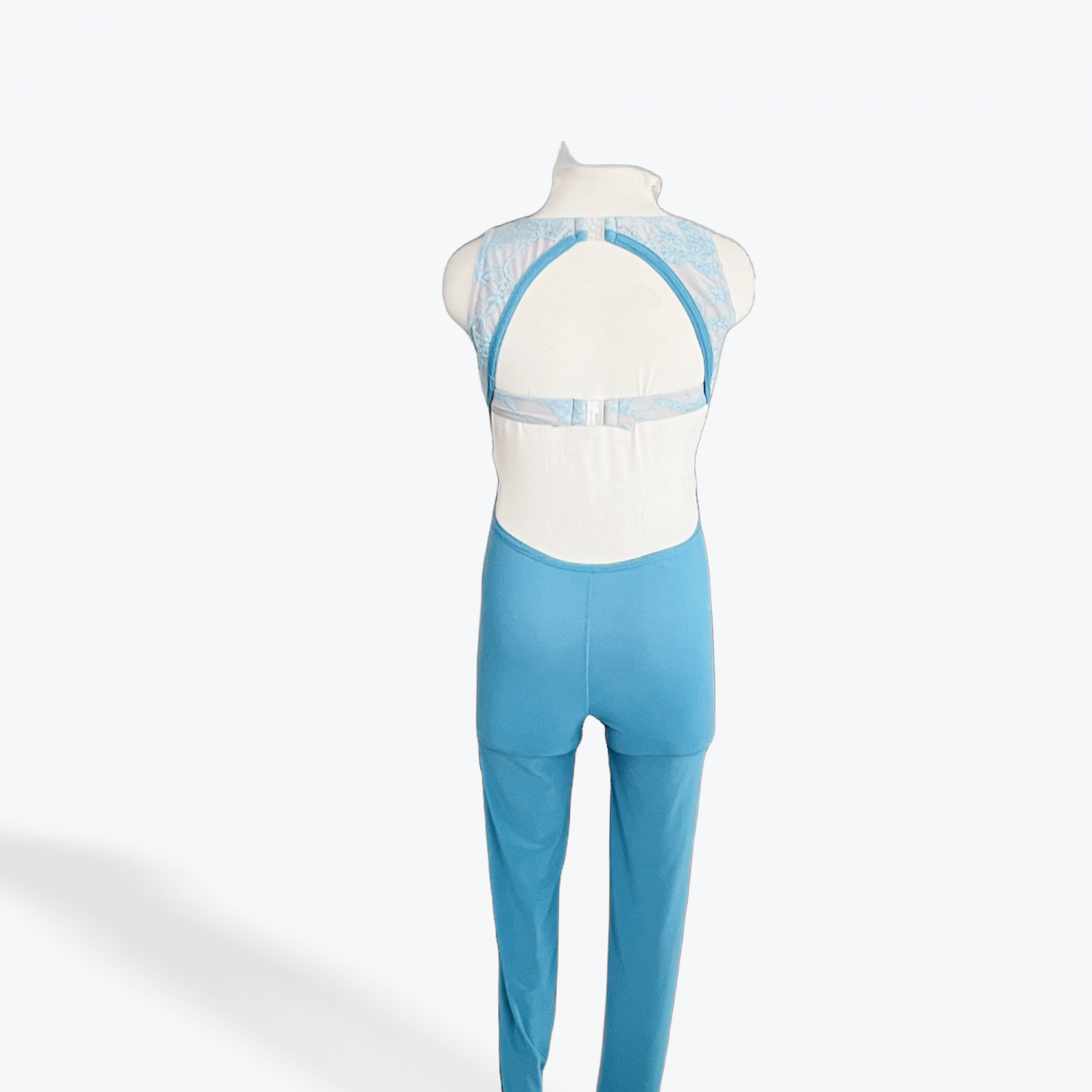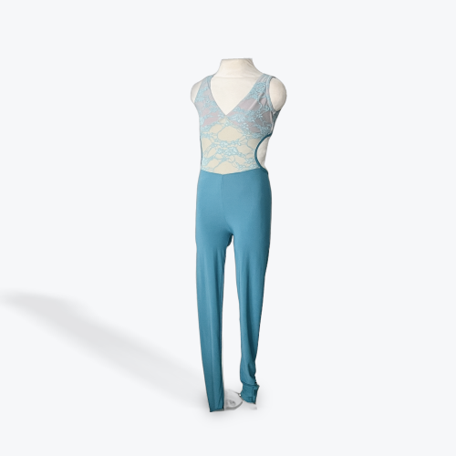 Delicate yet powerful, this light blue jumpsuit features a soft lace overlay on the bodice with a flattering V-neckline and nude underlay for a seamless stage look. The open back with clasp closure adds elegance, while the sleek full-length pants elongate lines and create beautiful flow in movement. Perfect for acro, open contemporary, or modern pieces.