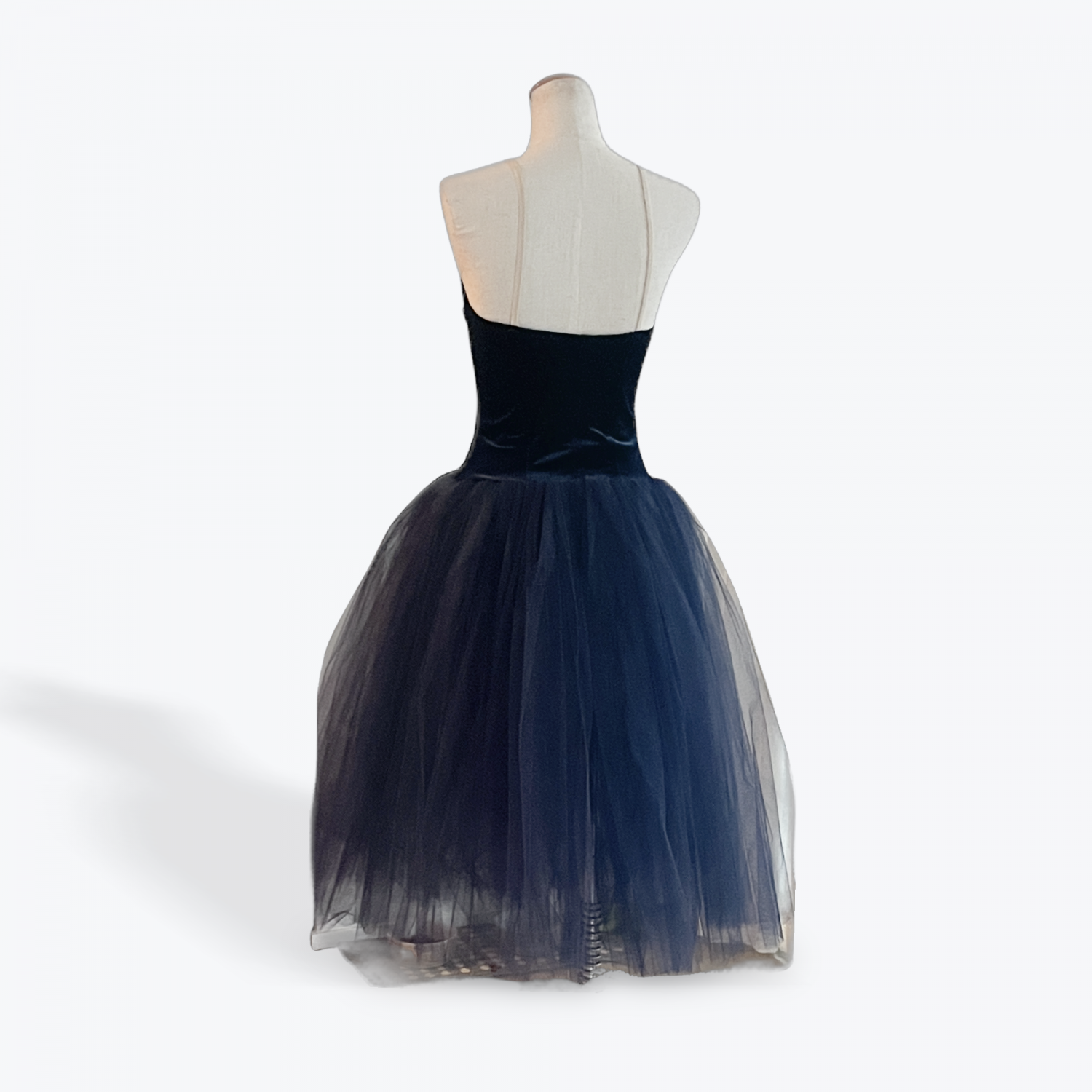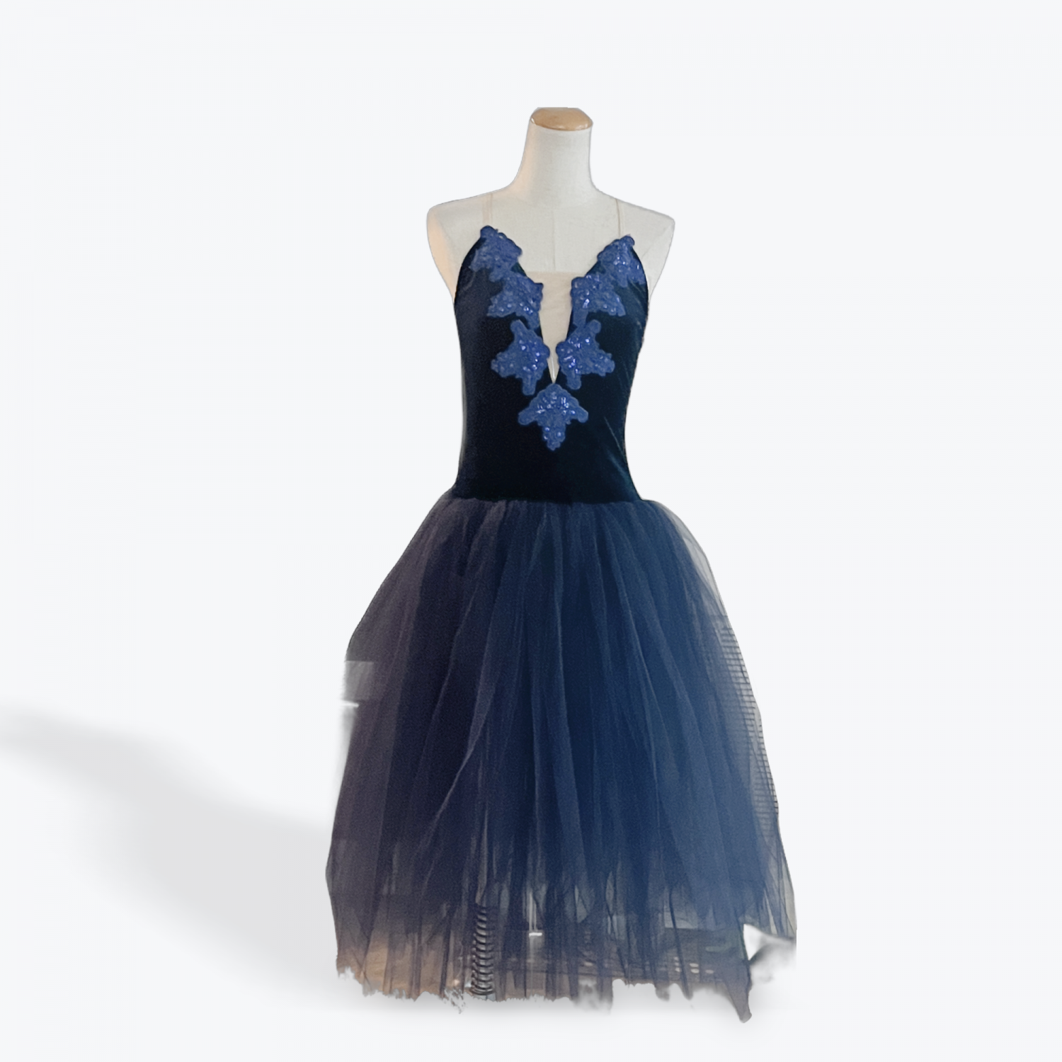 A striking ballet-inspired costume in deep midnight blue, designed for elegance and drama under stage lights. The velvet bodice features a plunging V-neckline adorned with intricate sequin appliqués that shimmer with every movement. Soft tulle layers create a romantic, flowing skirt that moves beautifully in lyrical or ballet routines. Double thin straps add a delicate finish to the open back, balancing sophistication with strength. Perfect for performances that call for depth, grace, and quiet power.