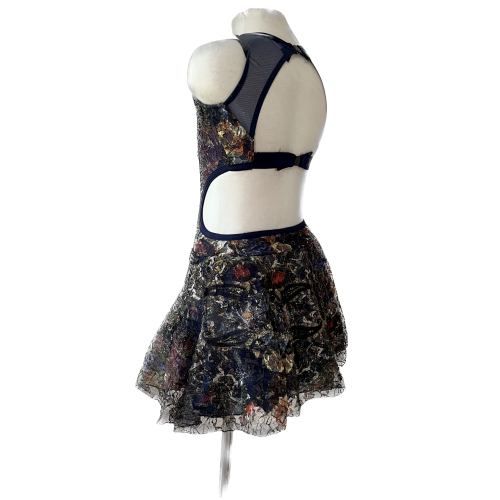 Beautiful dance dress with built in bodysuit, open back, layer of tulle under sheer lace skirt