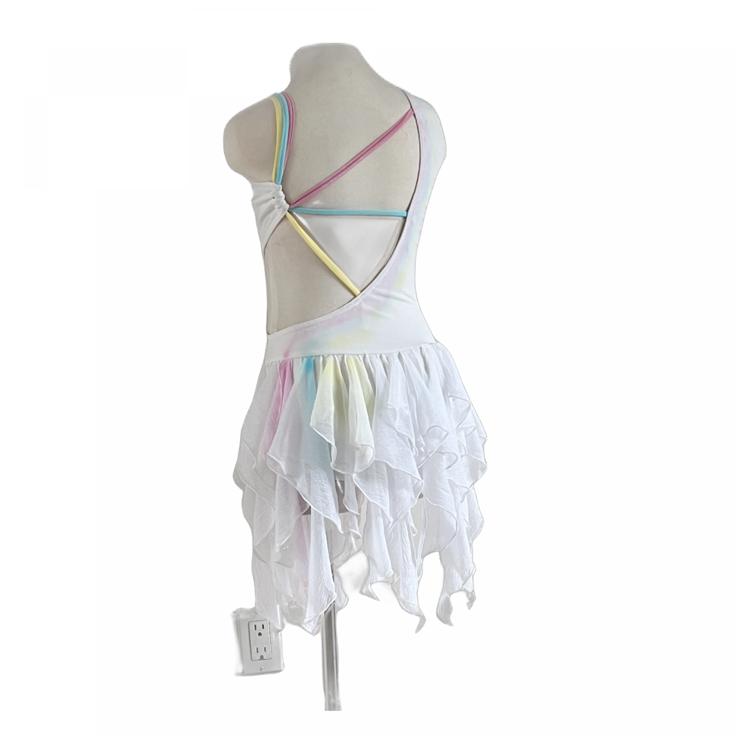 Air brushed white bodysuit fully lined open back, with attached chiffon skirt