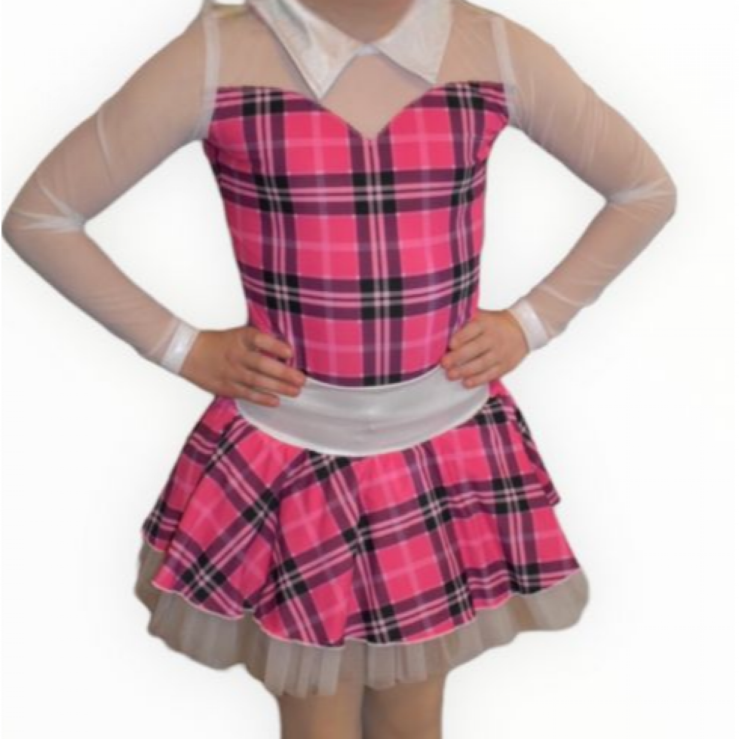 Fun pink plaid bodysuit with white tulle sleeves and white collar. Matching skirt.