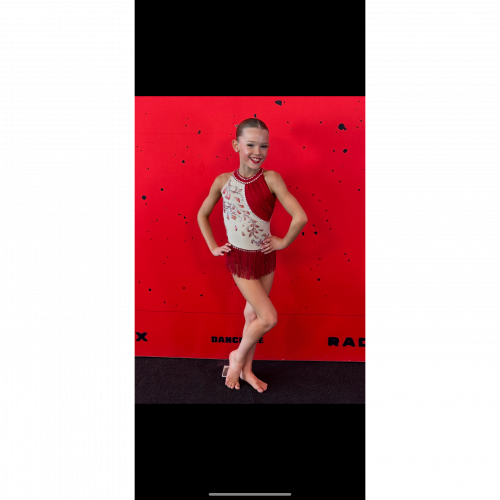 Turn heads on stage in this stunning red and nude solo costume. The asymmetrical halter design features sparkling rhinestone embellishments with swirling floral patterns across the bodice. Finished with bold red fringe that moves effortlessly with every step, this costume is perfect for jazz, musical theatre, or open routines. Comfortable fit with a secure neckline for confident performance.