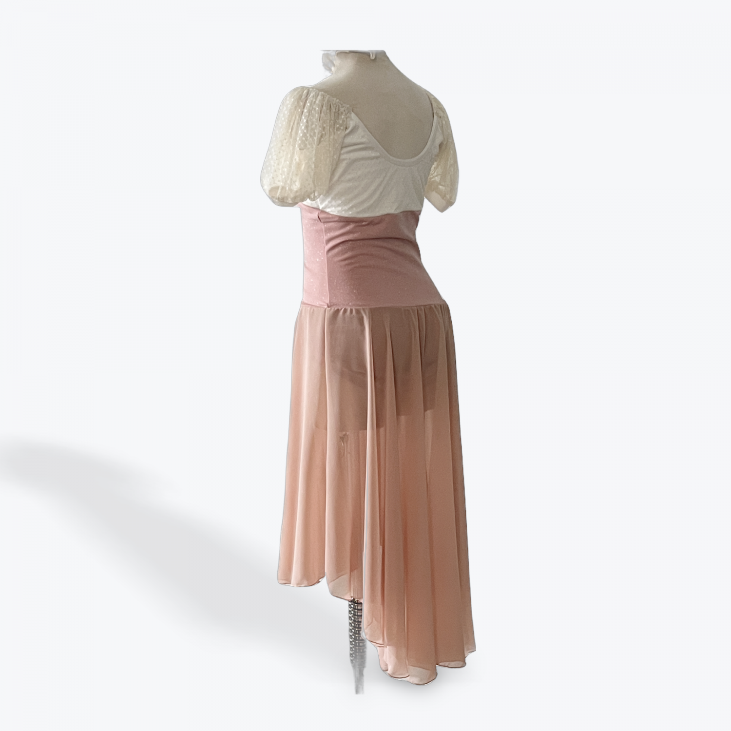 This beautifully detailed costume is a dream for lyrical, ballet, or character pieces. The soft cream puff-sleeve top pairs effortlessly with a dusty rose corset-style bodice, featuring lace-up detail and hand painted design. A flowing chiffon skirt completes the look, offering gentle movement and a fairytale-inspired silhouette.