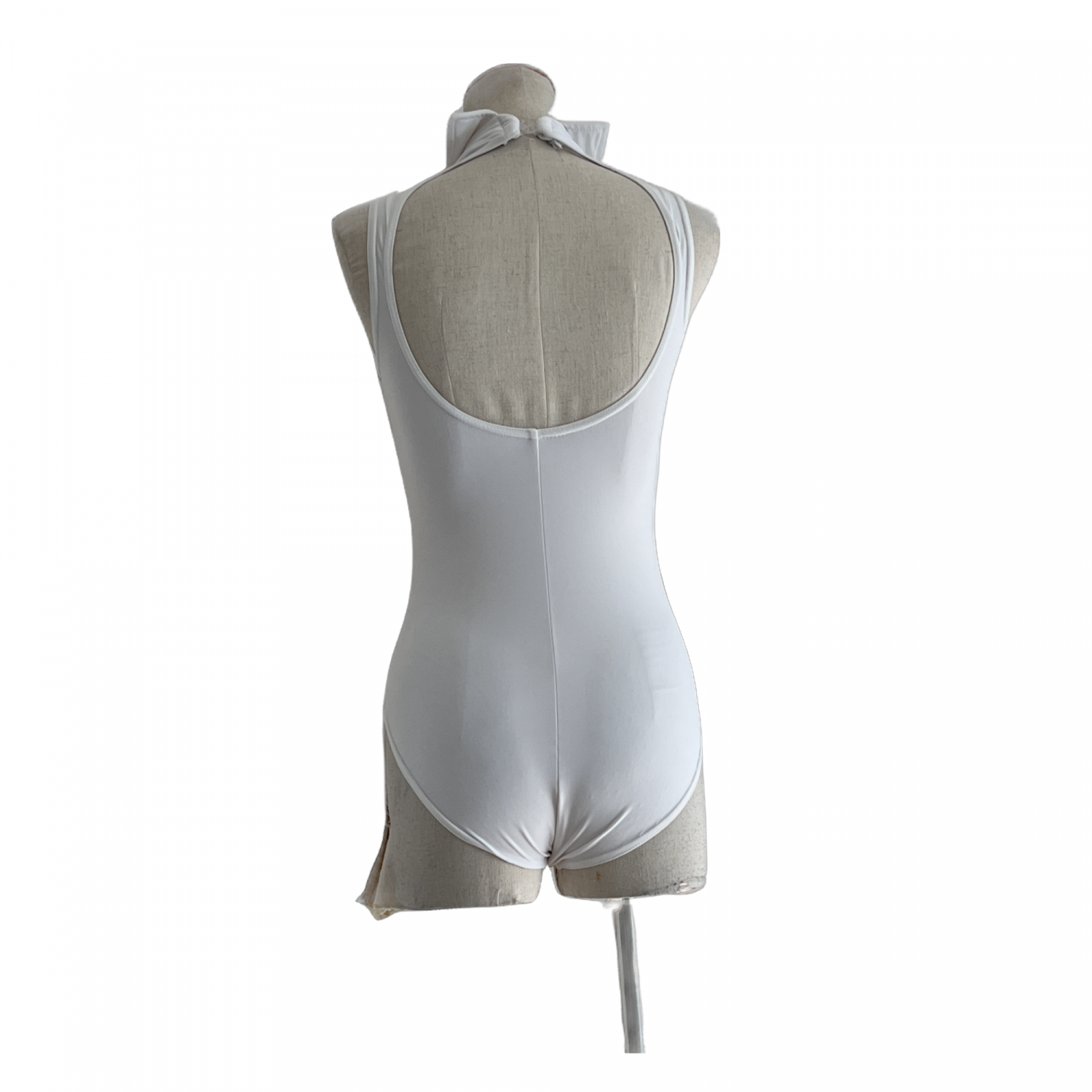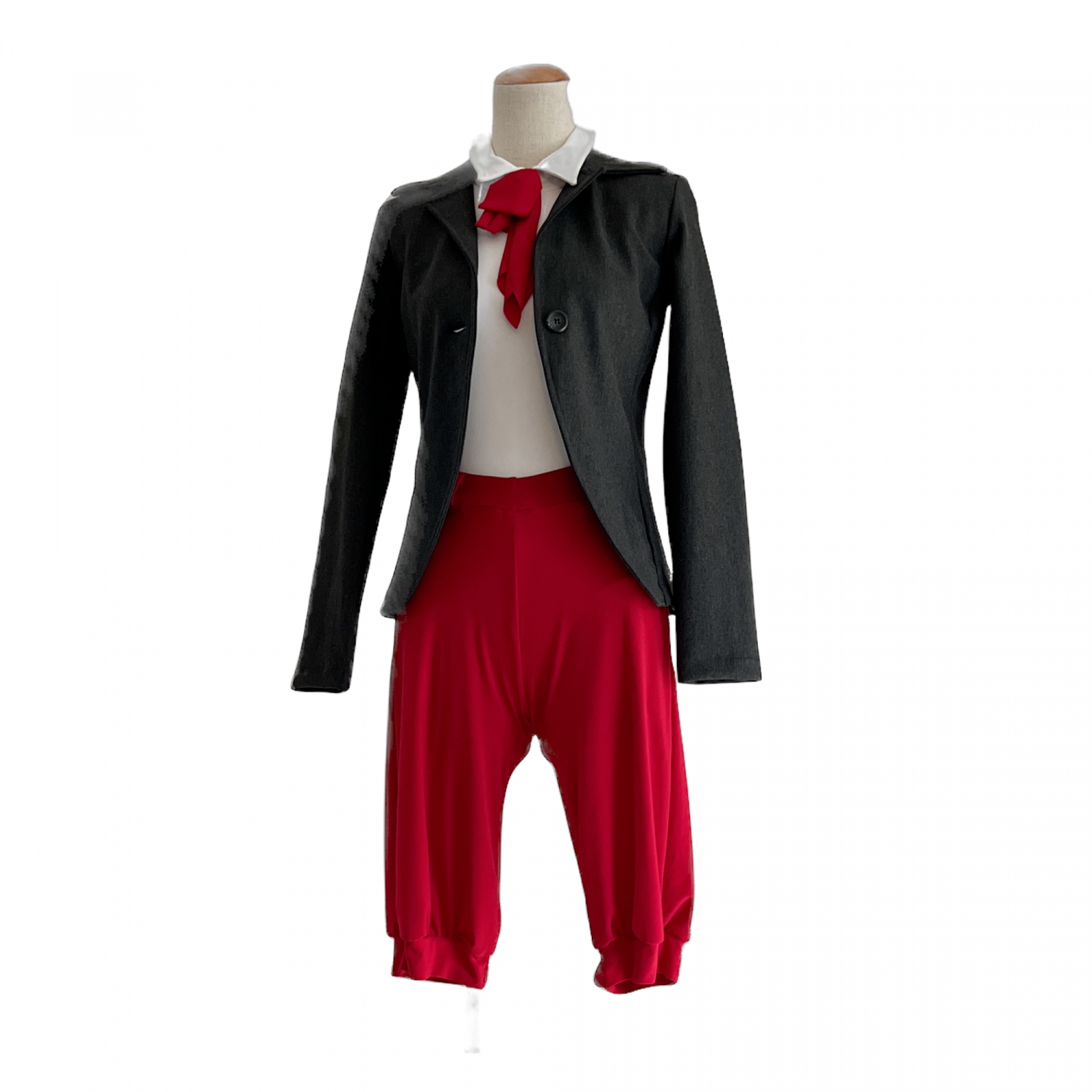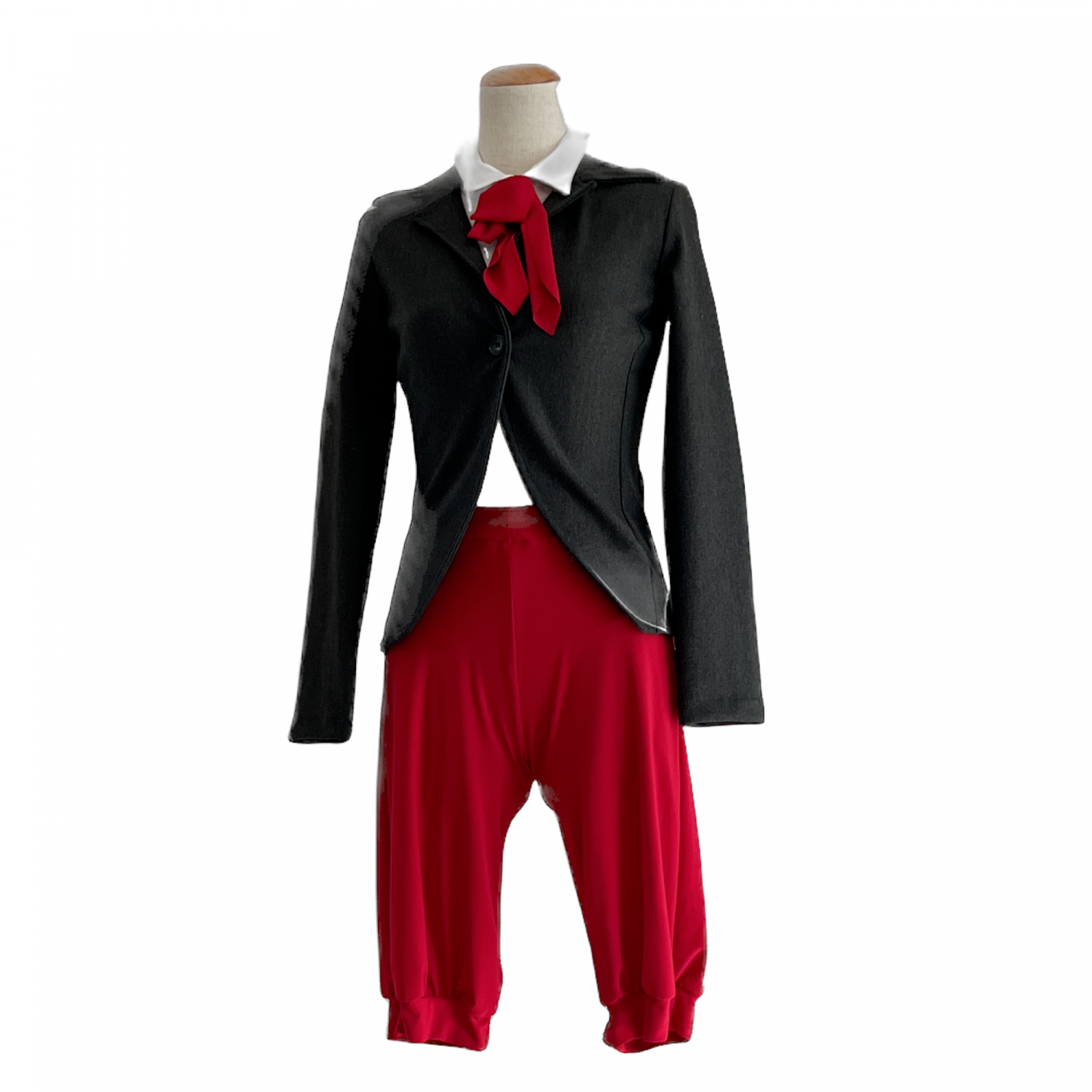 3 pieces, full bodysuit with open back, thick lycra jacket made for dance with slight stretch but keeps its shape, pull on short pants