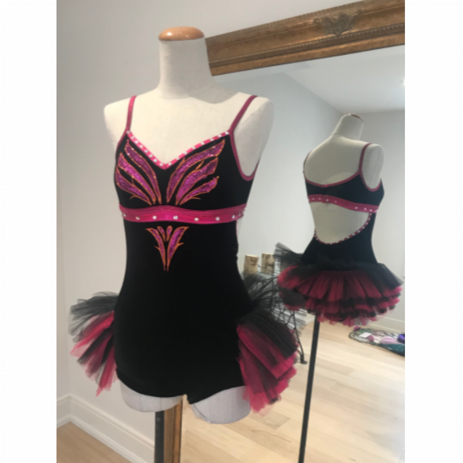 Black velour bodysuit, top hand painted with crystals.