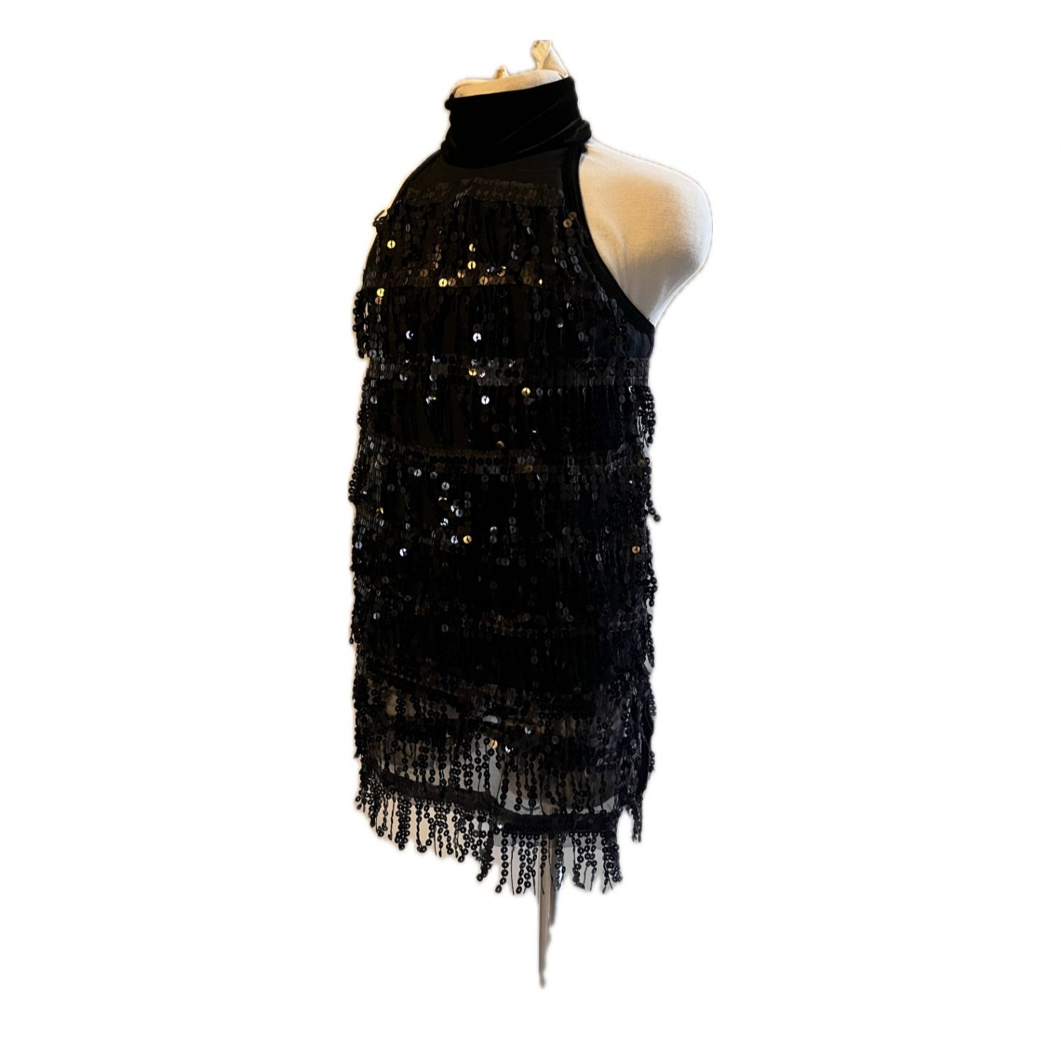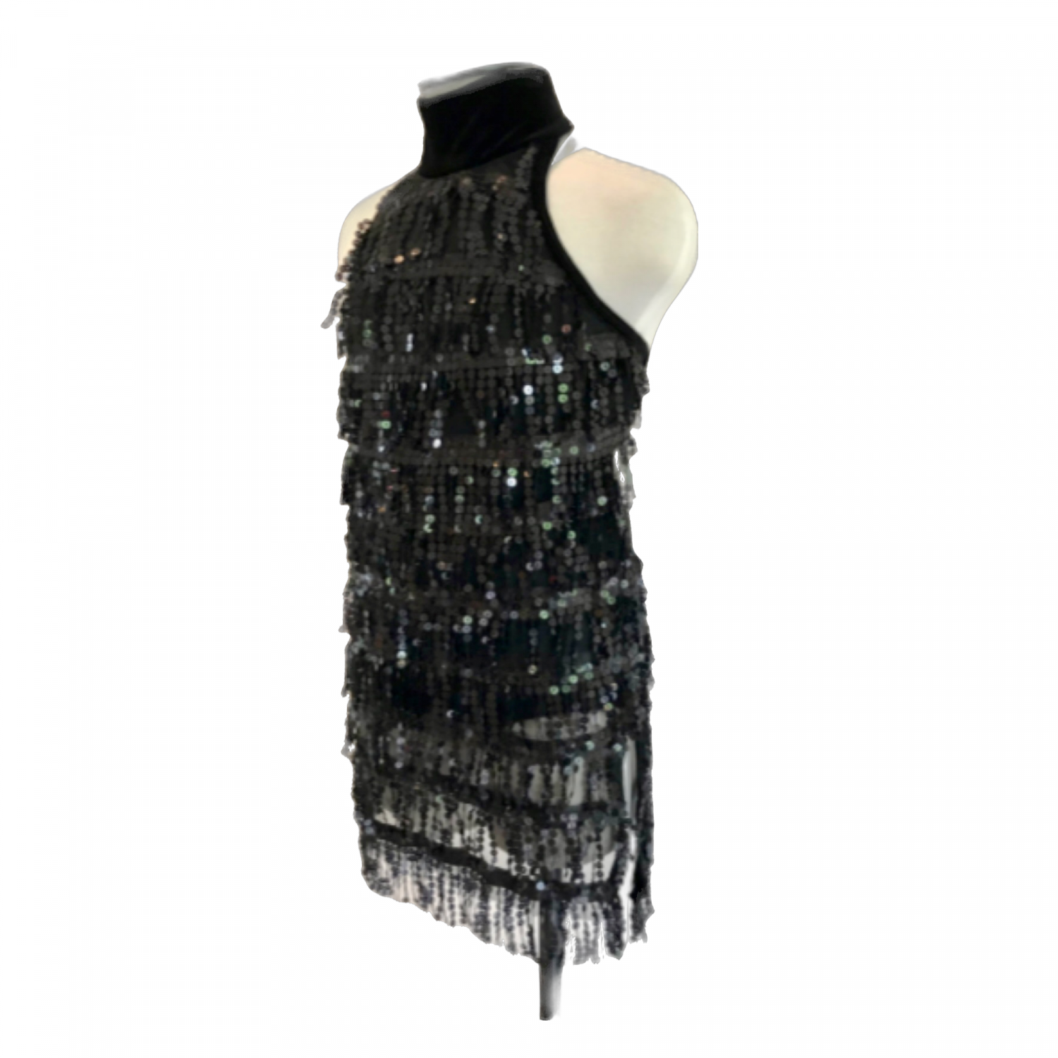 Covered with black sheer and sewn on black sparkle fringe with slight sides.