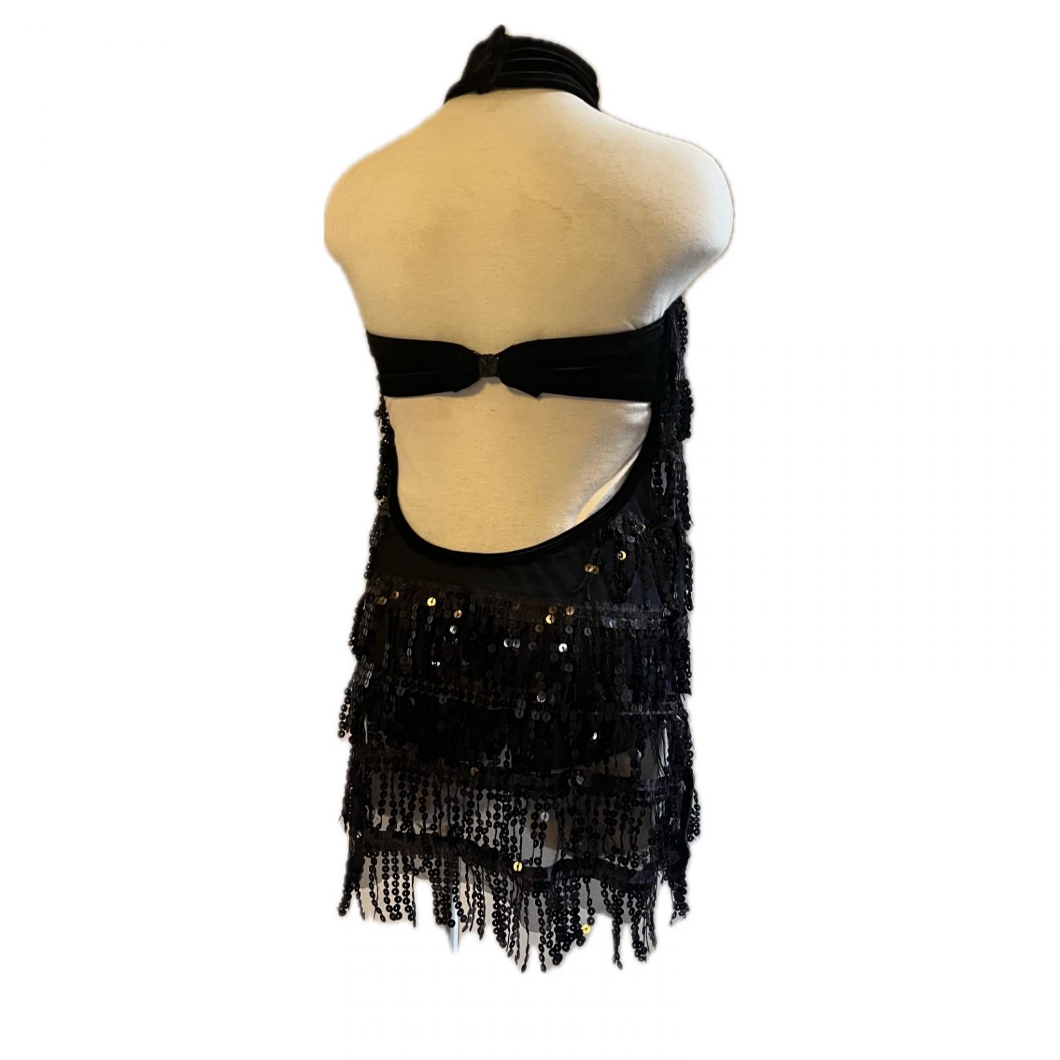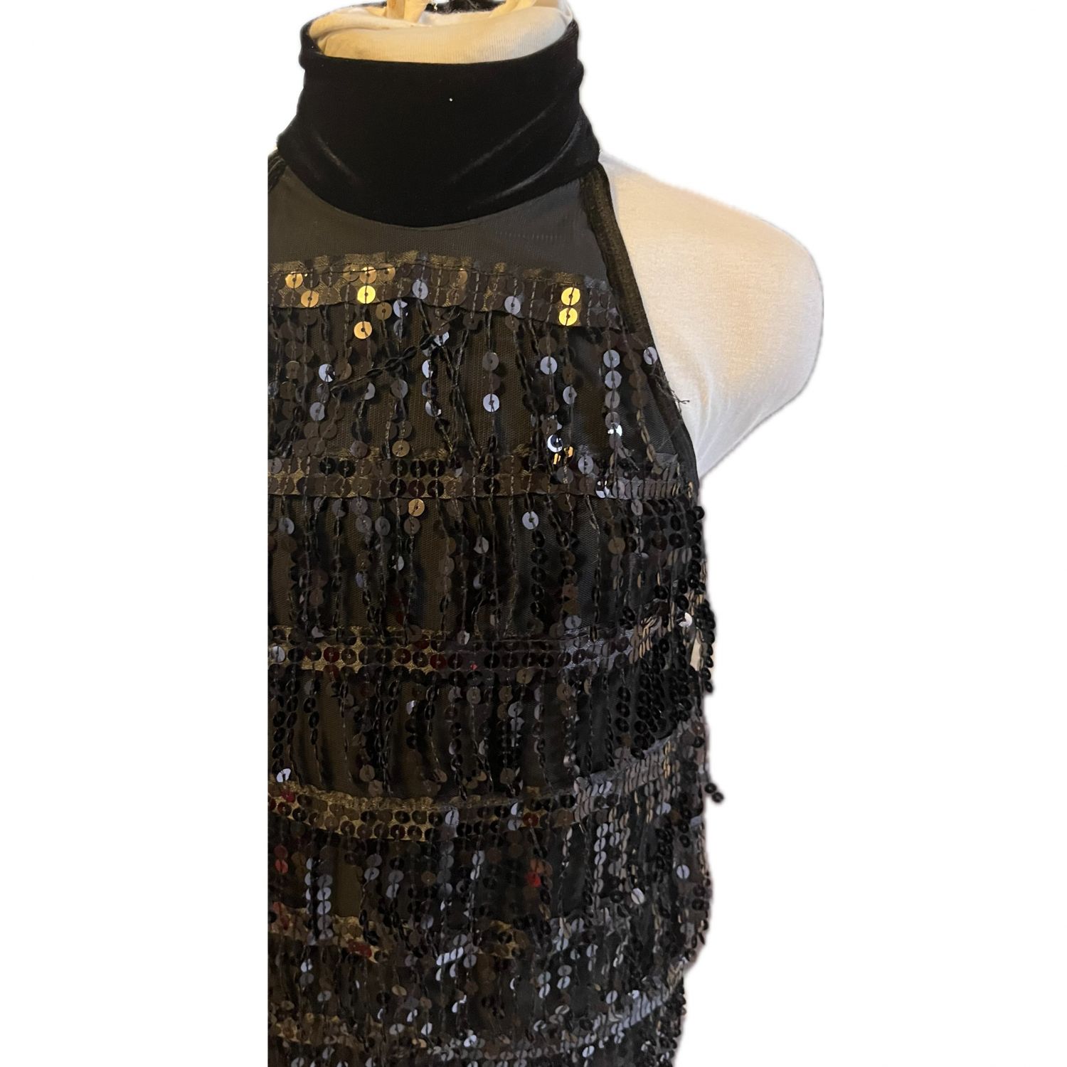 Base dress is black velvet with high neck, closure at neck and back