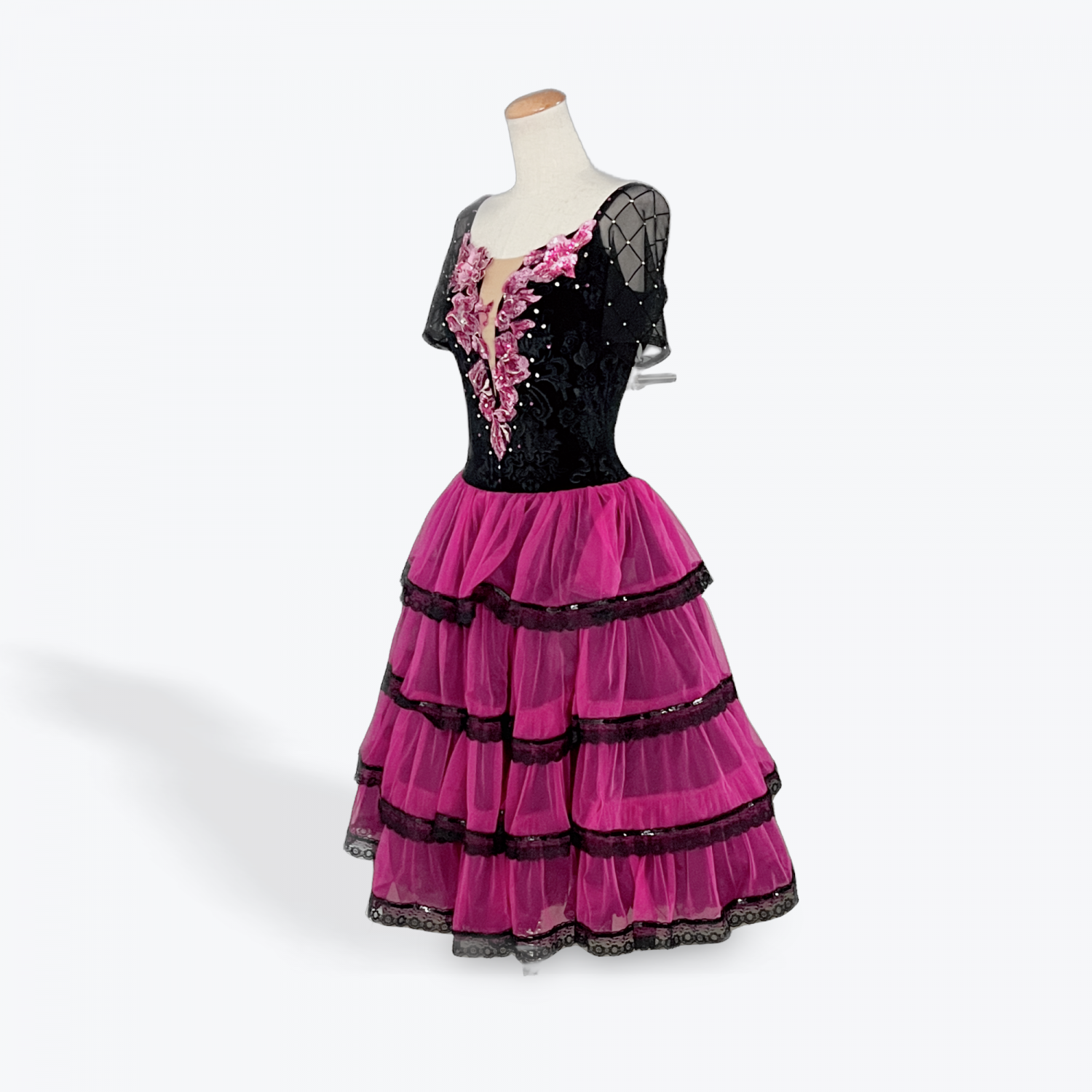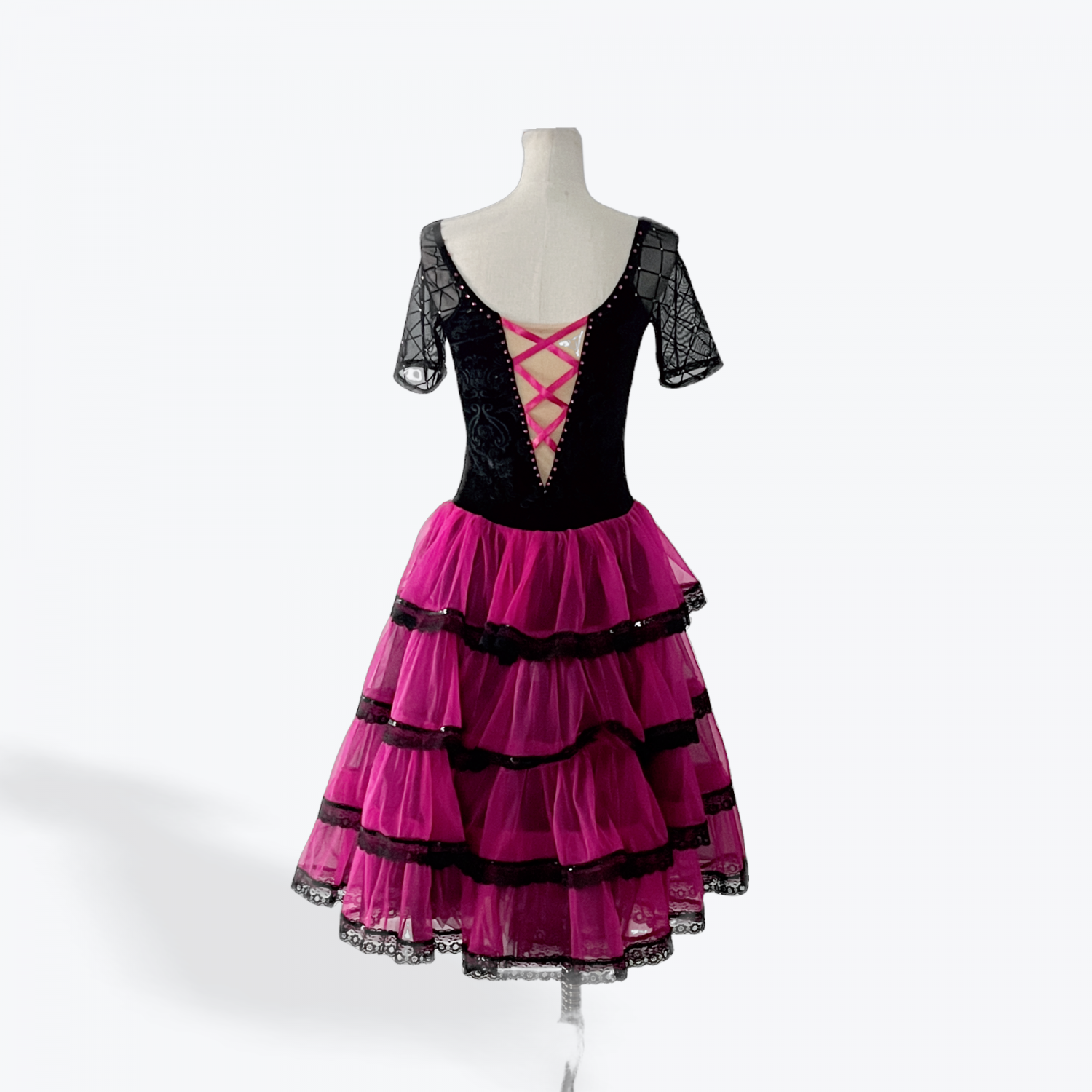 Step into elegance with this one-of-a-kind Spanish inspired costume. The black velvet bodice is adorned with pink floral appliqué and rhinestone accents, paired with sheer mesh sleeves for added detail. A voluminous fuchsia layered tulle skirt, trimmed with lace, completes the dramatic look.