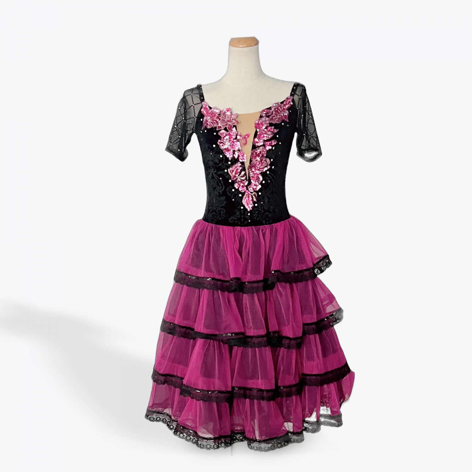 Step into elegance with this one-of-a-kind Spanish inspired costume. The black velvet bodice is adorned with pink floral appliqué and rhinestone accents, paired with sheer mesh sleeves for added detail. A voluminous fuchsia layered tulle skirt, trimmed with lace, completes the dramatic look.