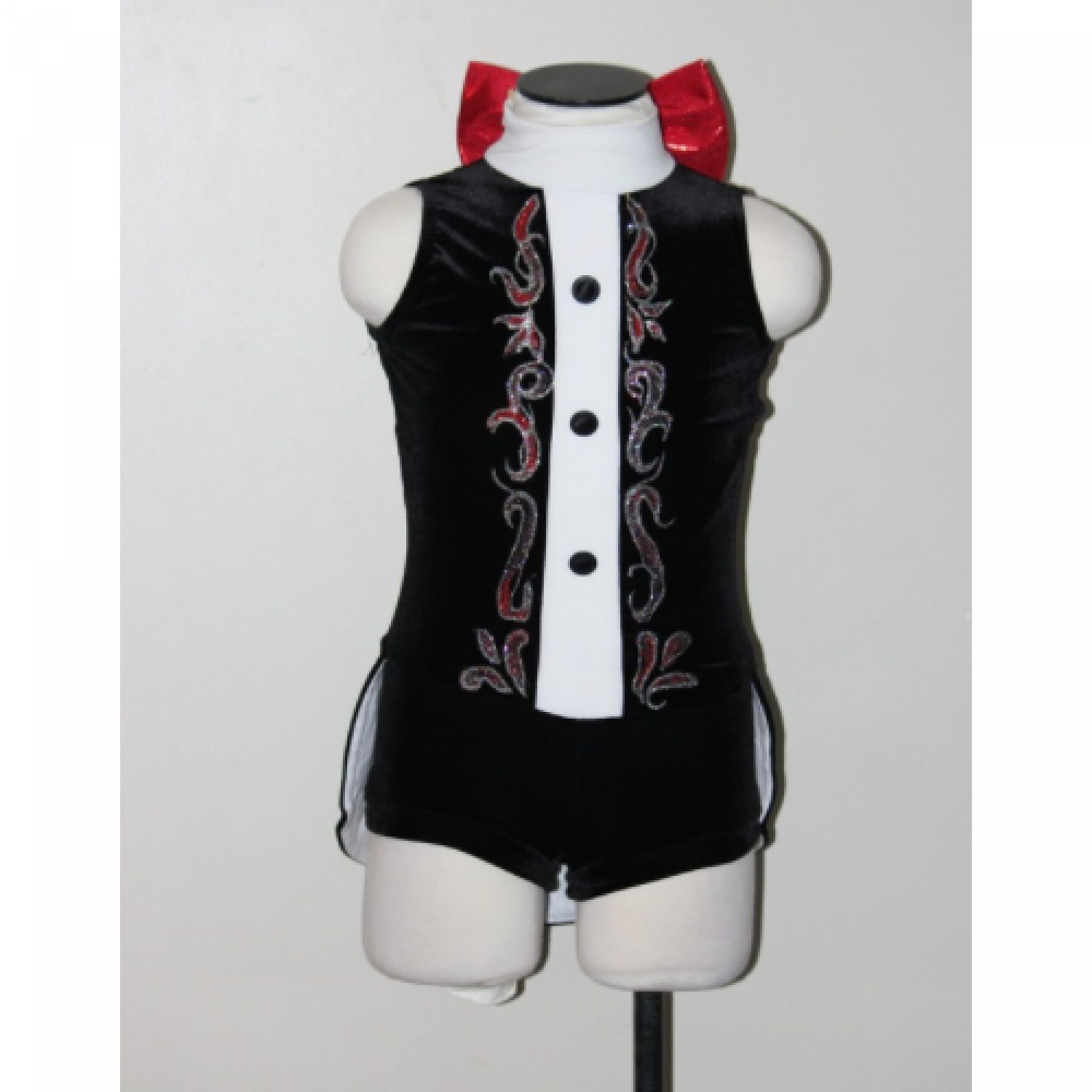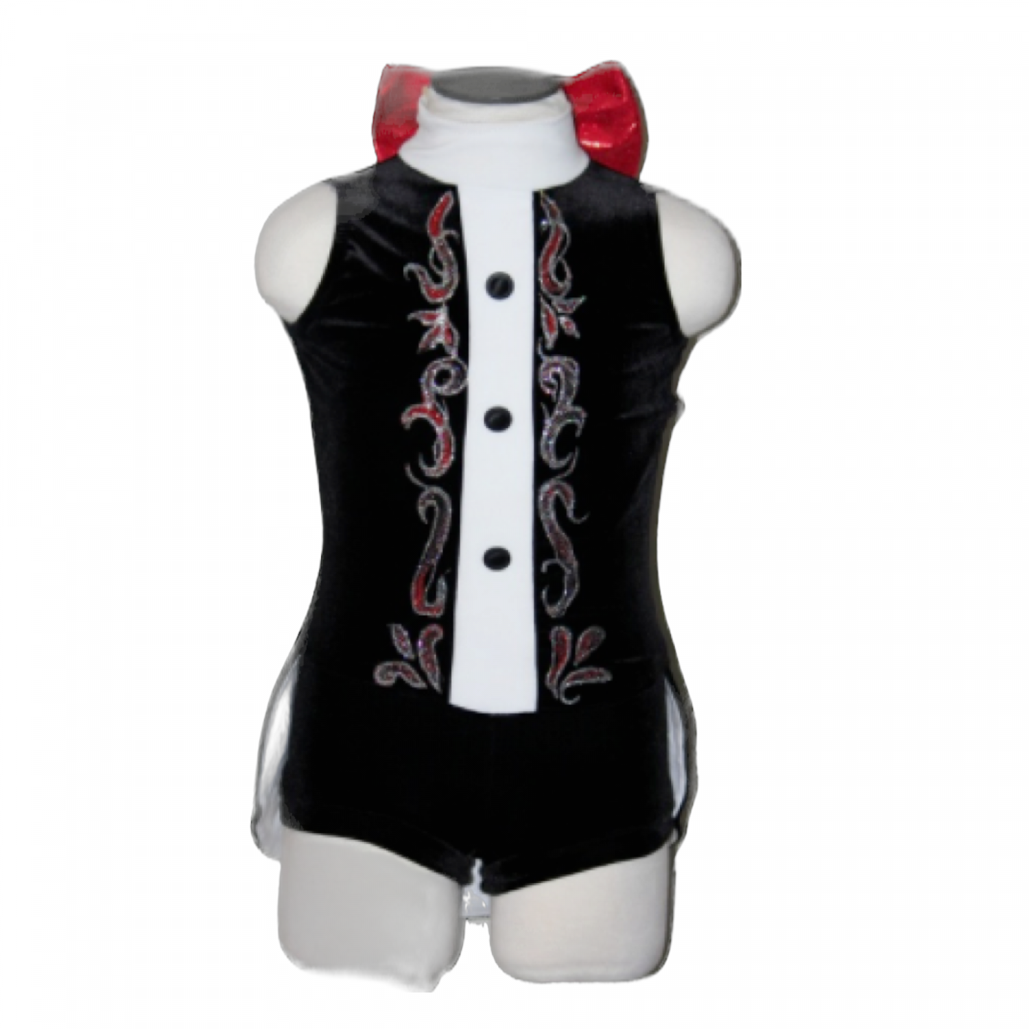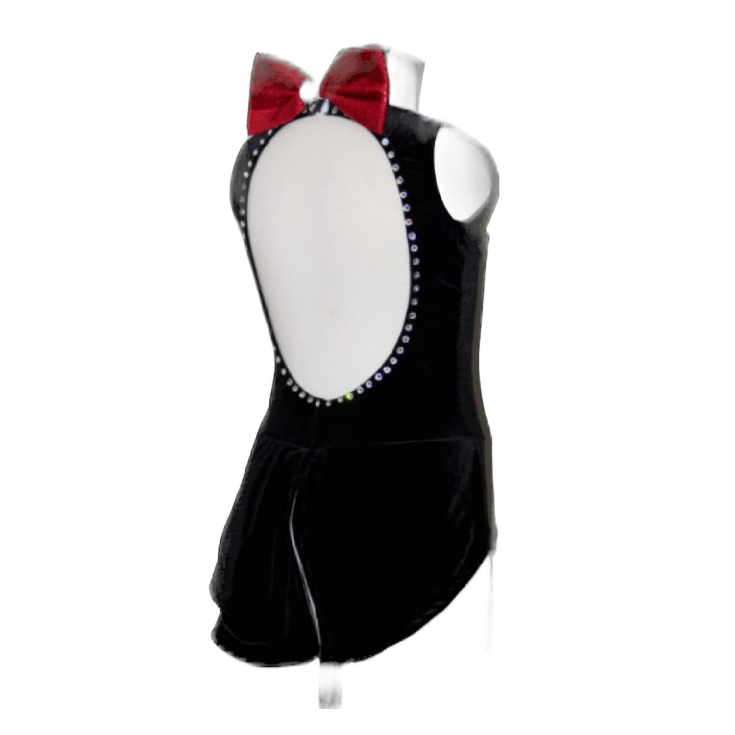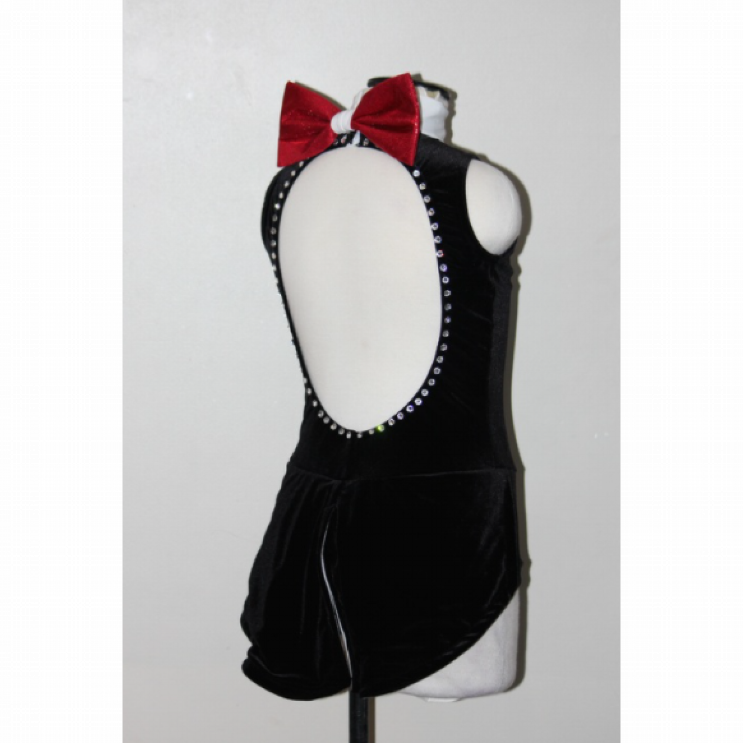 Fully lined velour bodysuit with hand painted front, high neck with closure and bow on back, open back edged with rhinestones, attached skirt with white lining.