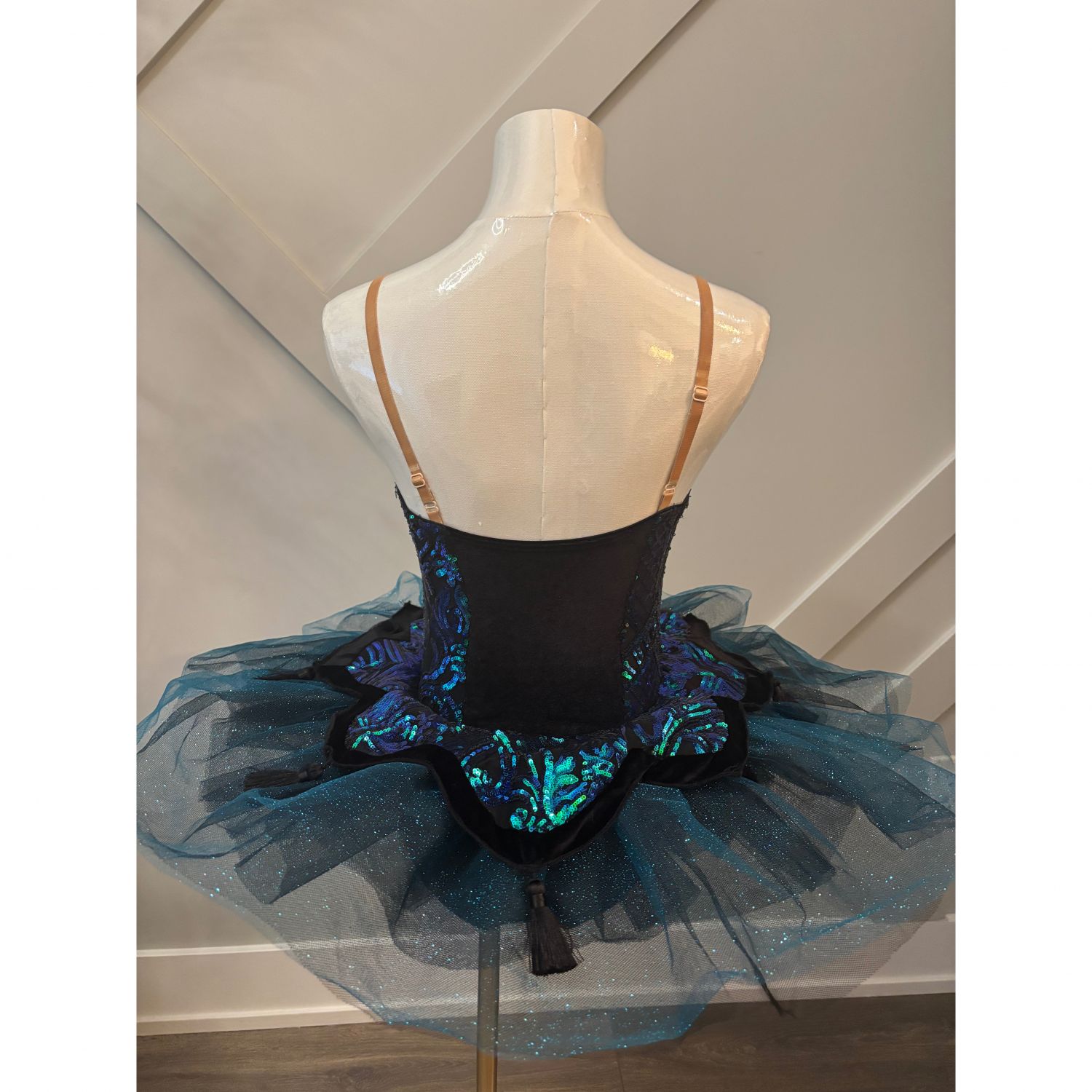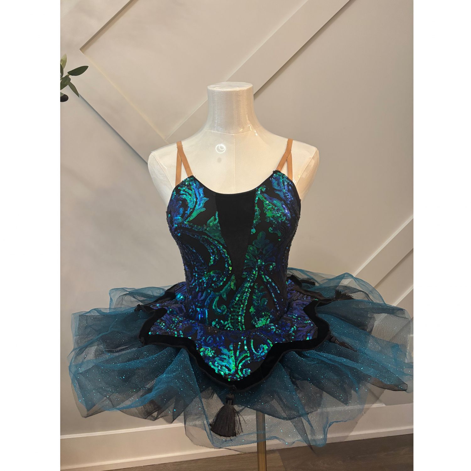A stunning tutu that sparkles with intricate sequin embellishments, playful tassel accents, and dazzling holographic details. Soft velour textures add a touch of elegance and comfort, while the entire look comes to life under stage lights—perfect for a truly unforgettable performance