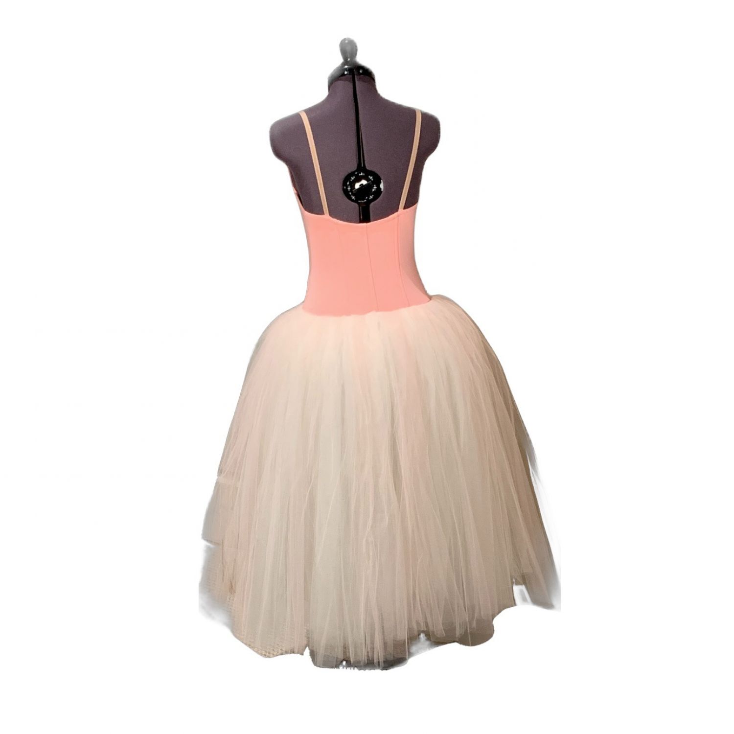 Adult L - Romantic ballet dress with soft pink top, white and pink long romantic tutu, and gold appliqués.  Dancer is 5'6".