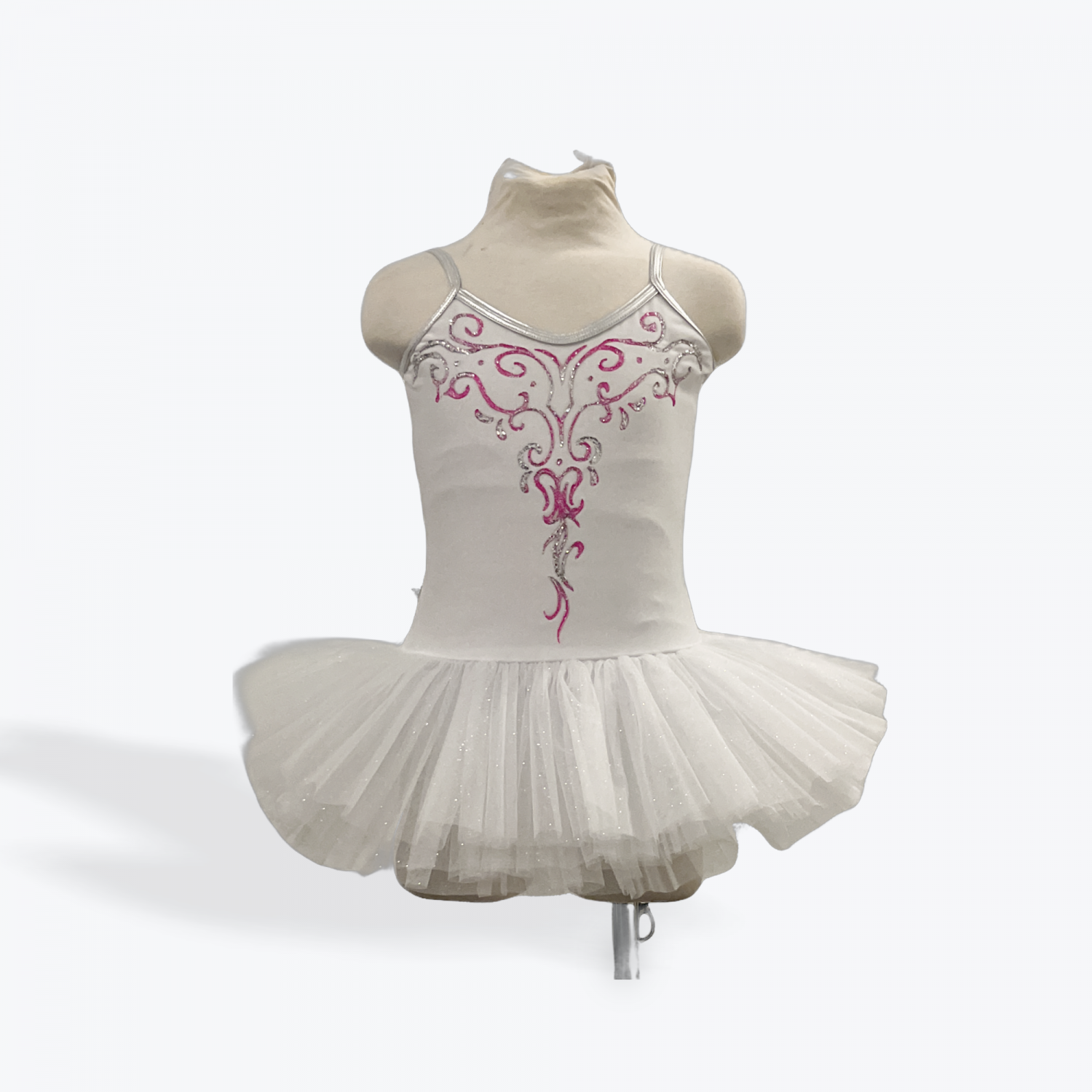 Classic elegance meets a pop of color in this beautiful ballet-style tutu. Designed with silver straps and a soft white bodice, this costume features a striking pink and silver scroll motif and a glittery layered tulle skirt. Perfect for ballet, lyrical, or fairy-themed numbers. Gently used and stage-ready for its next performance!